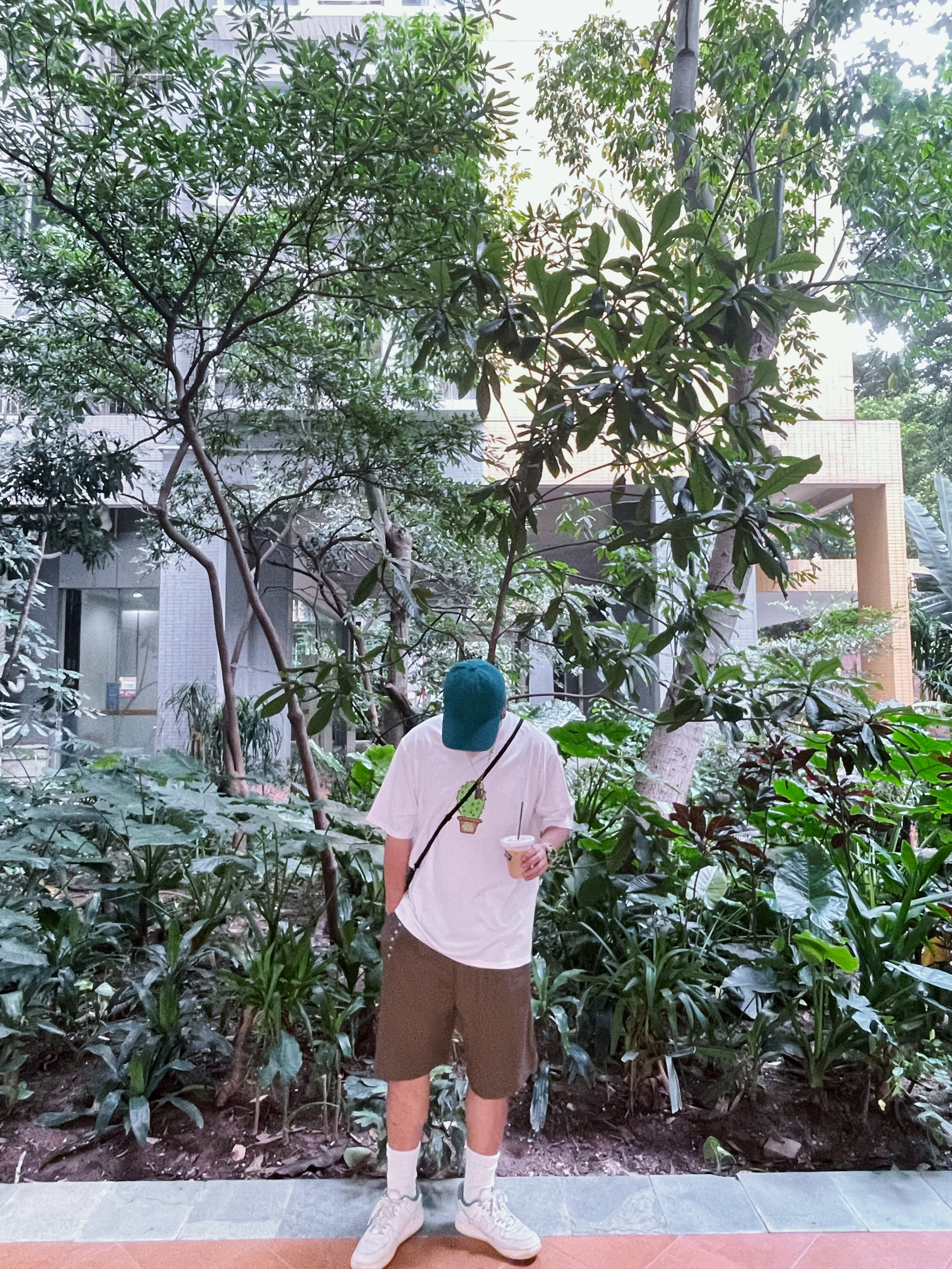 “享受夏天的感觉吧” 🌟今日份简约搭配灵感學 👕百搭的白色短袖加上绿色印花的点睛之笔,相互呼应的设计提升整件短袖的质感搭配不简单 👖简约日系风的华夫格短裤,一条能修饰你腿型的裤子上身橄榄绿,款式简单也能靠颜色出彩,版型干净利落让搭配变得更简单 色彩搭配建议:帽子和裤子相呼应,白色搭配绿色最佳,整体偏重色的搭配,来一双白色袜子跟白色鞋子,让视觉更加舒适 👔👖:Sinrcrew
