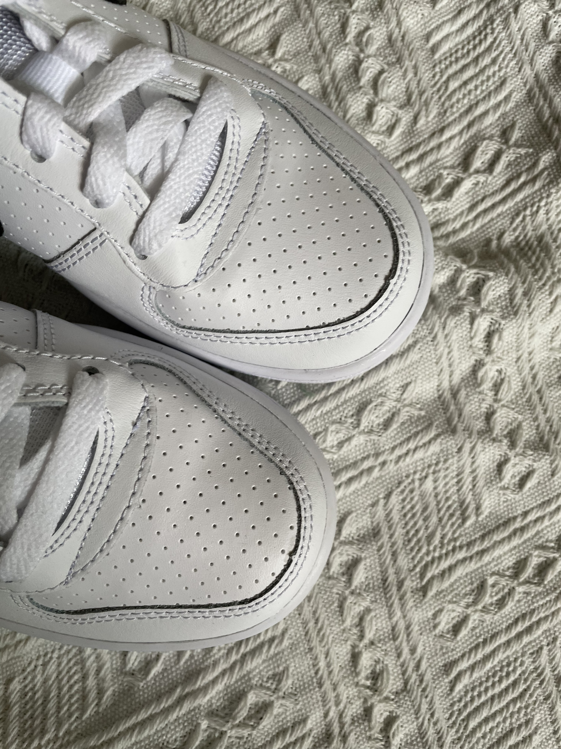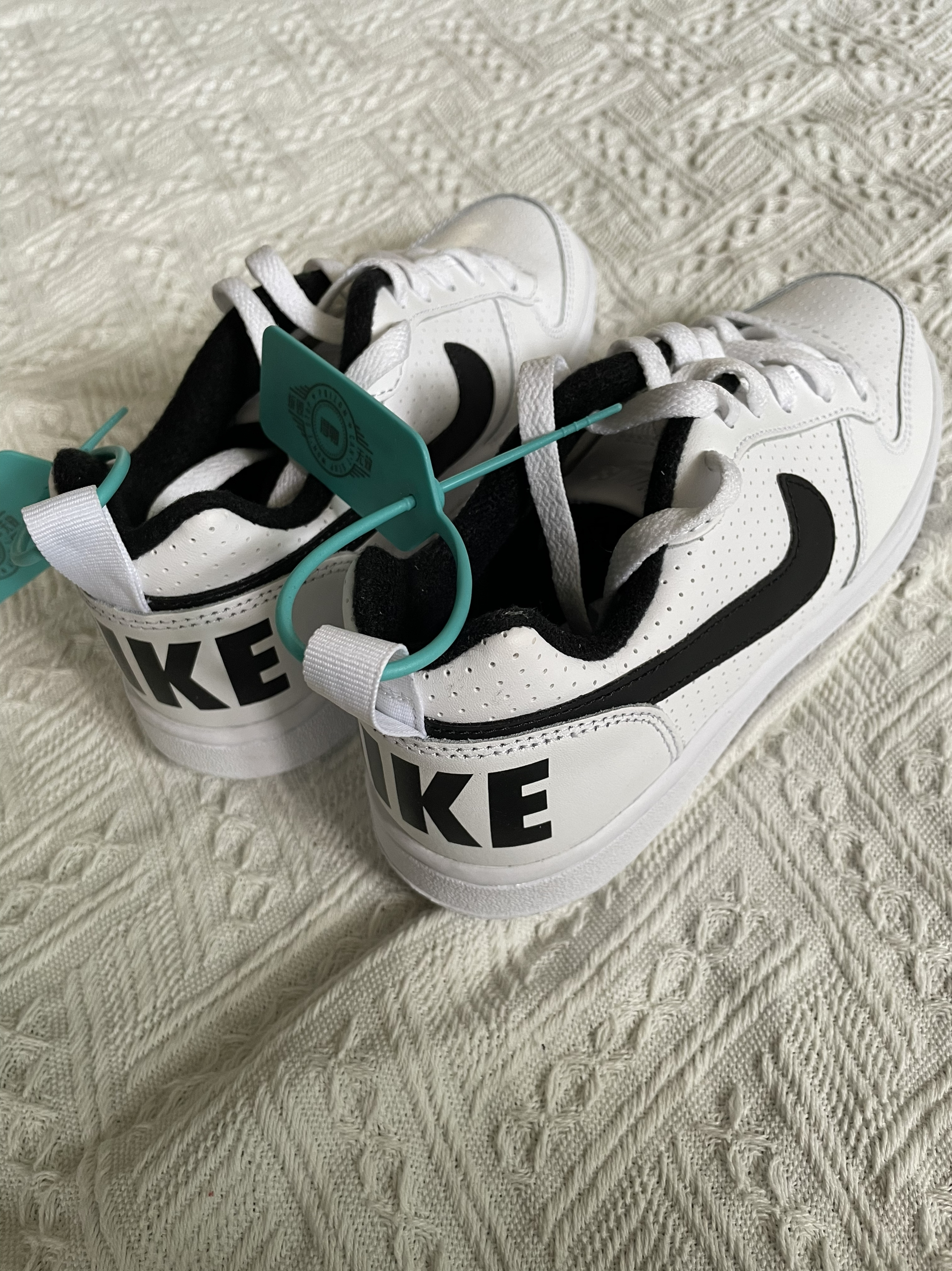 今日分享:Nike Court Borough Low (GS) 白黑 鞋子是纯白色,黑色logo点缀,特别简单的一款小白鞋 👟 鞋身是皮革材质,一圈有冲孔设计会很透气的,后脚跟处还有Nike 字母设计,非常哇塞,夏天一双小白鞋太好搭配了