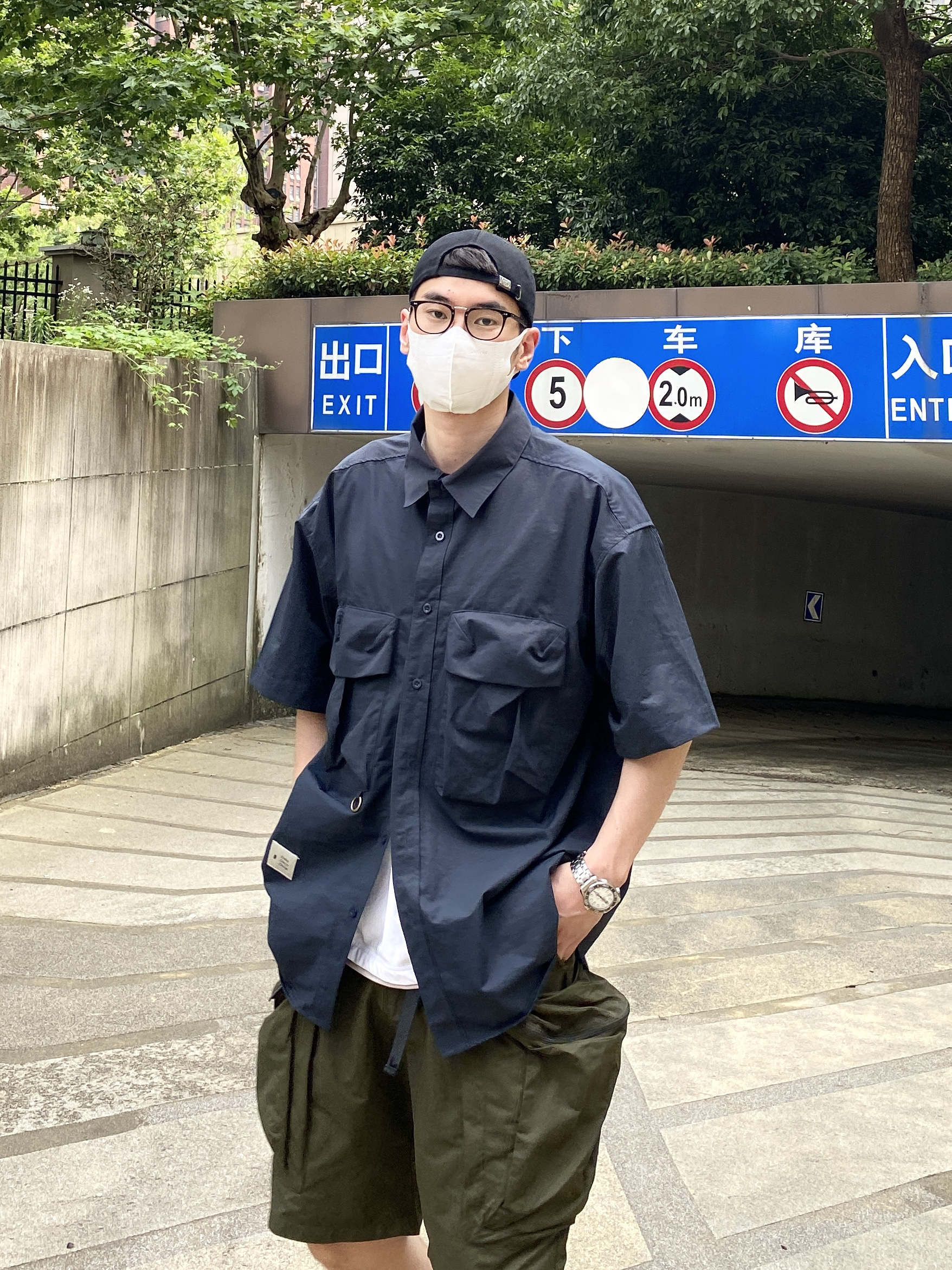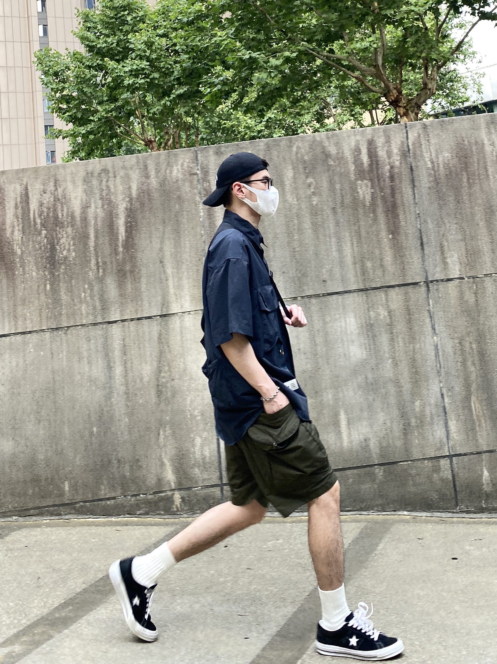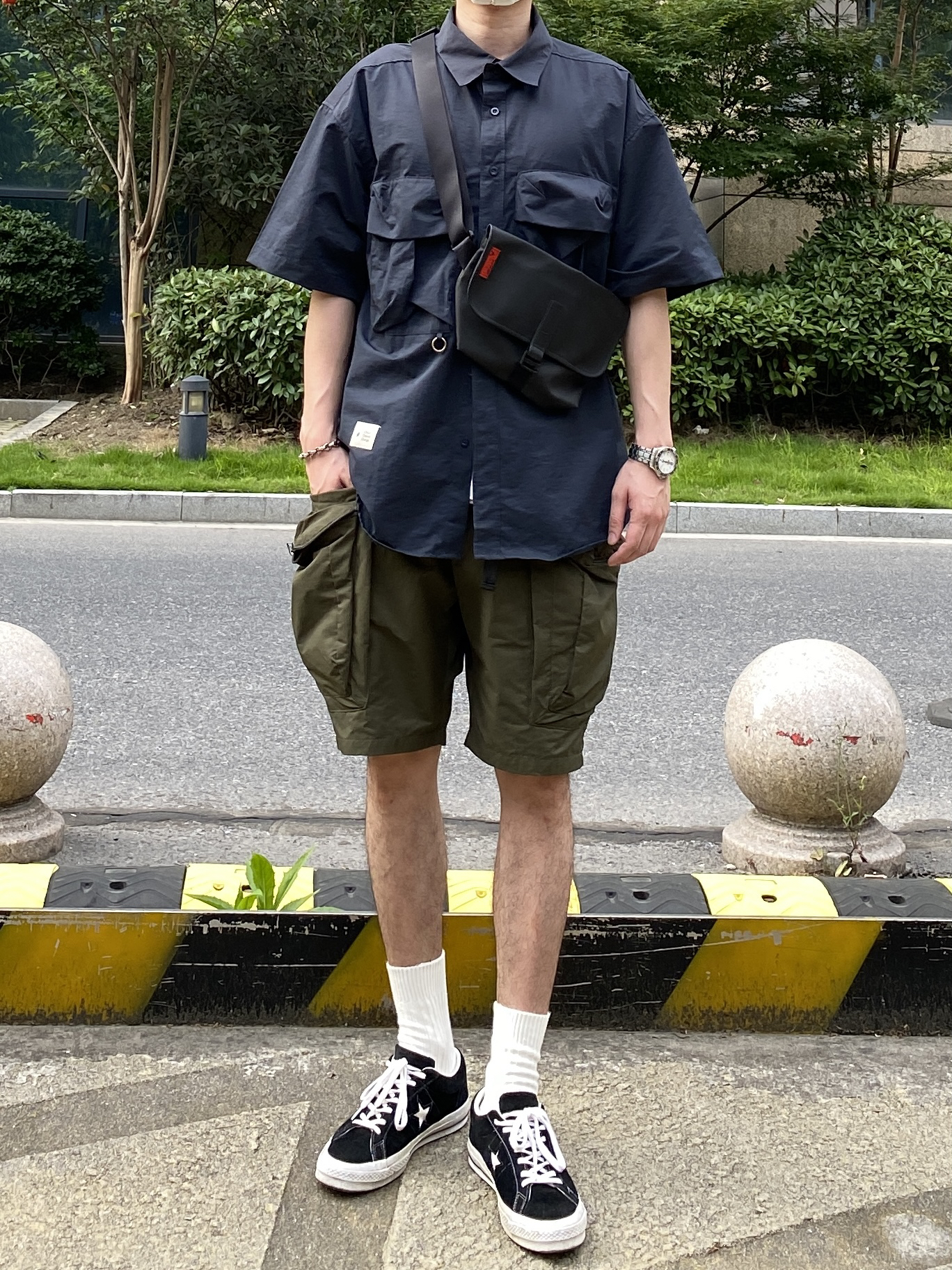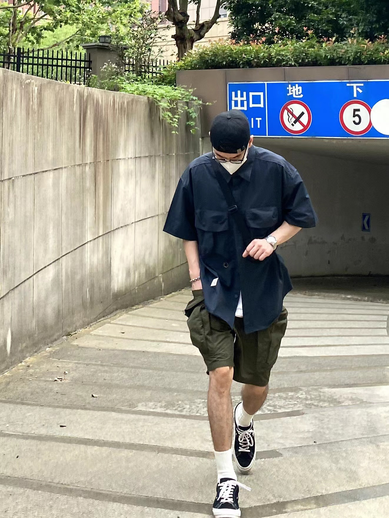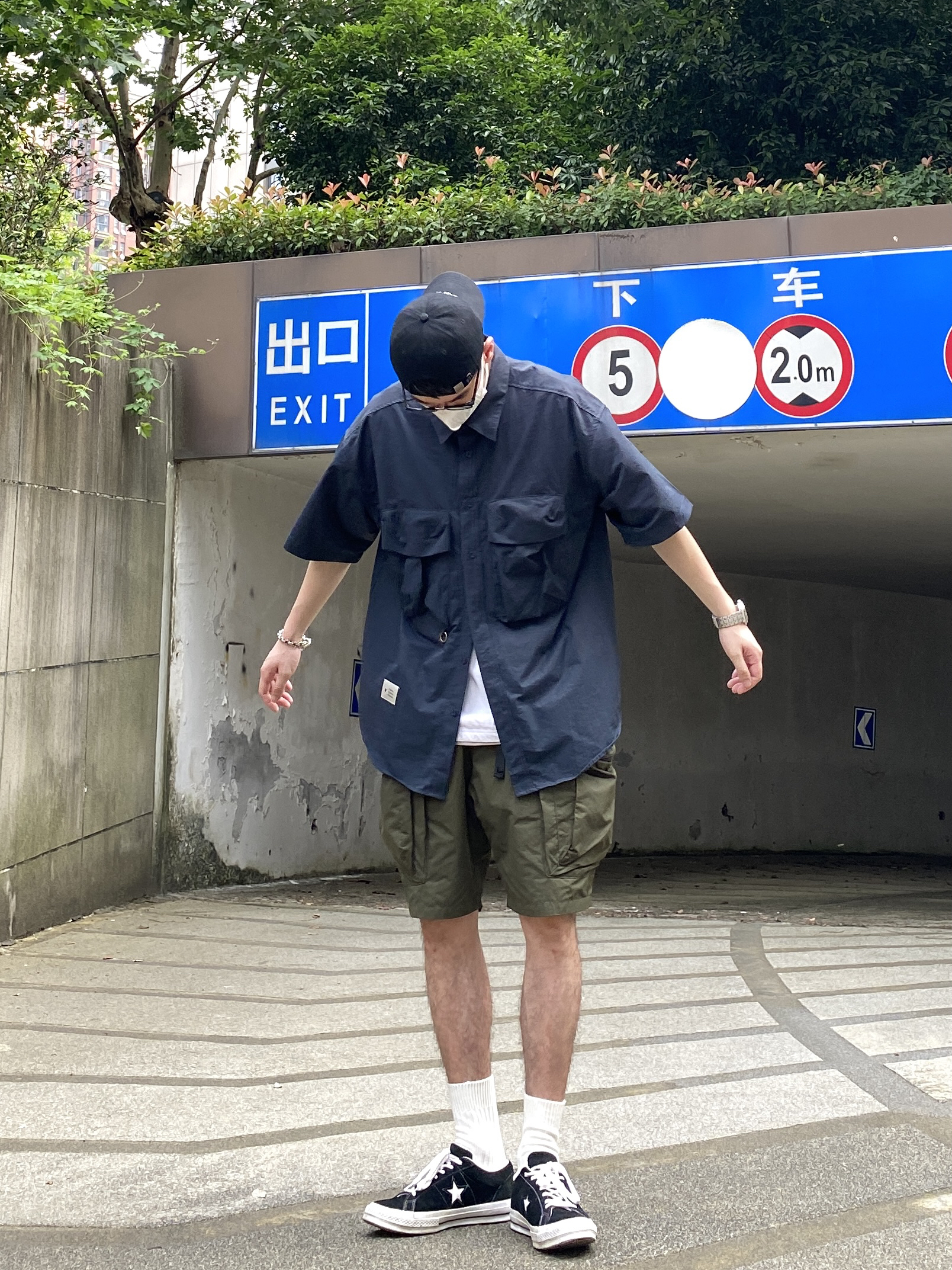 今天这套上衣穿了一件藏青色宽松阔版多口袋工装衬衫,裤子选择不挑腿型的军绿色大口袋户外机能短裤,鞋子上脚经典百搭的匡威one star,最后反戴一顶黑色棒球帽呼应下鞋子的颜色,OK,出门看看搭配效果吧! - 今日穿搭 衣服裤子都来自:NICE LILI(中间有空格) 鞋子:匡威one star