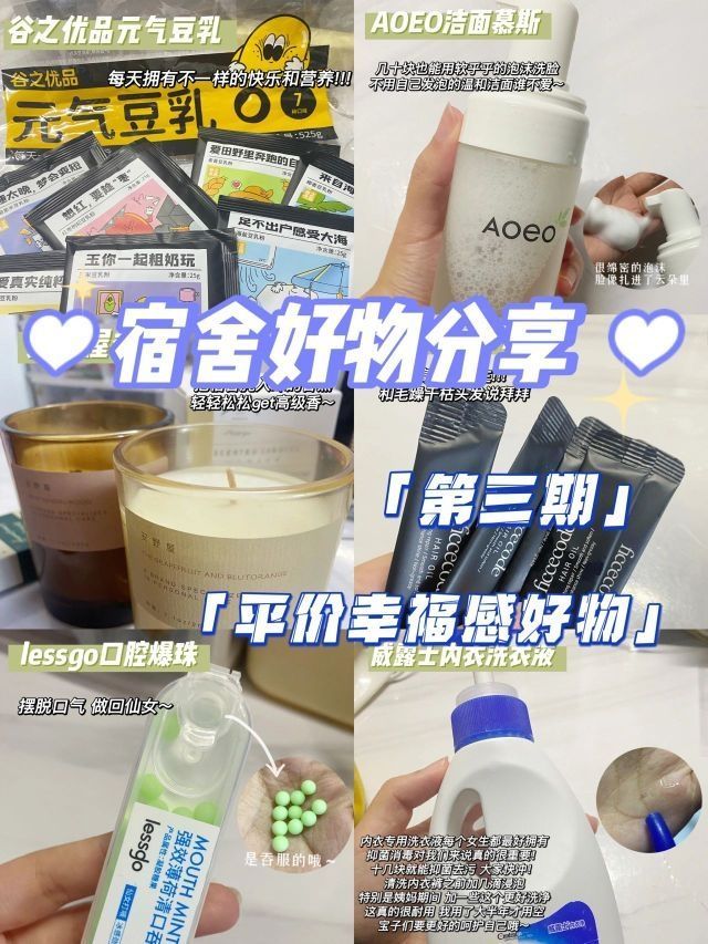 滴滴滴 宿舍好物分享又准时来到啦 本期的好物嘉宾们可以让宝子们的幸福感up 妈妈再也不用担心我的宿舍生活啦 . ☁️谷之优品元气豆乳 40r ☁️AOEO洁面慕斯 89r ☁️安野屋香薰 89r ☁️菲诗蔻护发精油 49r ☁️lessgo口腔爆珠 19r ☁️威露士内衣洗衣液 15r . 这就是本期的宿舍好物分享啦 希望宝子们的宿舍生活都能幸幸福福哦 也可以继续关注我的宿舍好物分享让自己更幸福呢