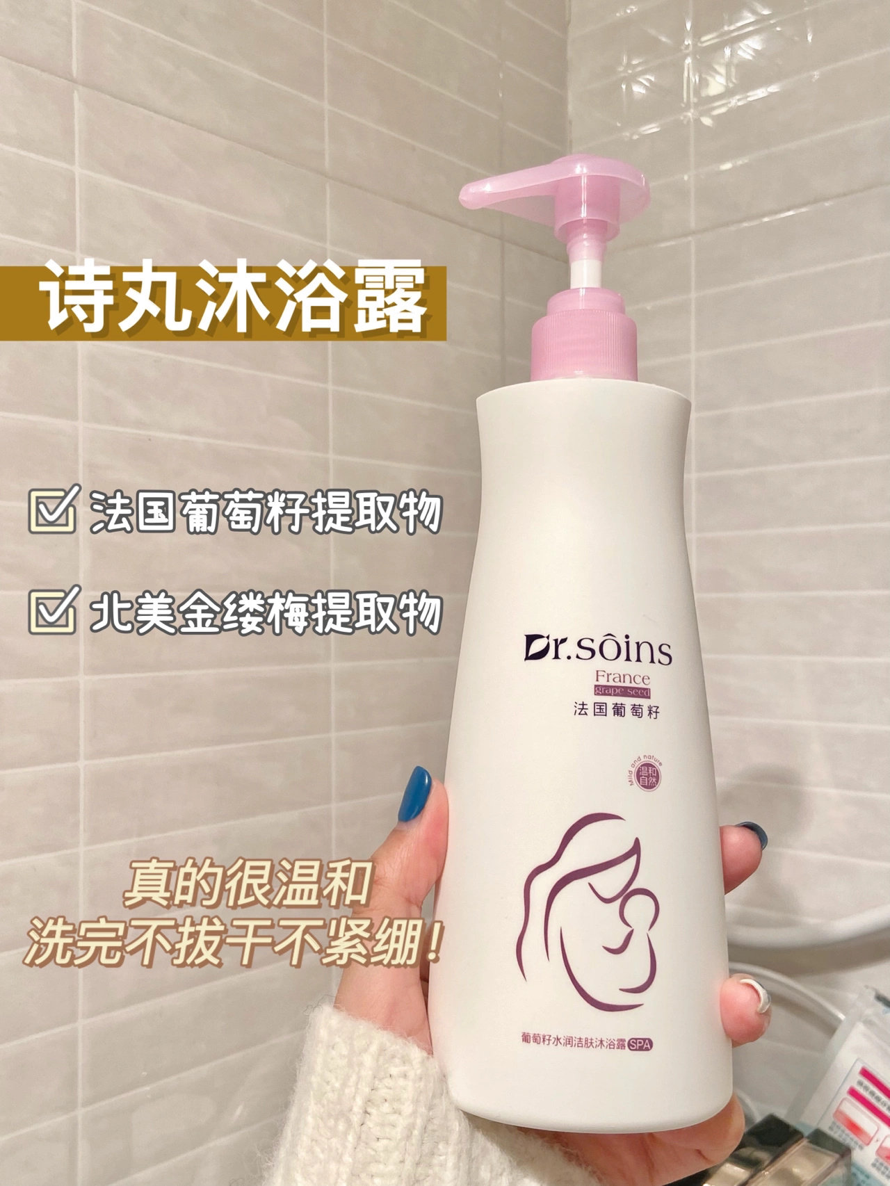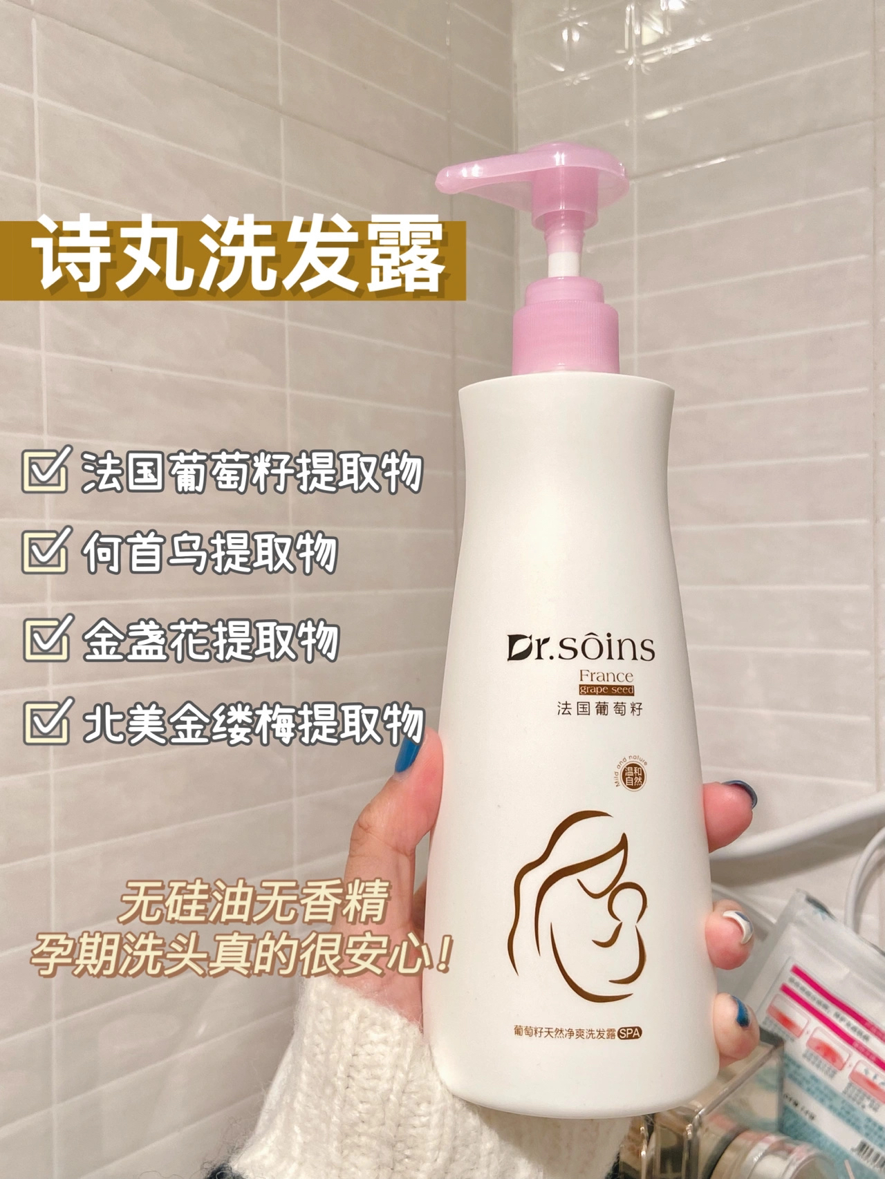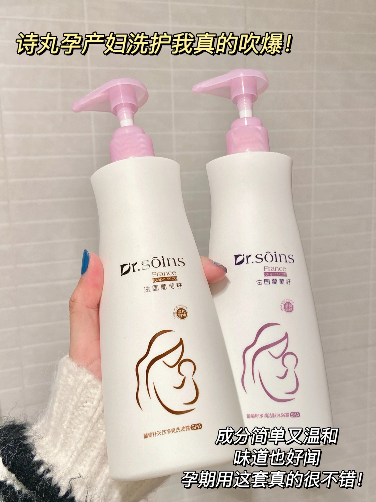 孕期洗澡真的很有讲究, 不能随随便用之前的洗护了! 温和真的成为了重点~ 这套Dr.soins诗丸洗护套装一定要试试! 成分很天然而且没有乱七八糟添加, 孕期用着又安心又舒服! - 👉🏻 Dr.soins诗丸洗发水 无硅油的洗发水是真的清爽, 每次洗完头发根根分明! 而且味道也是很好闻的葡萄味! 👉🏻 Dr.soins诗丸沐浴露 这个沐浴露起泡也太多了, 一泵就能打出丰富细腻的泡沫, 而且不拔干不...