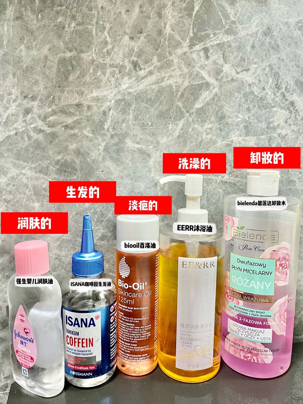 hello 以油养肤大家应该都不陌生了吧 今天就给大家推荐几款油类好用产品 真的很好用 都是自己用过的产品 仅供参考 1⃣️强生婴儿油 2⃣️ISANA咖啡因生发液 3⃣️biooil百洛油 4⃣️EE&RR沐浴油 5⃣️碧莲达卸妆油