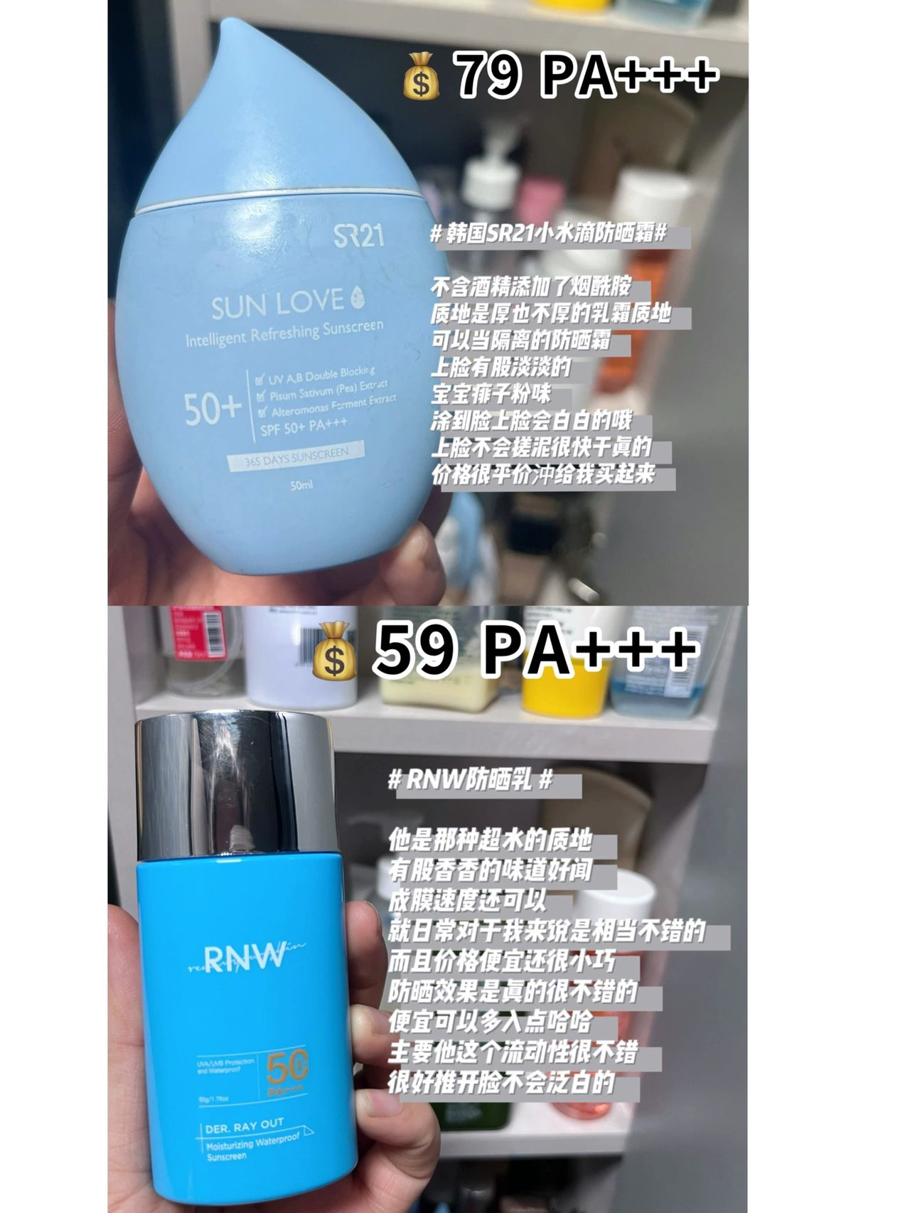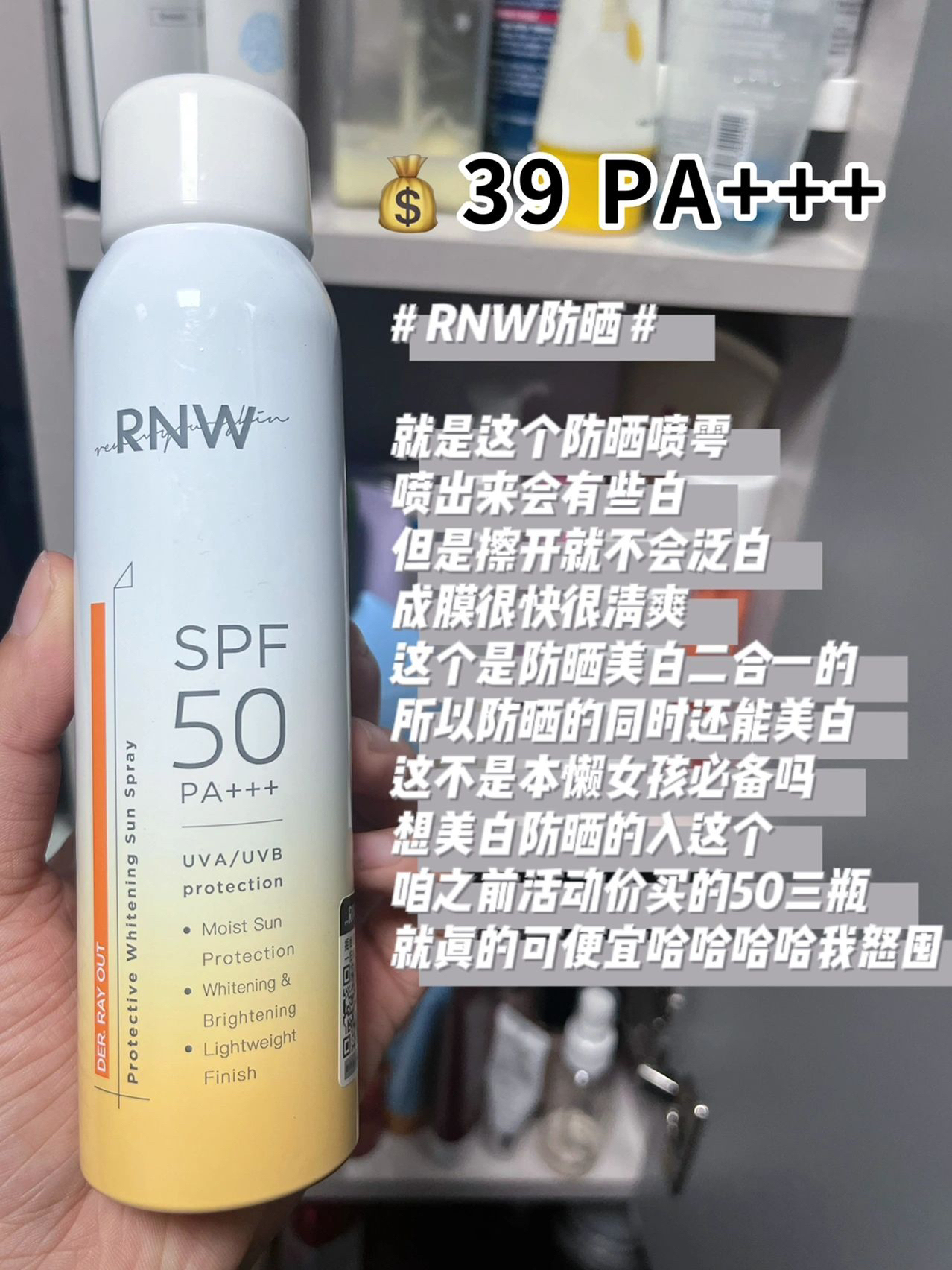 本篇笔记关联了肌肤未来 小奶砖防晒霜SPF50+/PA+++ 40ml、RNW 三合一防晒霜 SPA50+/PA+++ 防水清透 遮瑕水感 50g、RNW 防晒喷雾 SPF50/PA+++ 面部 全身 120ml等商品,为用户提供真实的使用体验和购买参考。
