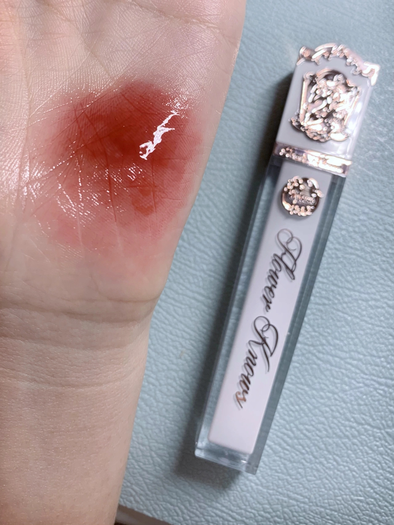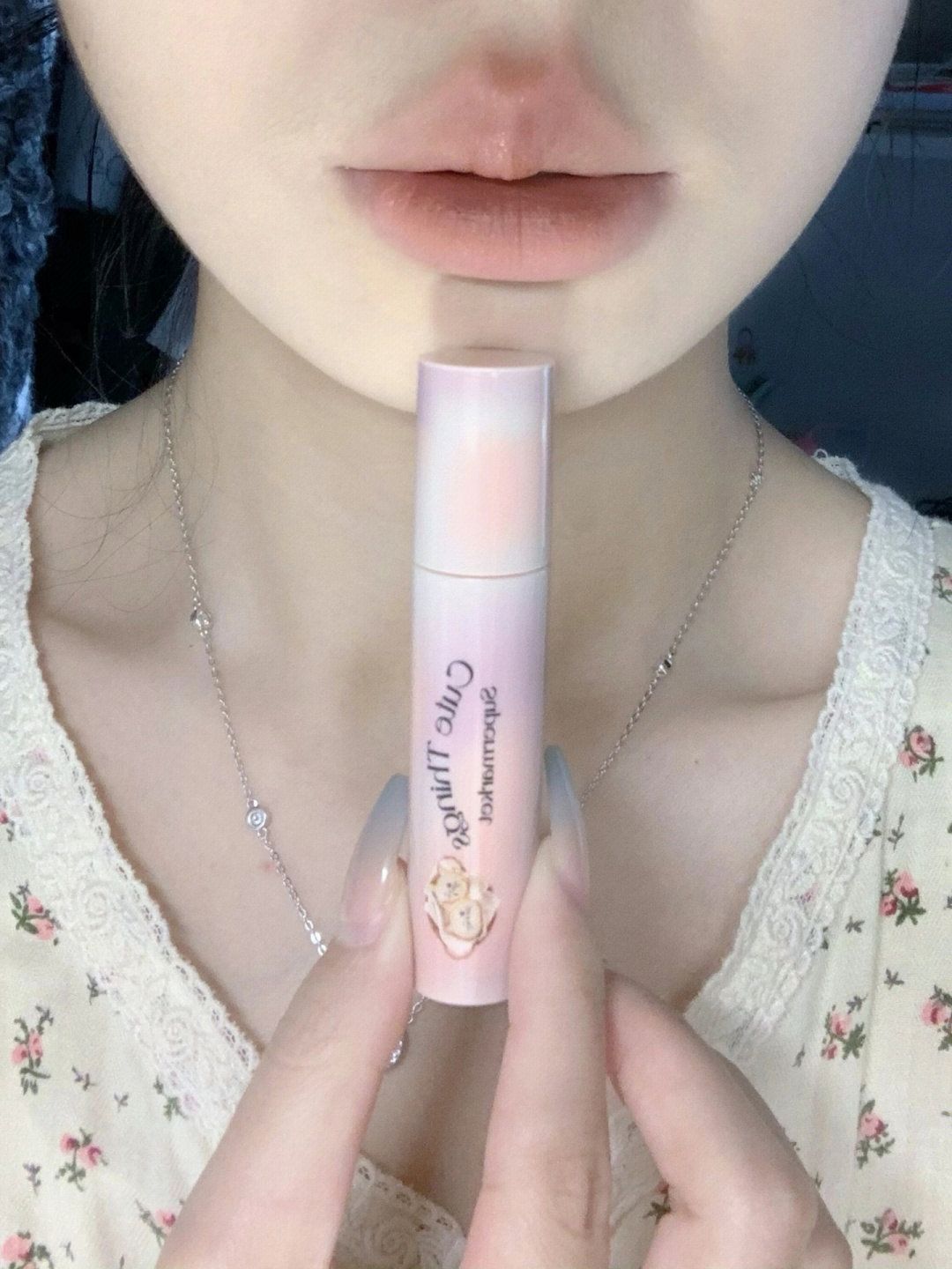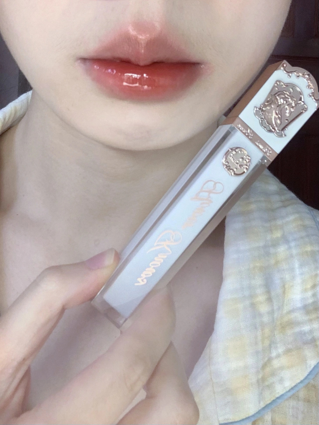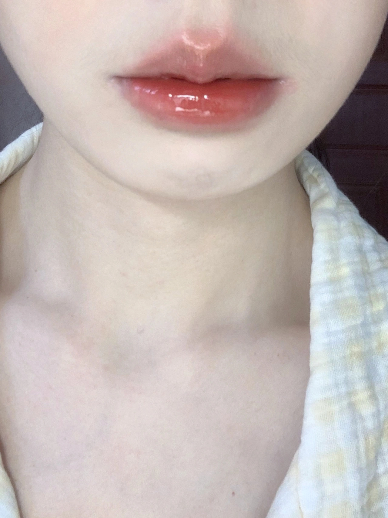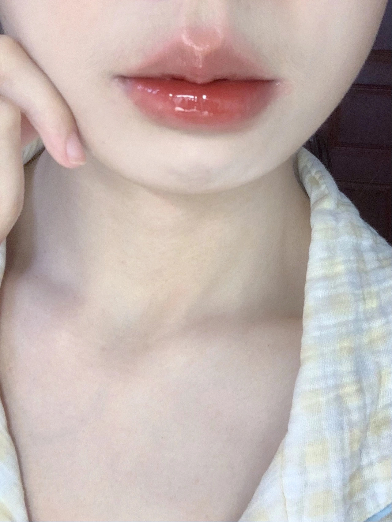 上嘴是薄涂一层 这镜面感真实存在!!! 温柔又气质的颜色 这种带红茶调的颜色不挑皮 放心抿嘴涂 不影响成膜变亮 成膜速度hin快!!! 🍎前置 黄一白 室内灯光暖光 花知晓独角兽唇釉j07