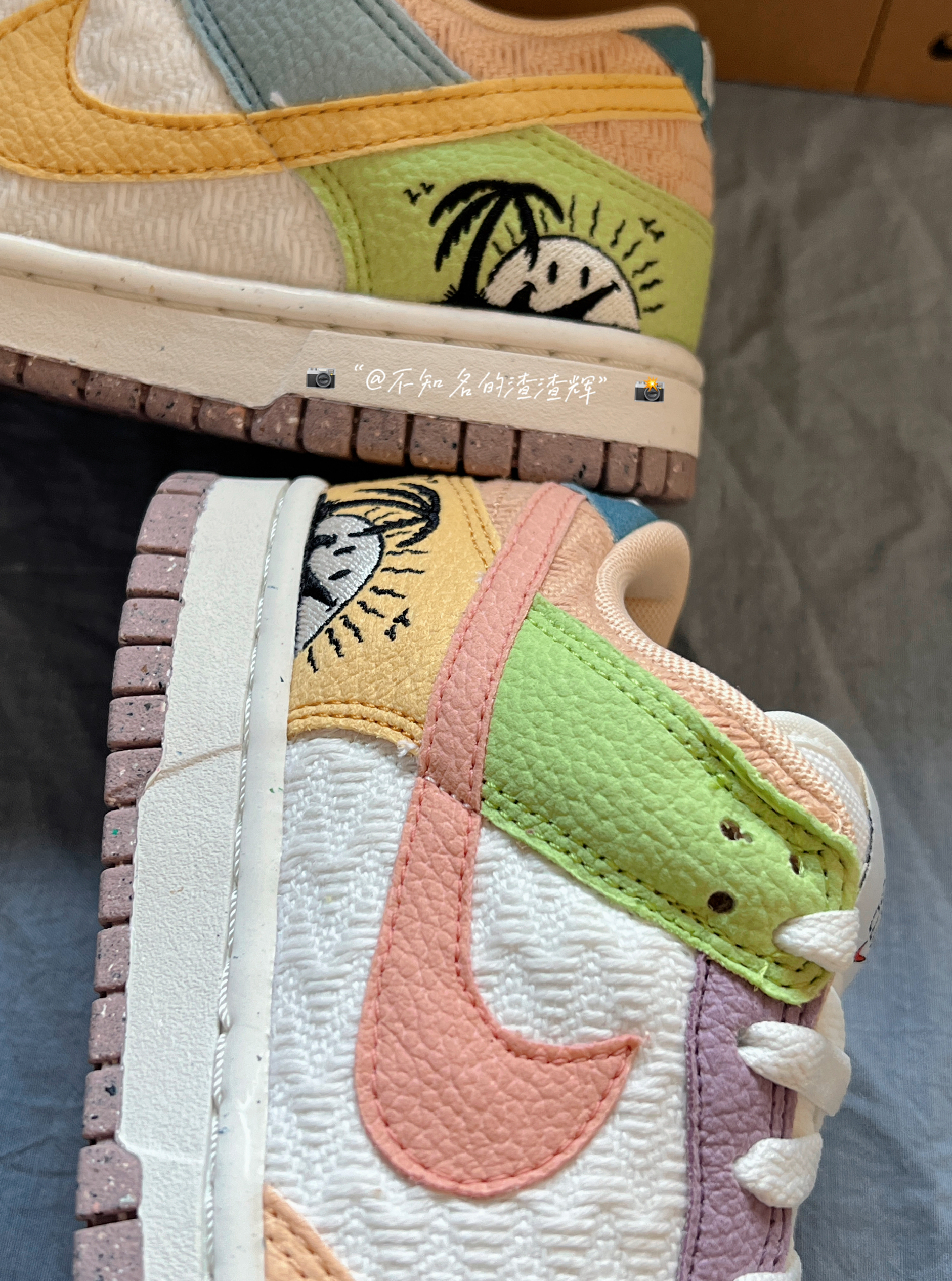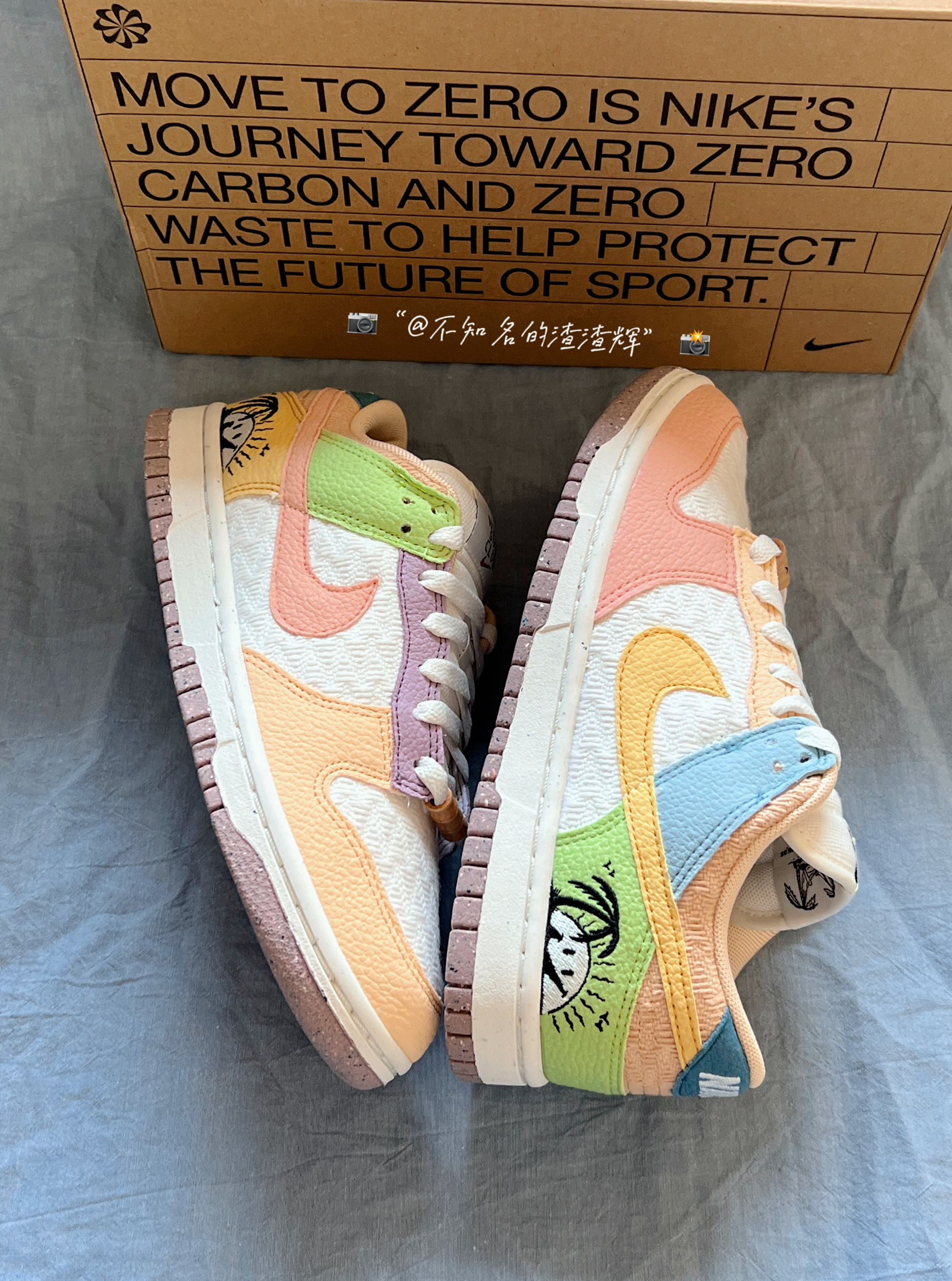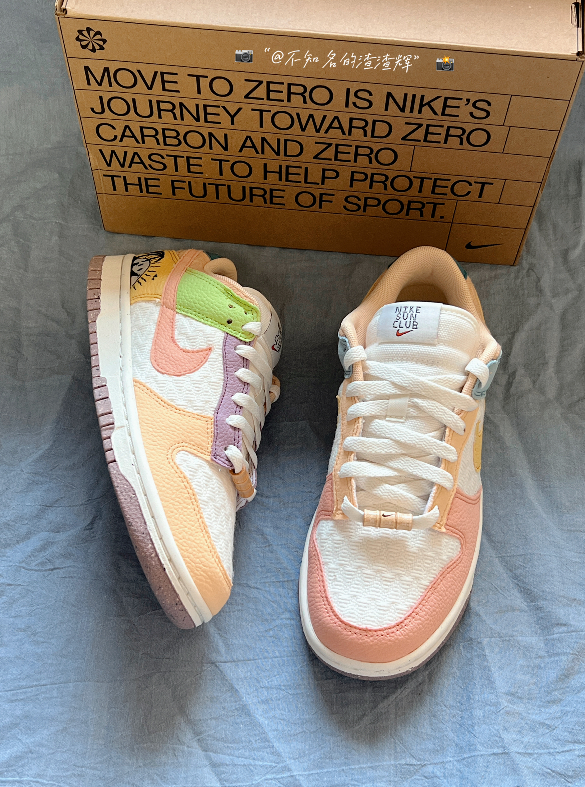 💫:Nike Dunk Low SE“Sun Club”经典休闲板鞋彩色拼接 可回收材料 💫:这双鞋子整体采用粉色、黄色、蓝色、绿色、白色组合而成,配色非常仙女,鞋面采用优质皮革材质和织物材质组成,质感舒适,鞋前头的AF1标志采用木质设计,后跟有着笑脸设计,可以说非常细节的一款鞋子 💫:实物很好看的款式,非常女生夏天穿,很清新的感觉 💫:尺码推荐:正常尺码
