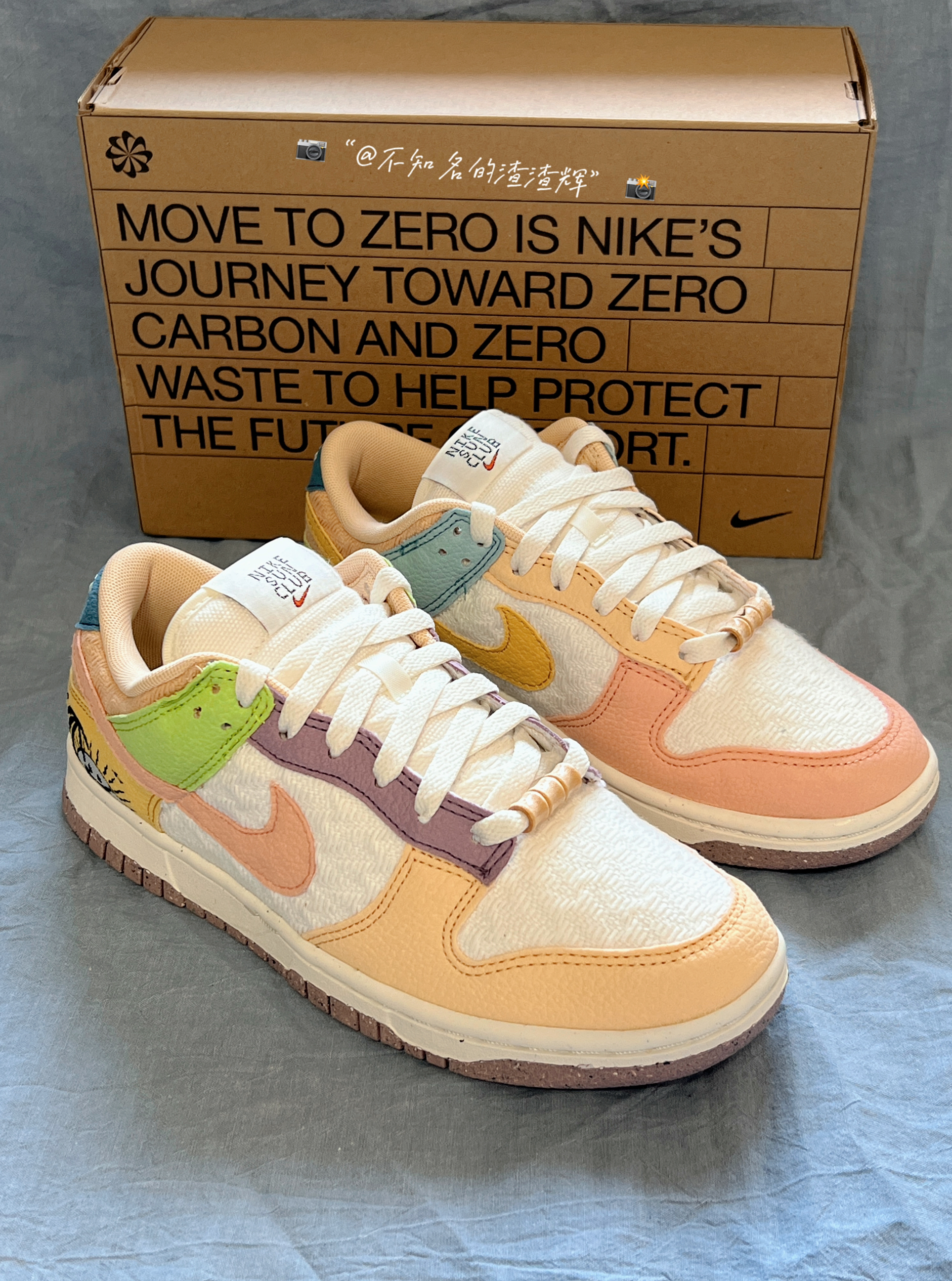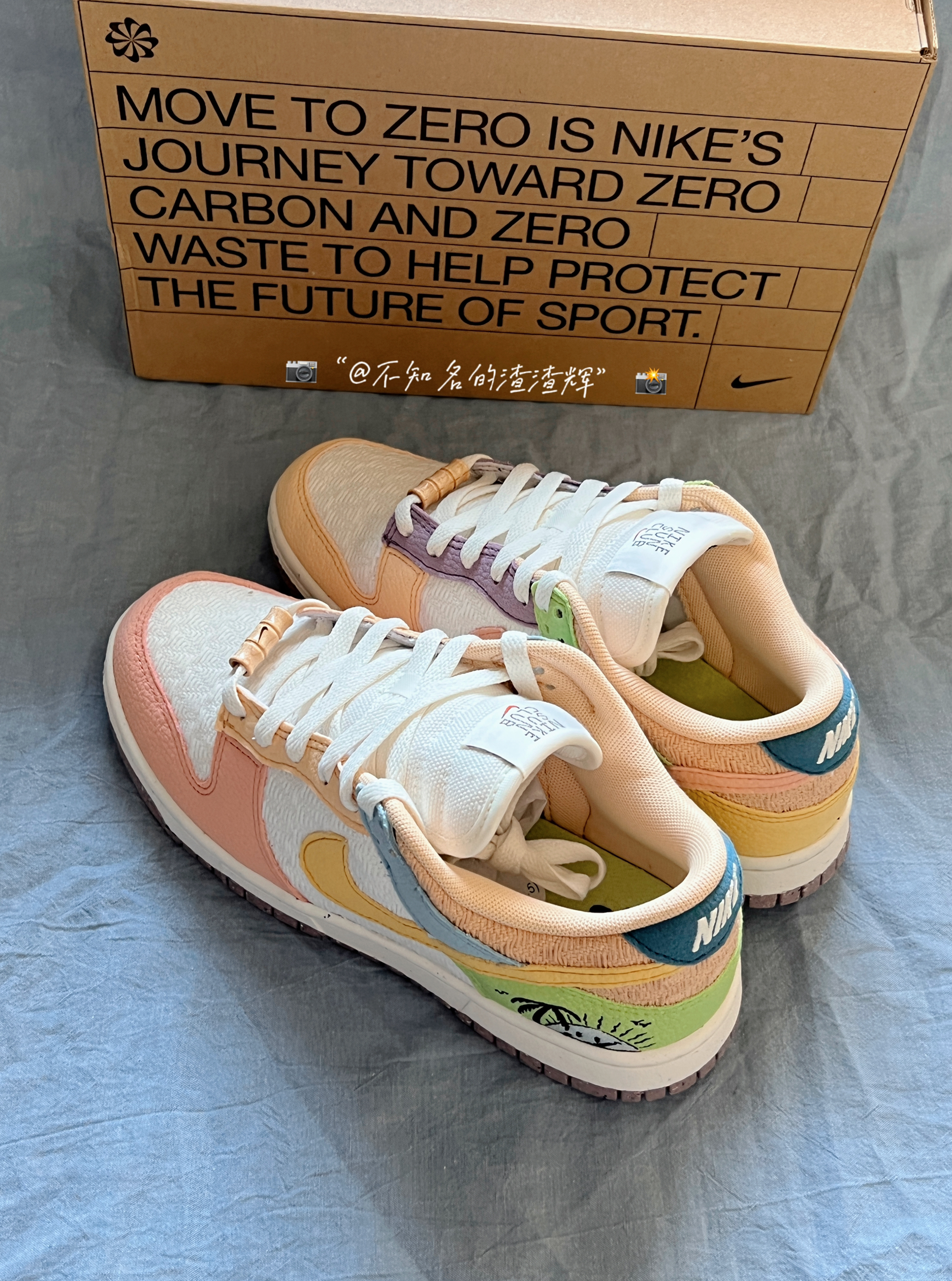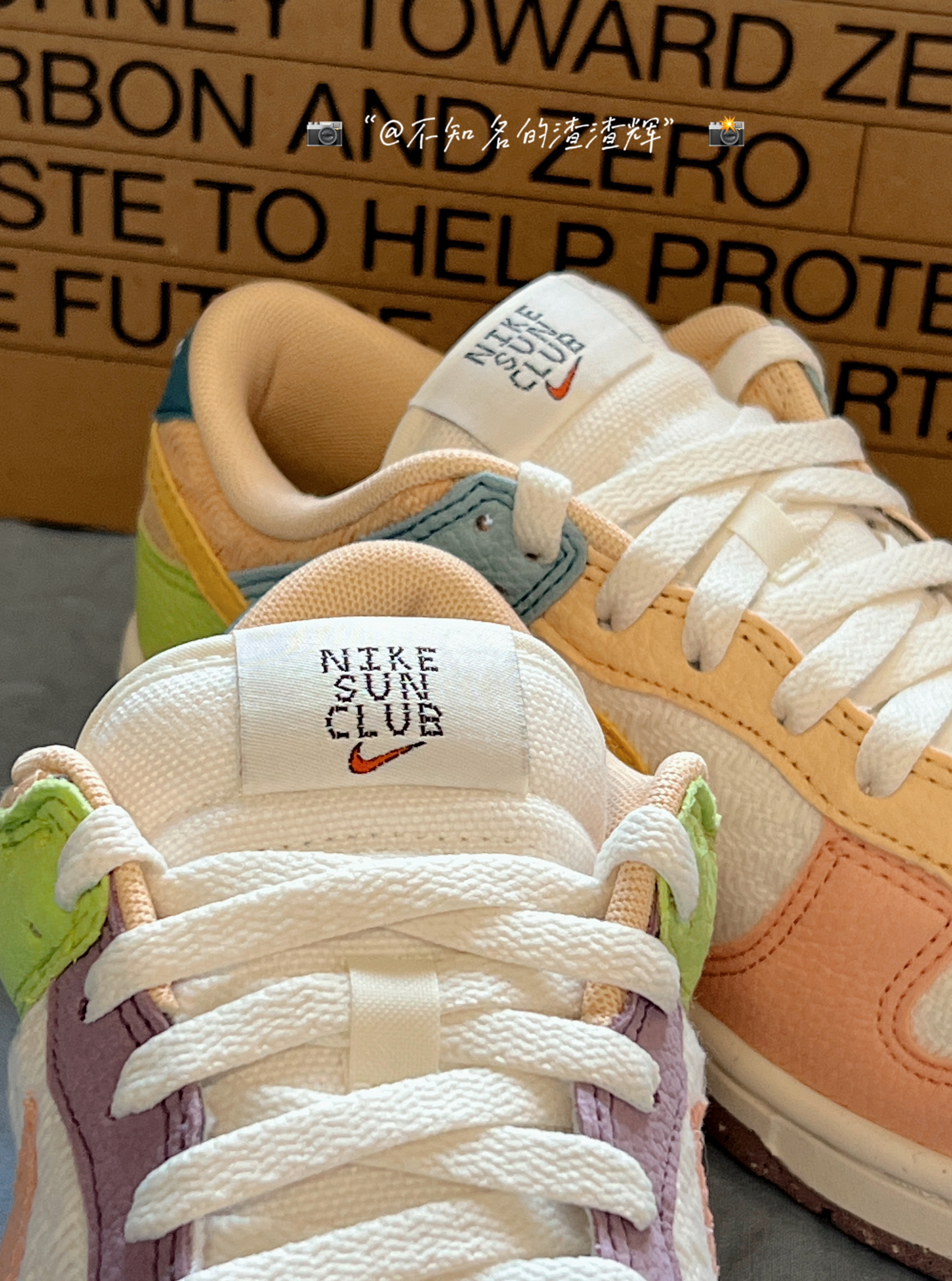 💫:Nike Dunk Low SE“Sun Club”经典休闲板鞋彩色拼接 可回收材料 💫:这双鞋子整体采用粉色、黄色、蓝色、绿色、白色组合而成,配色非常仙女,鞋面采用优质皮革材质和织物材质组成,质感舒适,鞋前头的AF1标志采用木质设计,后跟有着笑脸设计,可以说非常细节的一款鞋子 💫:实物很好看的款式,非常女生夏天穿,很清新的感觉 💫:尺码推荐:正常尺码