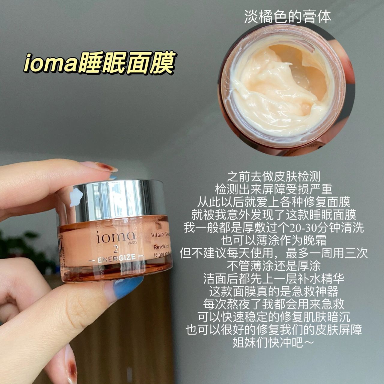 1、ioma急救面膜 之前去做皮肤检测 检测出来屏障受损严重 从此以后就爱上各种修复面膜 就被我意外发现了这款睡眠面膜 我一般都是厚敷过个20-30分钟清洗 也可以薄涂作为晚霜 但不建议每天使用,最多一周用三次 不管薄涂还是厚涂 洁面后都先上一层补水精华 这款面膜真的是急救神器 每次熬夜了我都会用来急救 可以快速稳定的修复肌肤暗沉 也可以很好的修复我们的皮肤屏障 姐妹们快冲吧~ 2、msp氨基酸洗...