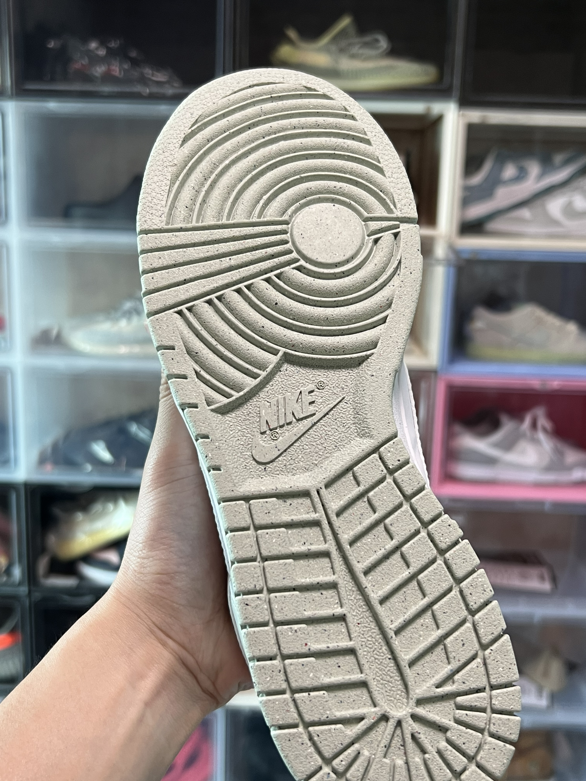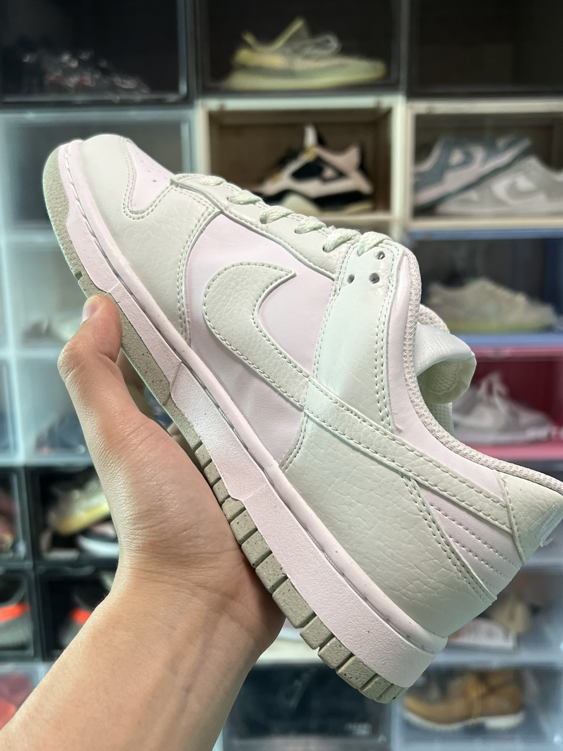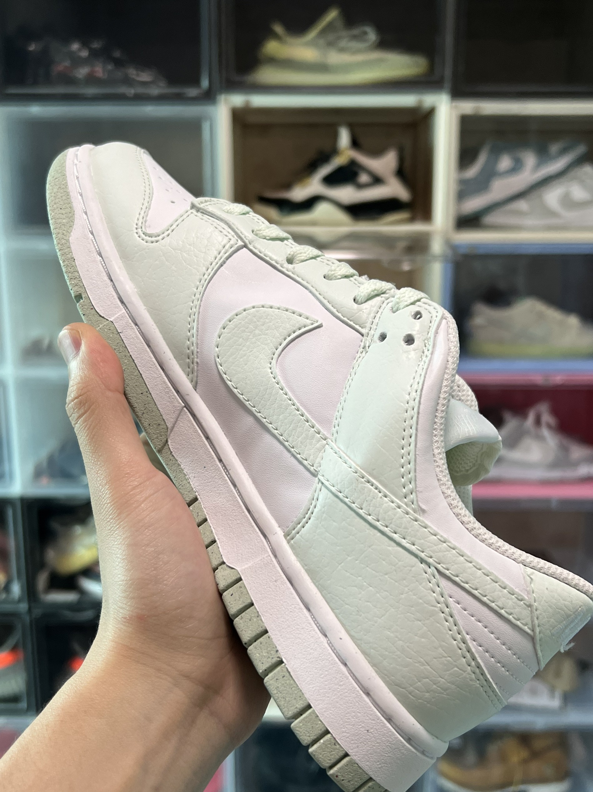 鞋盒就是环保系列的棕色鞋盒 打开鞋盒只有一双鞋 没有防尘纸 将环保贯彻到底 就是看着有点奇怪 鞋面采用淡绿色拼接白色皮革 搭配上薄荷绿的皮质Swoosh 加上白色中底 和回收系列没款都有的泼墨大底 这双鞋拿手里并没感觉出来是环保系列 皮革摸着依然不错 就是重量感觉比普通dunk轻
