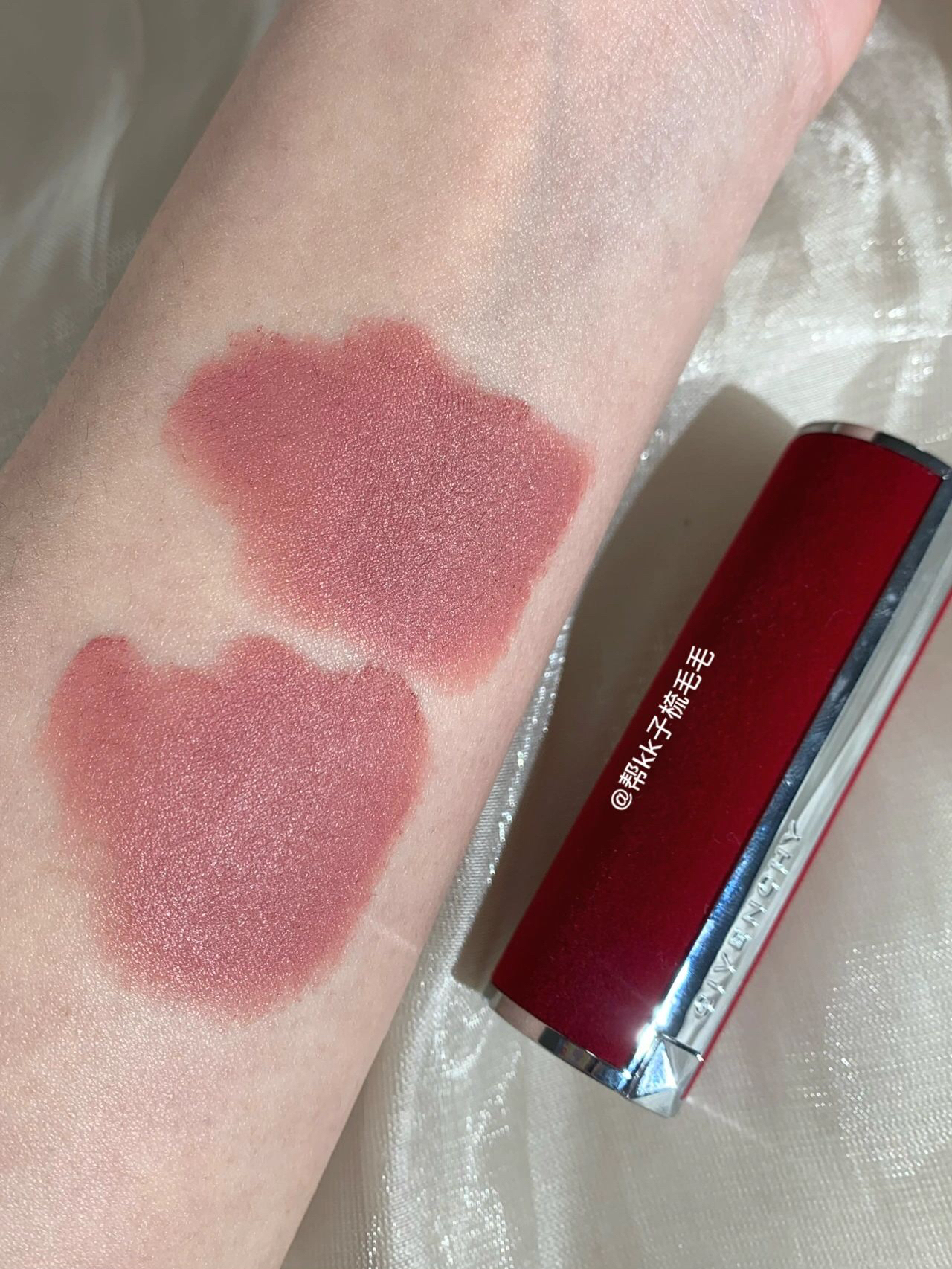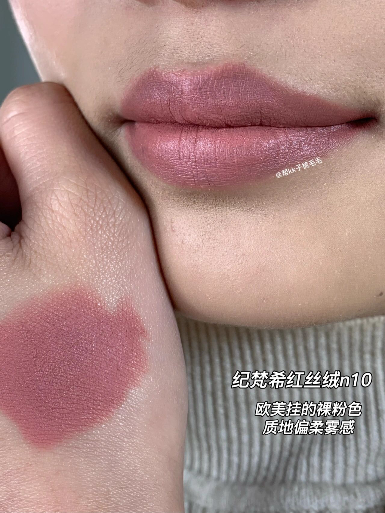 纪梵希红丝绒n10,外壳太加分了。 丝绒的质感,上手高级又舒服 色系是欧美挂裸粉色,质地偏柔雾感,上手很丝滑。 浅唇涂是淡淡的粉粉豆沙色,优雅大方不具攻击性。 深唇打底也是yyds 。 质地很好抚平唇纹的同时让唇形更加自然,有形无边感