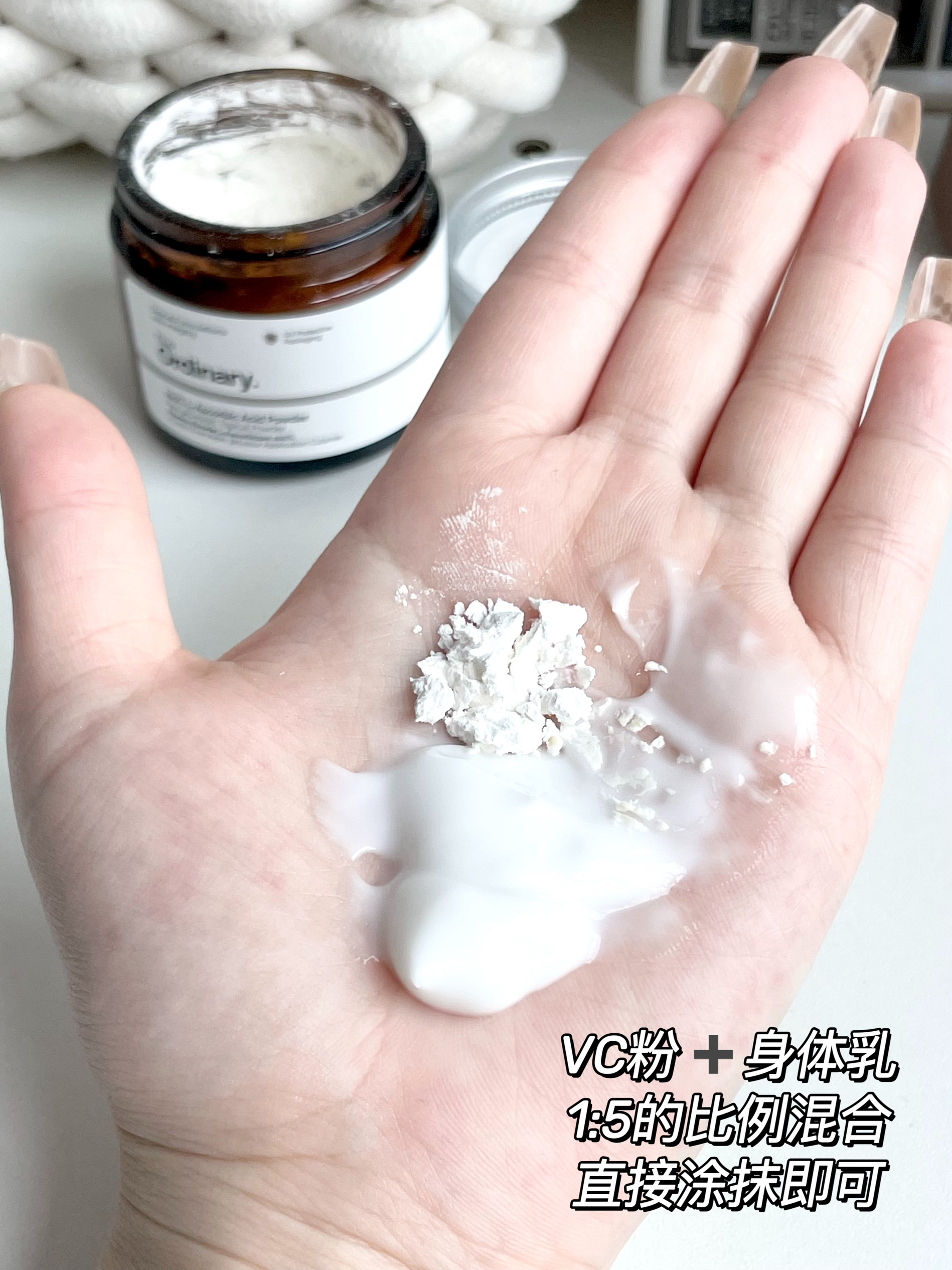 都说晒黑容易提亮难🥲 不仅见效速度慢投入成📖还高😭 尤其是学生党真的伤不起!! 在做了一圈功课之后我把目光放在了有成分大佬之称🌅的The Ordinary身上 百元内就能买到一罐100%的VC粉!! 用起来完全不心疼!🤩 - 我一般在洗完澡后会先用磨砂膏去下角质 这样更有利于皮肤吸收哦💓 然后再根据1:5的配比跟身体乳混合在一起抹在手臂💪🏻和腿上🦵🏻的地方 坠后用保鲜膜裹起来防止染色 不方便裹保鲜...