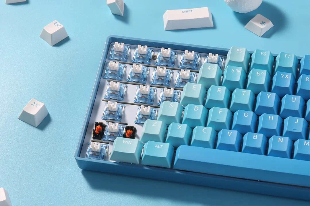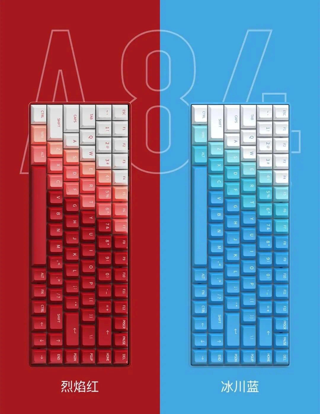 A84 冰川蓝,蓝色渐变键帽 天空V3轴实现了键帽与轴体的配色统一性 定位板使用的是FR4材质定位板,金属颤音更小 内置高韧性消音硅胶垫,手感更好机械键盘