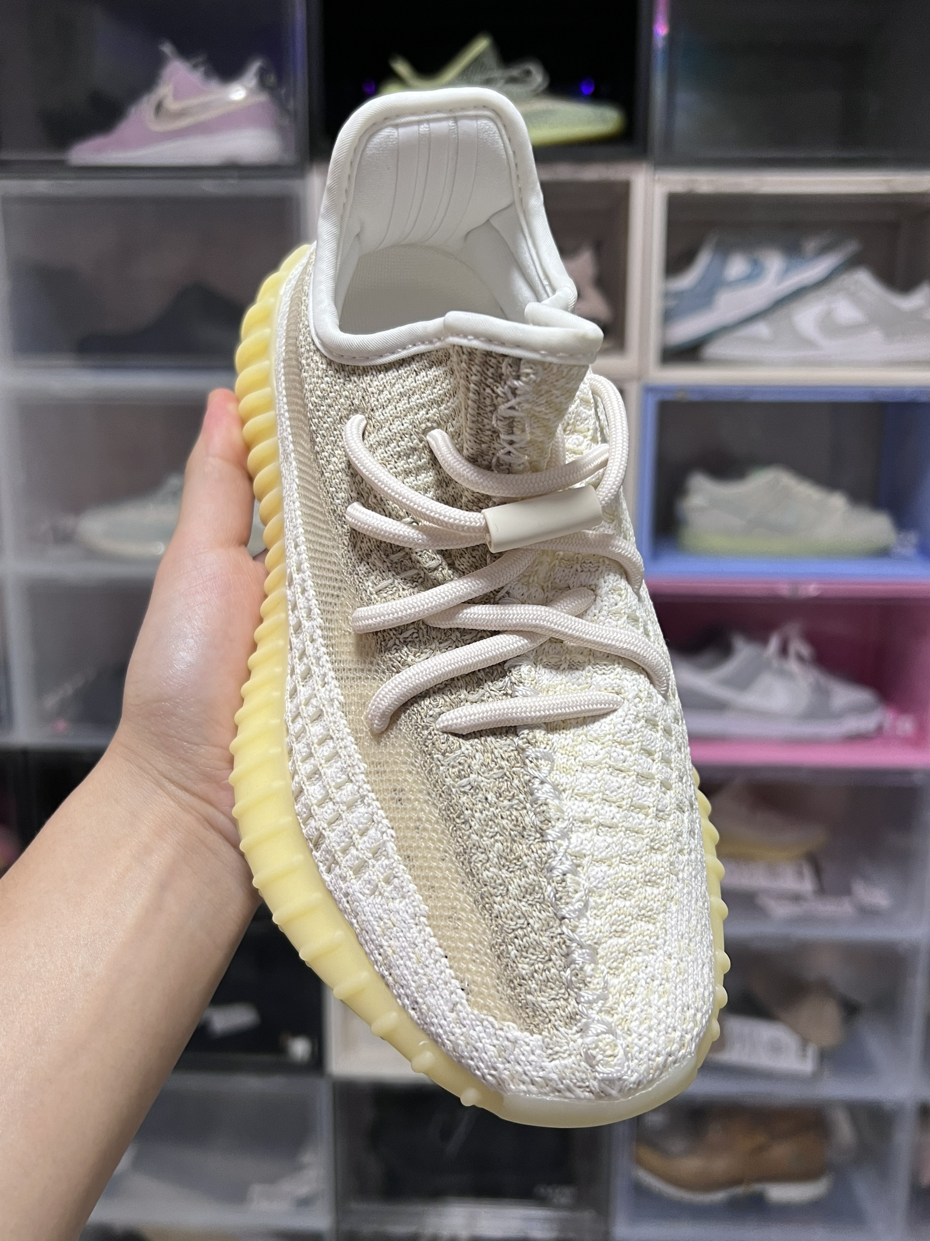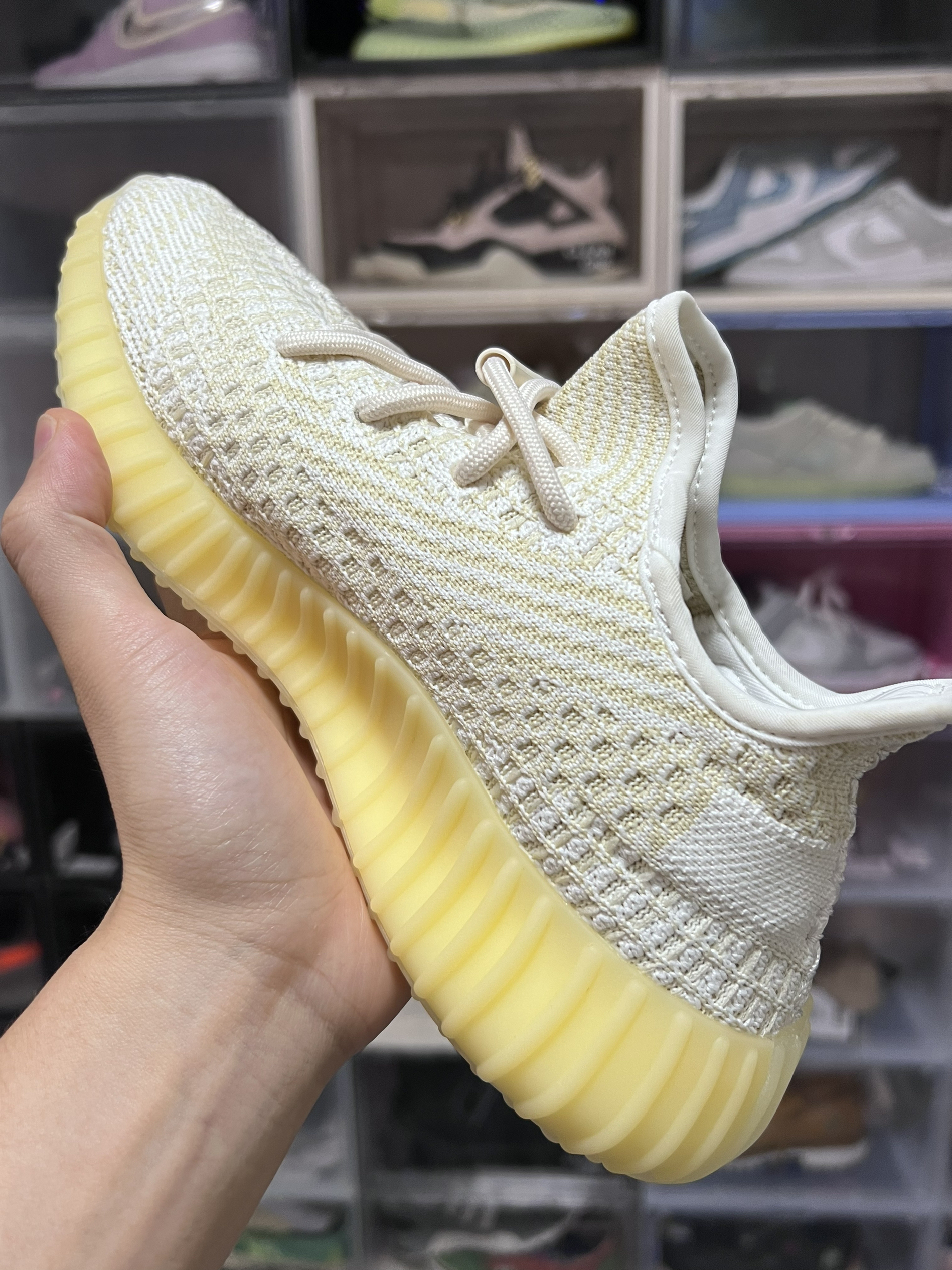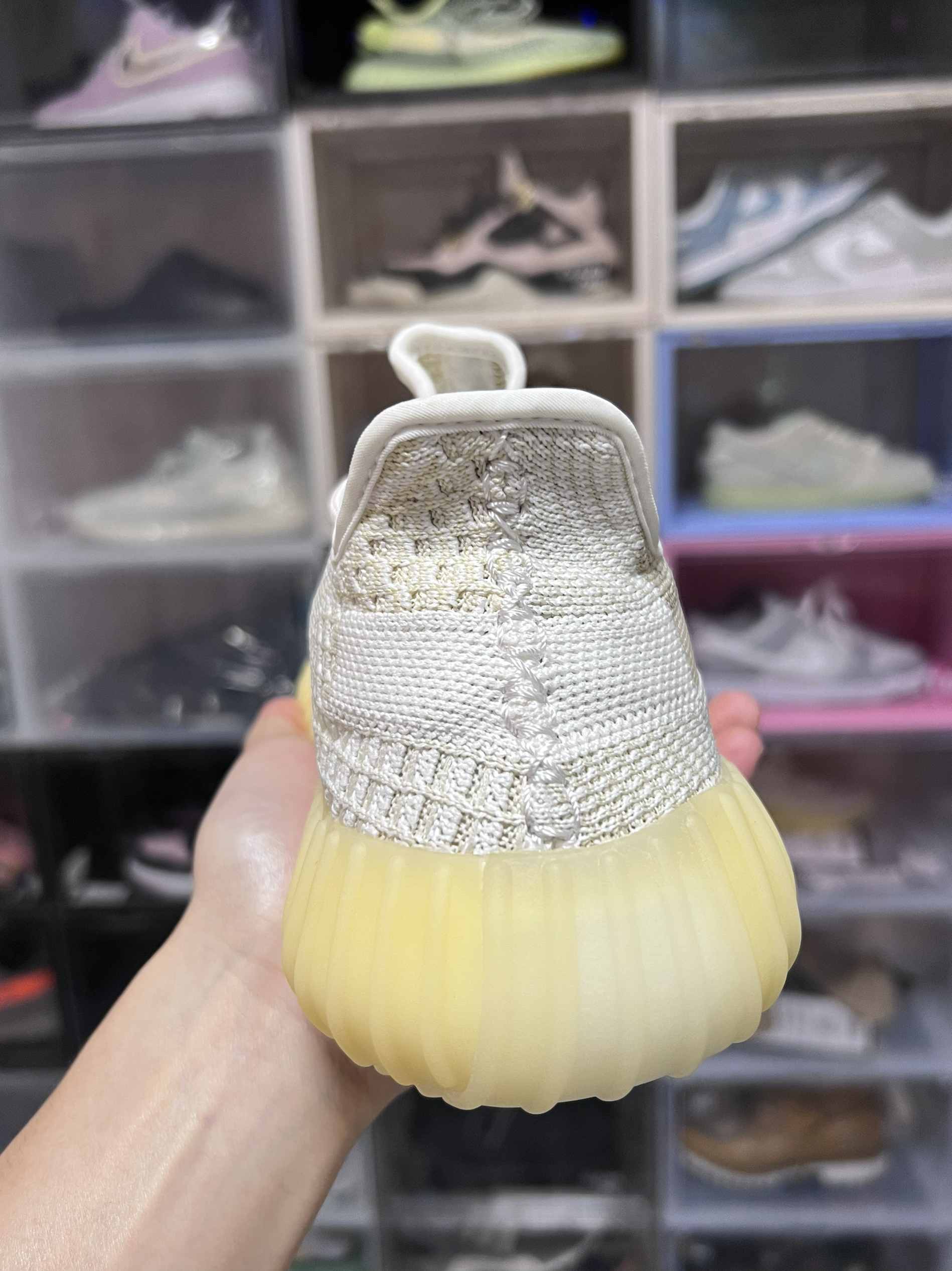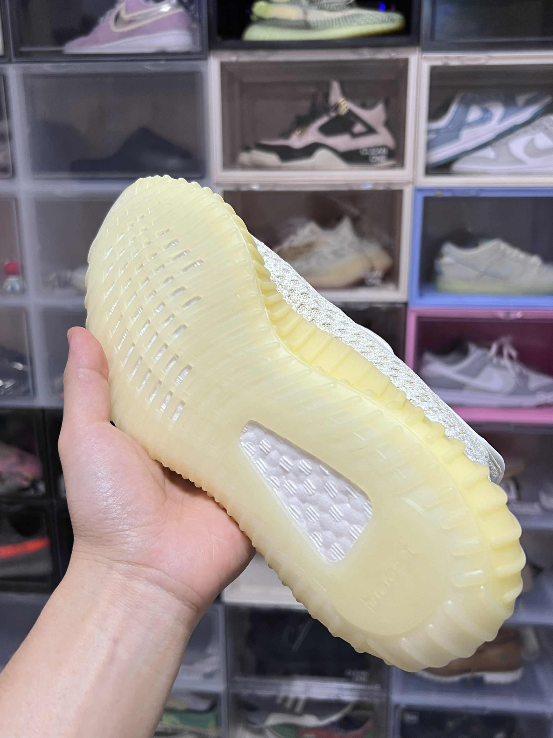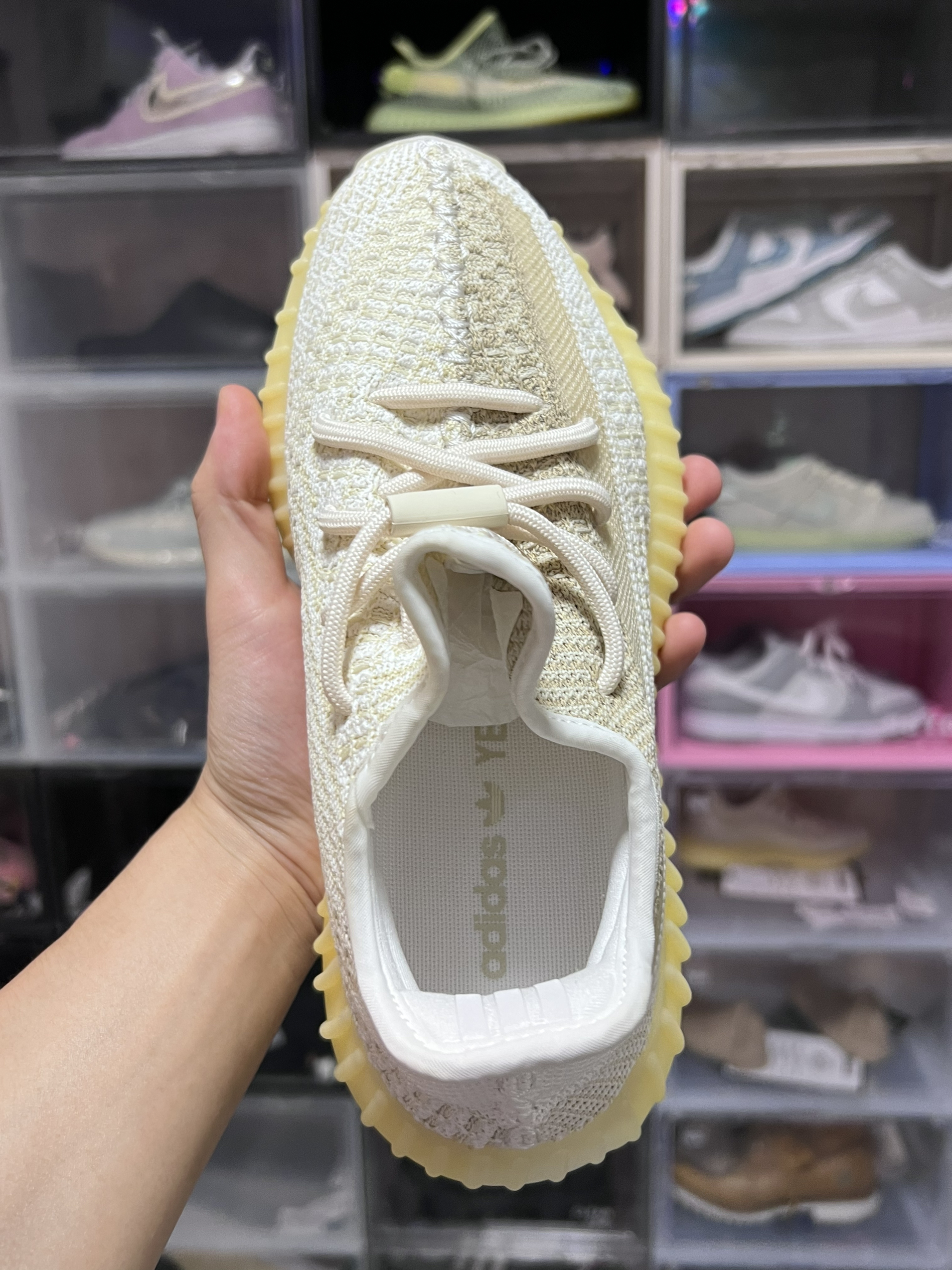 从刚发售3200出头到现在原价出头 我是没想到的 鞋面采用米黄色拼接白色织物 值得一提的是 这双鞋鞋面上半部分还是反光的 意思这双鞋还是个半满天星 采用了米黄色boost大底所以叫氧化天使 这双鞋虽然没有鞋提 不过不得不说这双鞋的颜值还是很能打的