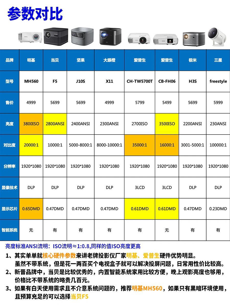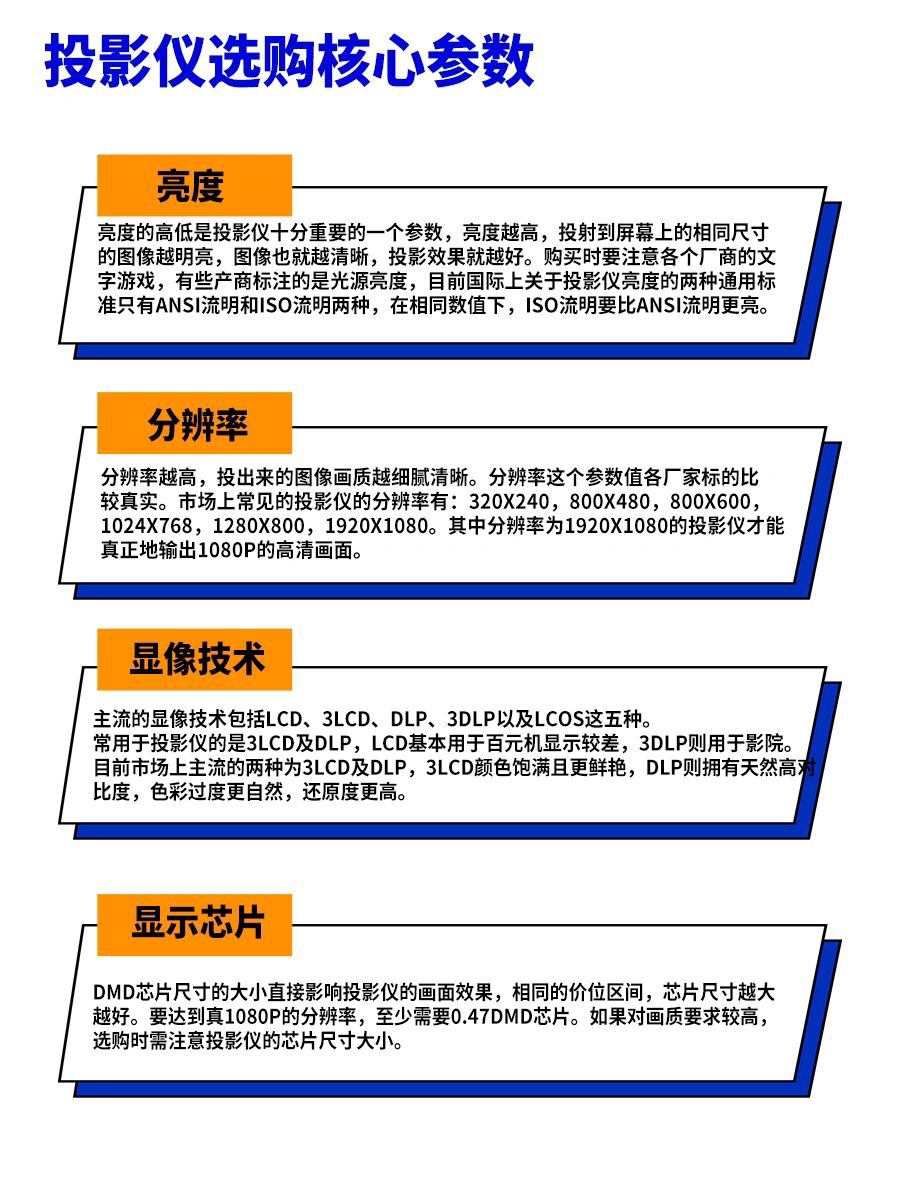 我研究了一段时间,整理了一些关于投影仪的核心参数供大家参考,大家采购时避免踩雷。 一、亮度 亮度越高,投射到屏幕上的相同尺寸的图像越明亮,图像也就越清晰,投影效果就越好。购买时要注意各个厂商的文字游戏,有些产商标注的是光源亮度,目前国际上关于投影仪亮度的两种通用标准只有ANSI流明和ISO流明两种,在相同数值下,ISO流明要比ANSI流明更亮。 二、分辨率 分辨率越高,投出来的图像画质越细...