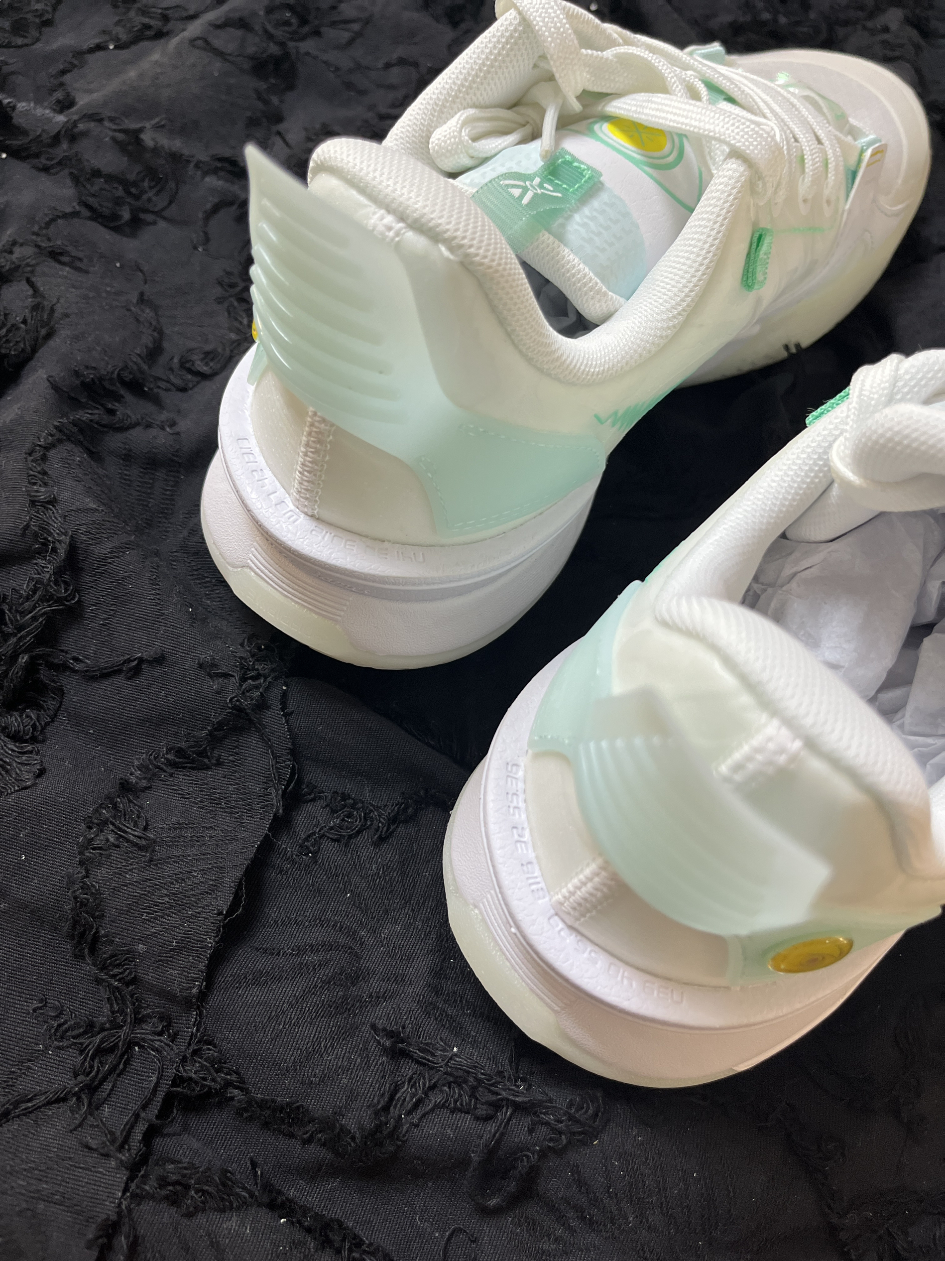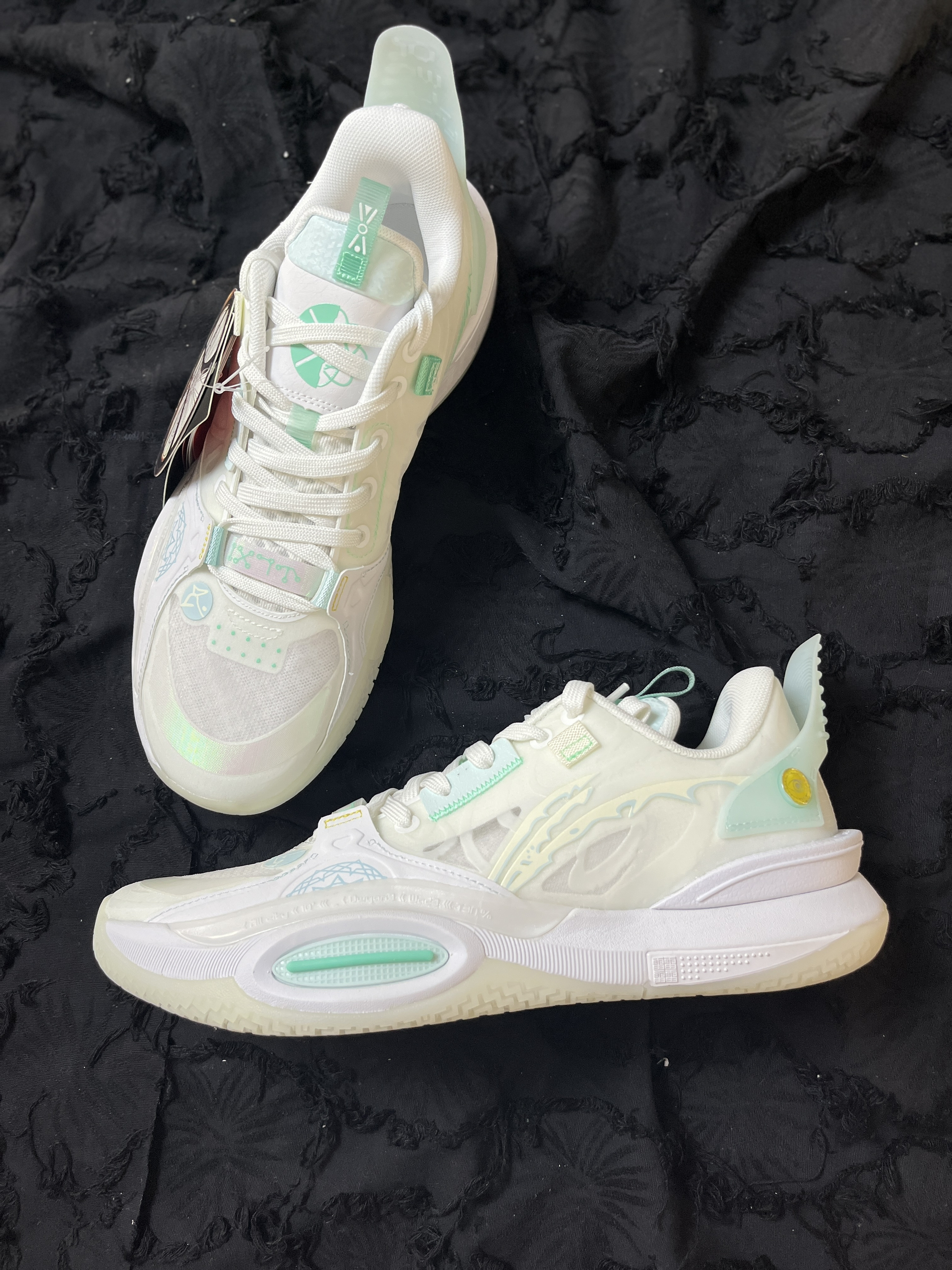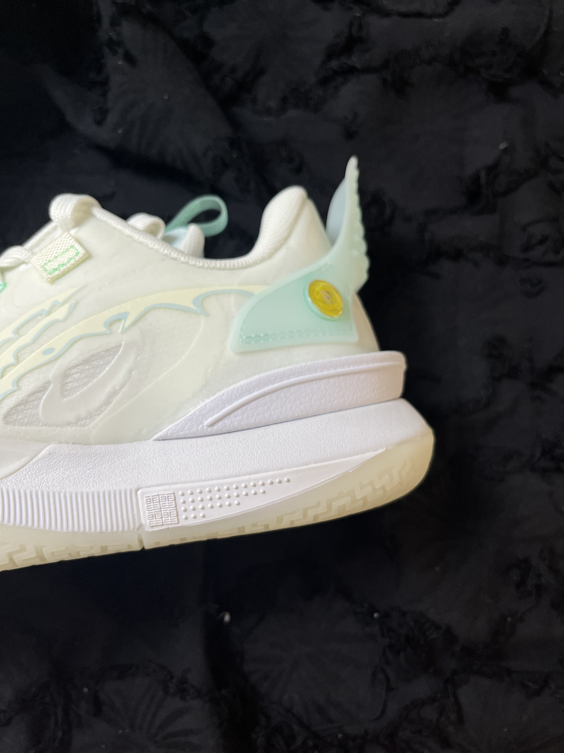 东毒西鞋今日分享:LiNing李宁全城10 元神 回弹减震低帮实战篮球鞋标准白 🧗♀️鞋面采用白色浅绿色拼接组成。外环看着更加的清爽。鞋面采用织物合成革TPU的材质,透气舒适很适合夏天去穿它。而且鞋面和大底采用了夜光材料,在光线稍弱的地方就能显现出比较强烈的“绿光”很有特点。全掌䨻科技能够让你感受到来自中底的回馈。
