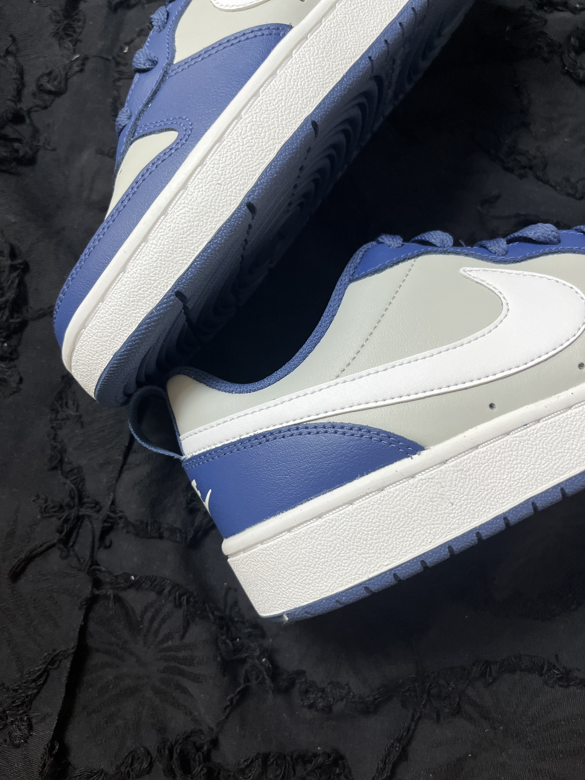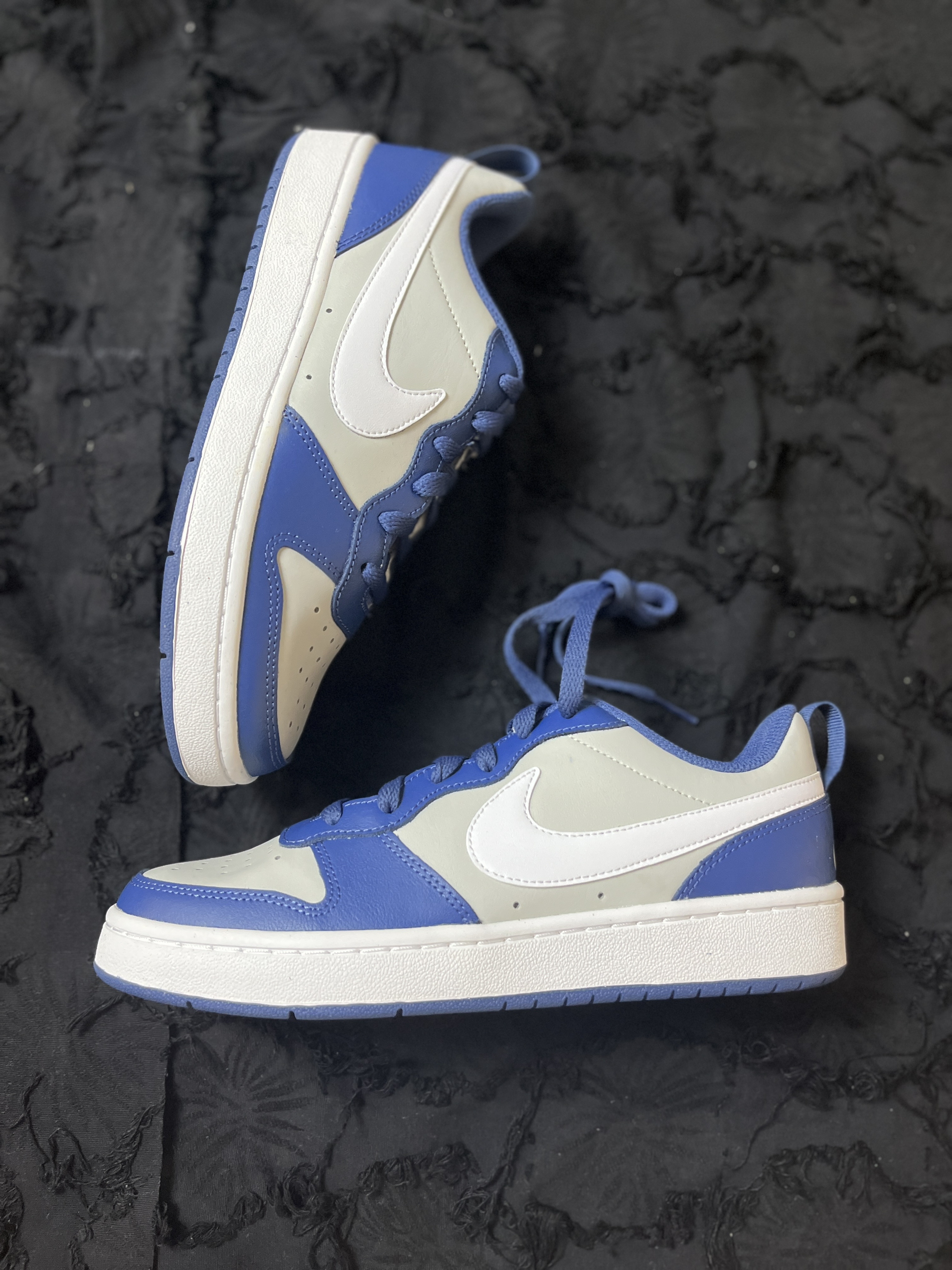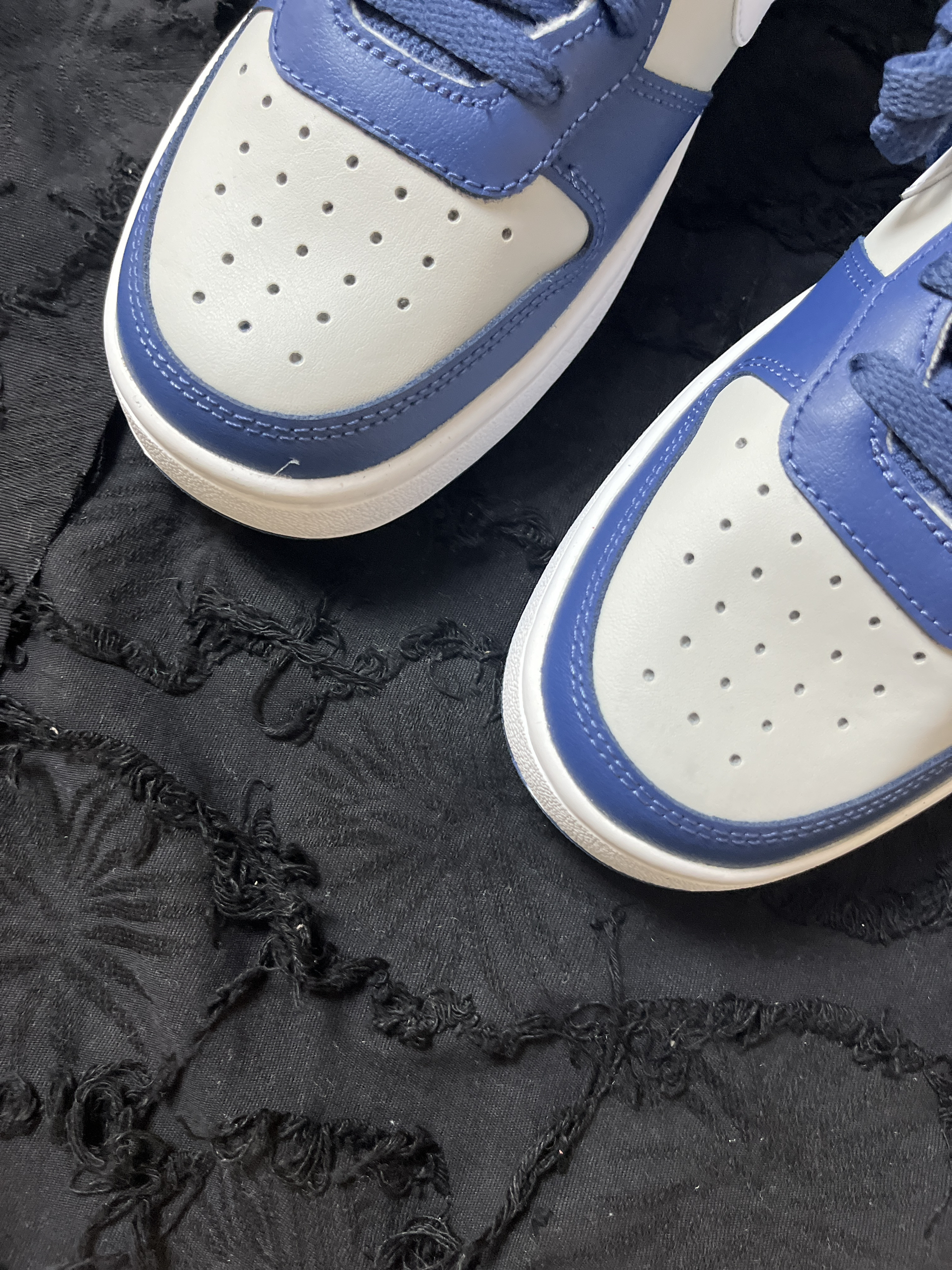 东毒西鞋今日分享:Nike Court Borough Low2(GS)轻便耐磨低帮休闲板鞋海军蓝 🧗♀️鞋面采用灰色为底色海蓝色做框架,白色进行点缀。外观颜值也是不错的。鞋面采用合成革的材质,透气还一般,海蓝色的橡胶大底也是耐磨防滑的。价格非常的合适,性价比超高的一款鞋子。