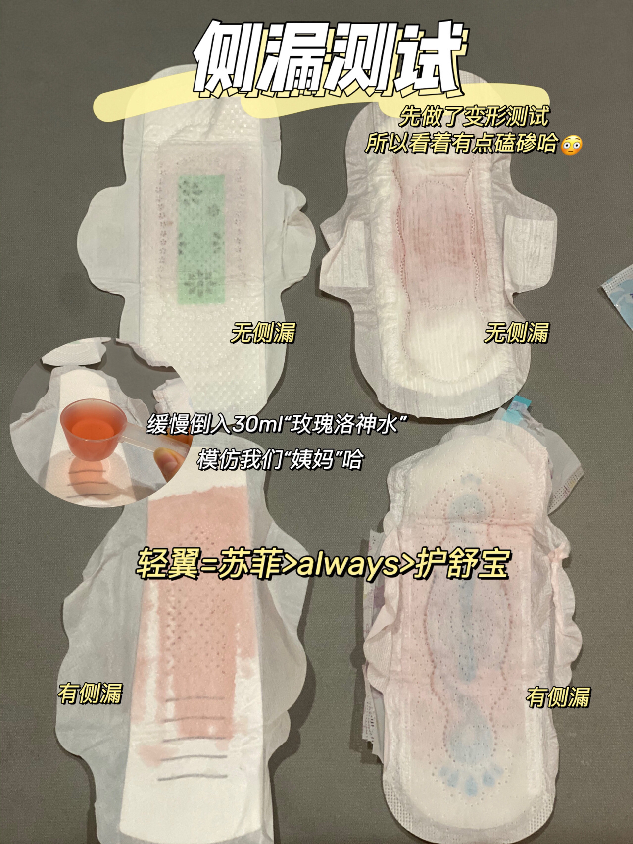 测评好好玩哎 分为4个部分 分别是【shen漏测试】、【变形测试】、【吸水后厚度测试】、和【吸水后干爽程度测试】 这次参与测评有四款: Always液体卫生巾、苏菲弹力贴身、light wings轻翼卫生巾、护舒宝云感棉 为了节约 - 我先做了变形测试 然后做了剩下的测试 。 【侧漏测试】 轻翼=苏菲>Always>护舒宝 【吸水后干爽测试】 轻翼>护舒宝>always>苏菲 【吸水后厚度测试】 ...