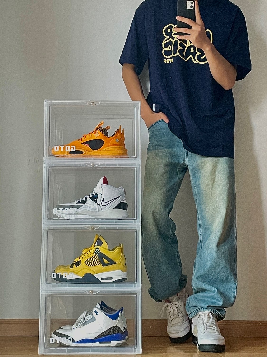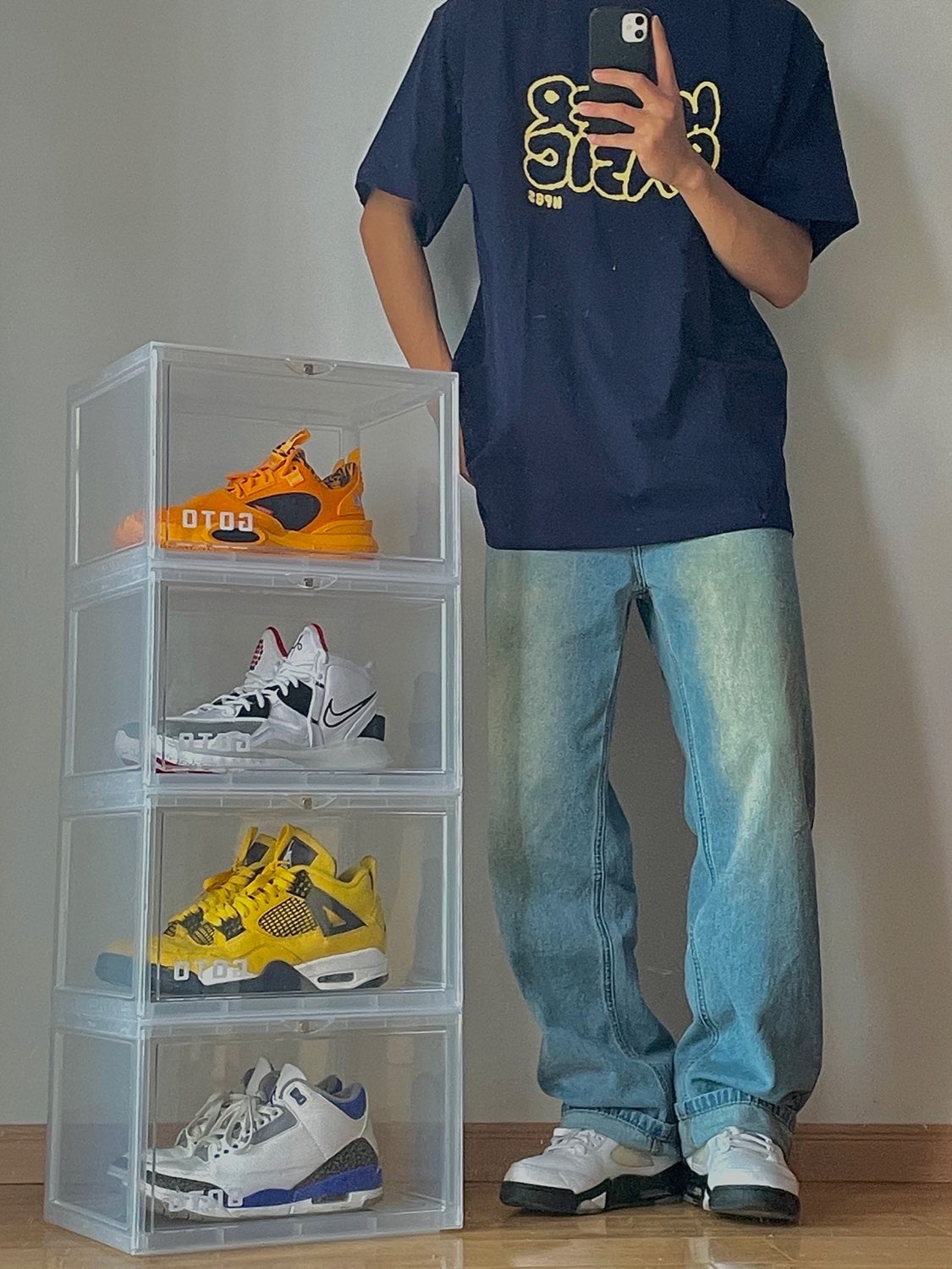 兄弟们怕球鞋氧化的,一定要放在球鞋收纳盒里,不仅美观自己看着舒服,而且能有效防止球鞋氧化,有条件的放一小袋干燥剂在里头更好,把对自己有着特殊意义的球鞋放在盒子里,也是对球鞋的一种尊重。仪式感一下子就来了。