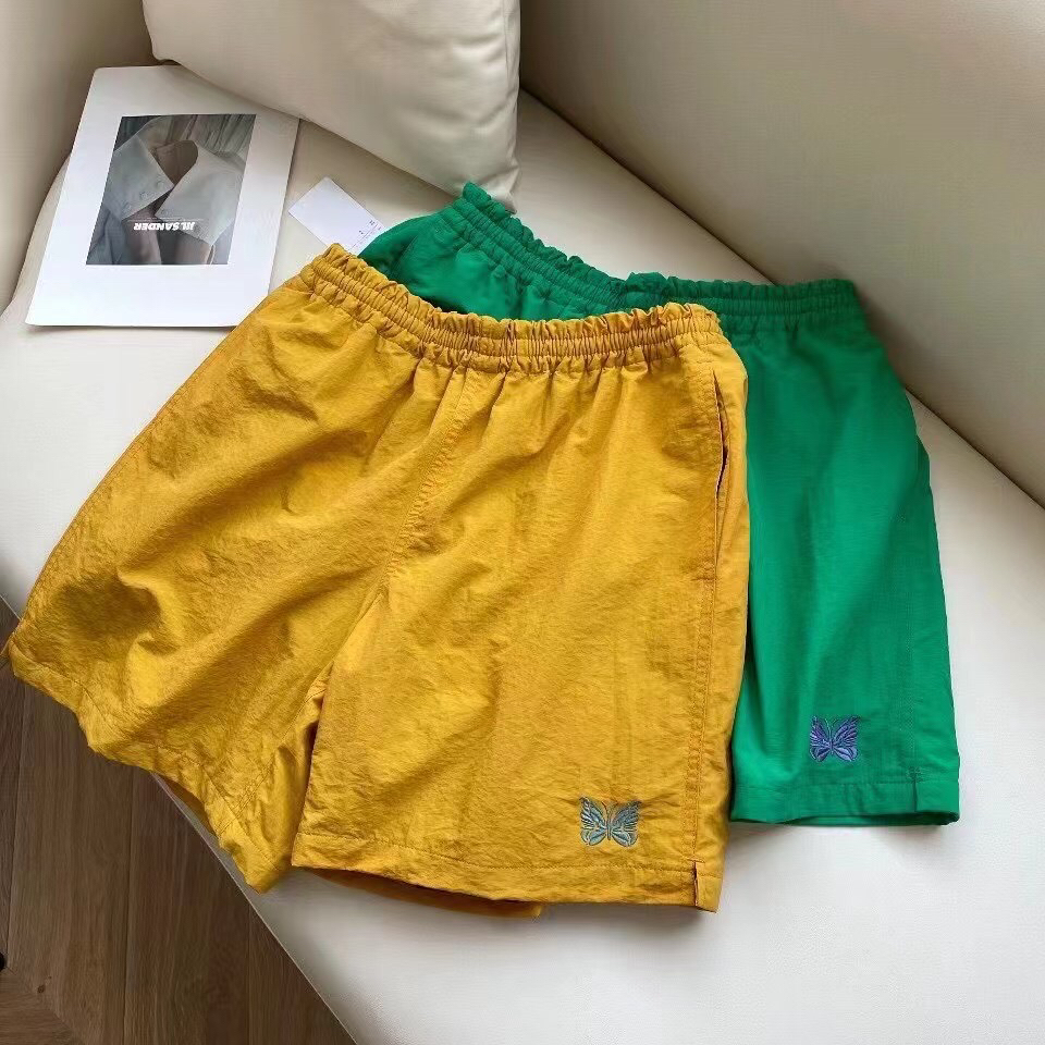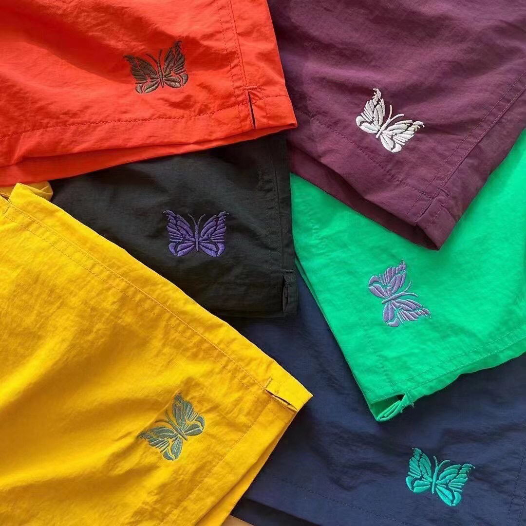 BEAMS x NEEDLES联名款纯色蝴蝶刺绣防水速干尼龙沙滩五分裤短裤22SS日系宽松Cityboy。 小众的日式街头品牌,调性很不错,这次和BMS的联乘也是年度话题度单品了,很推荐入手,速干防水很适合夏日,经典的蝴蝶刺绣logo,简单好穿的纯色短裤 黑色,藏青色,黄色,橘红色,黄色,紫色