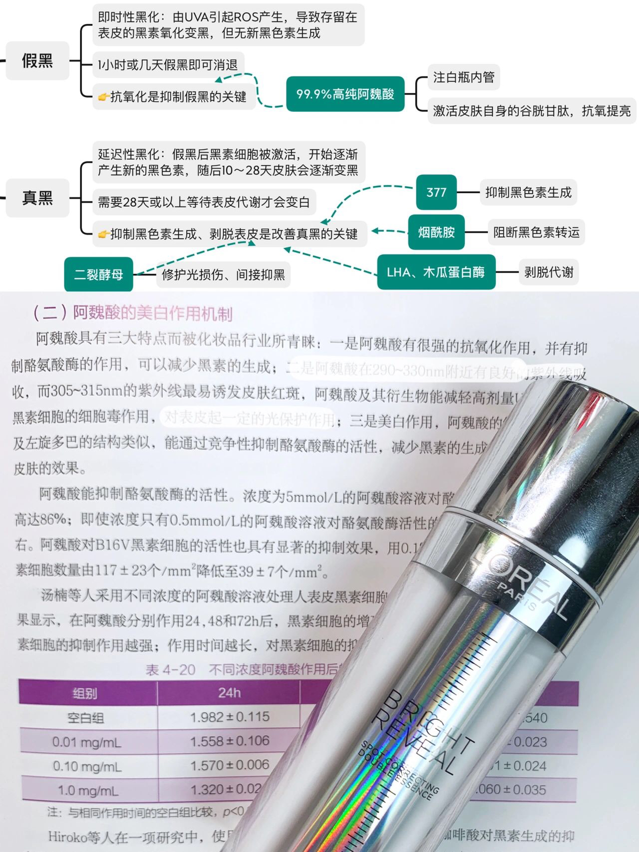 🥷欧莱雅注白瓶在刚上市的时候被批“死贵不如买旧款光子瓶”。当你了解假黑的概念,才懂它和光子瓶对美白的理解,已经不在同一个次元。 ⚠️一个毁三观的冷知识:皮肤变黑也分假黑和真黑。 👉以日晒黑化来举例: ▪️假黑学术上叫“即时性黑化”。UVA引起有害自由基产生,导致黑素细胞中的黑色素开始氧化变黑、运转到表皮上,皮肤一下就变黑了。但万幸的是,这期间皮肤没有产生新的黑色素,这样的变黑只会持续1小时或几天,...