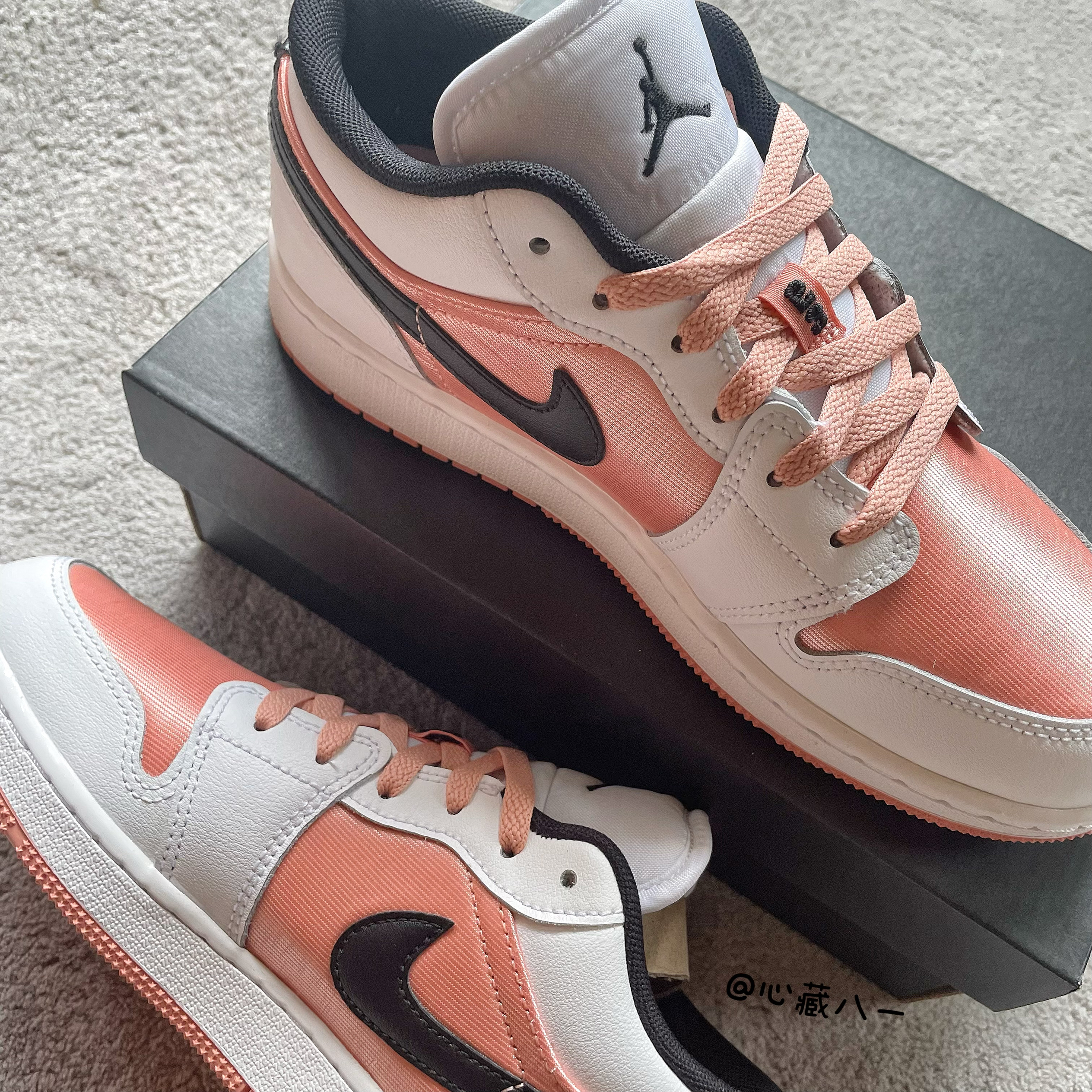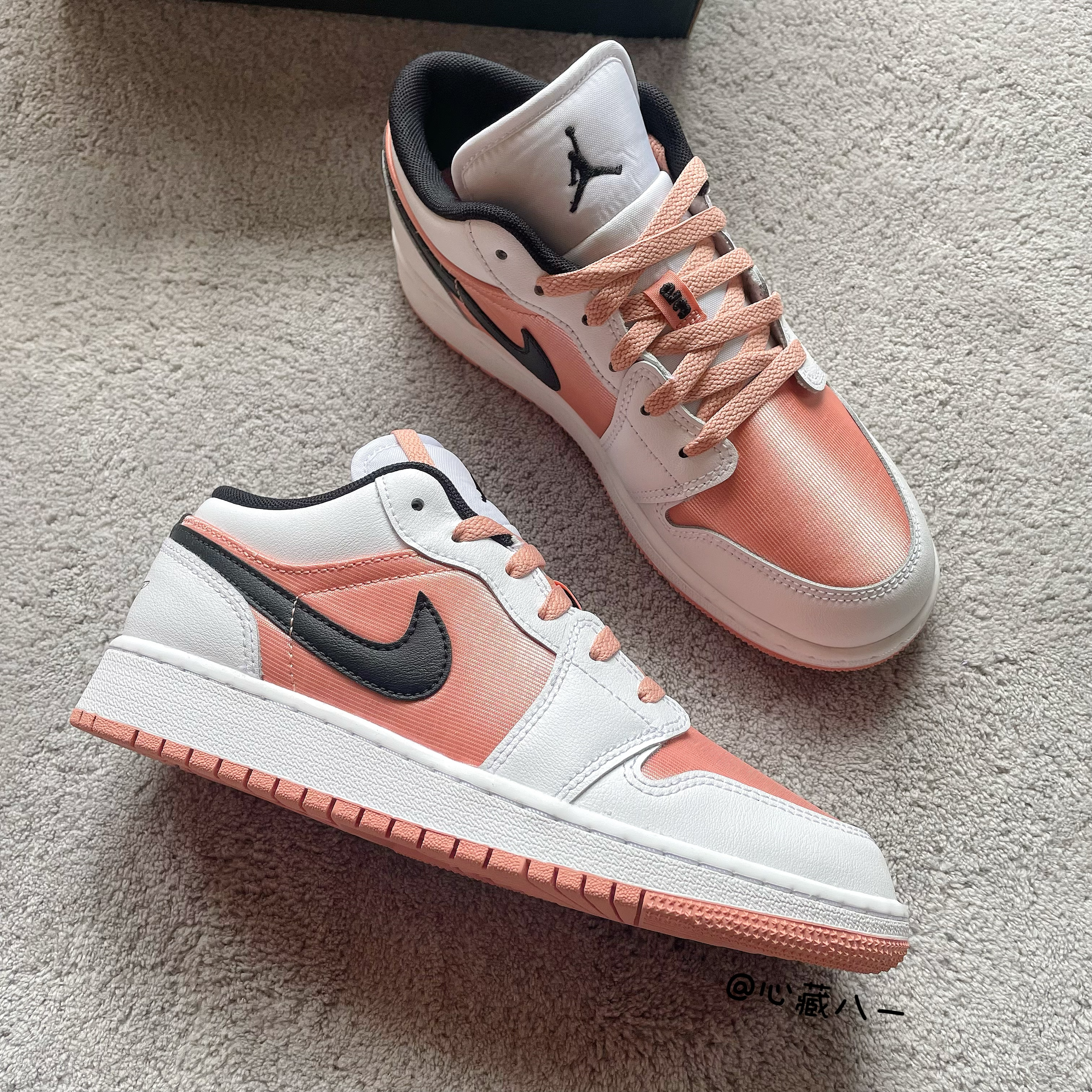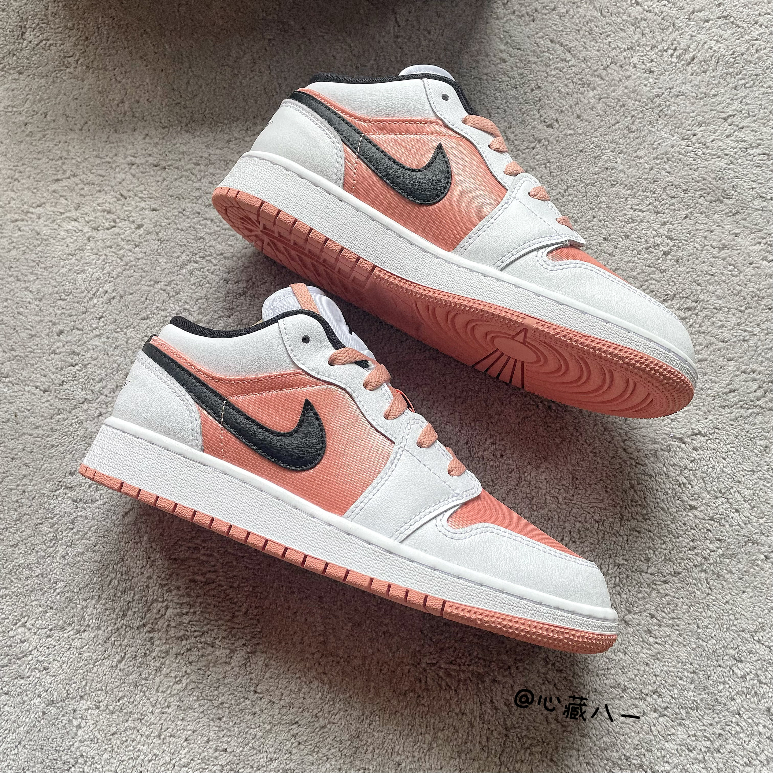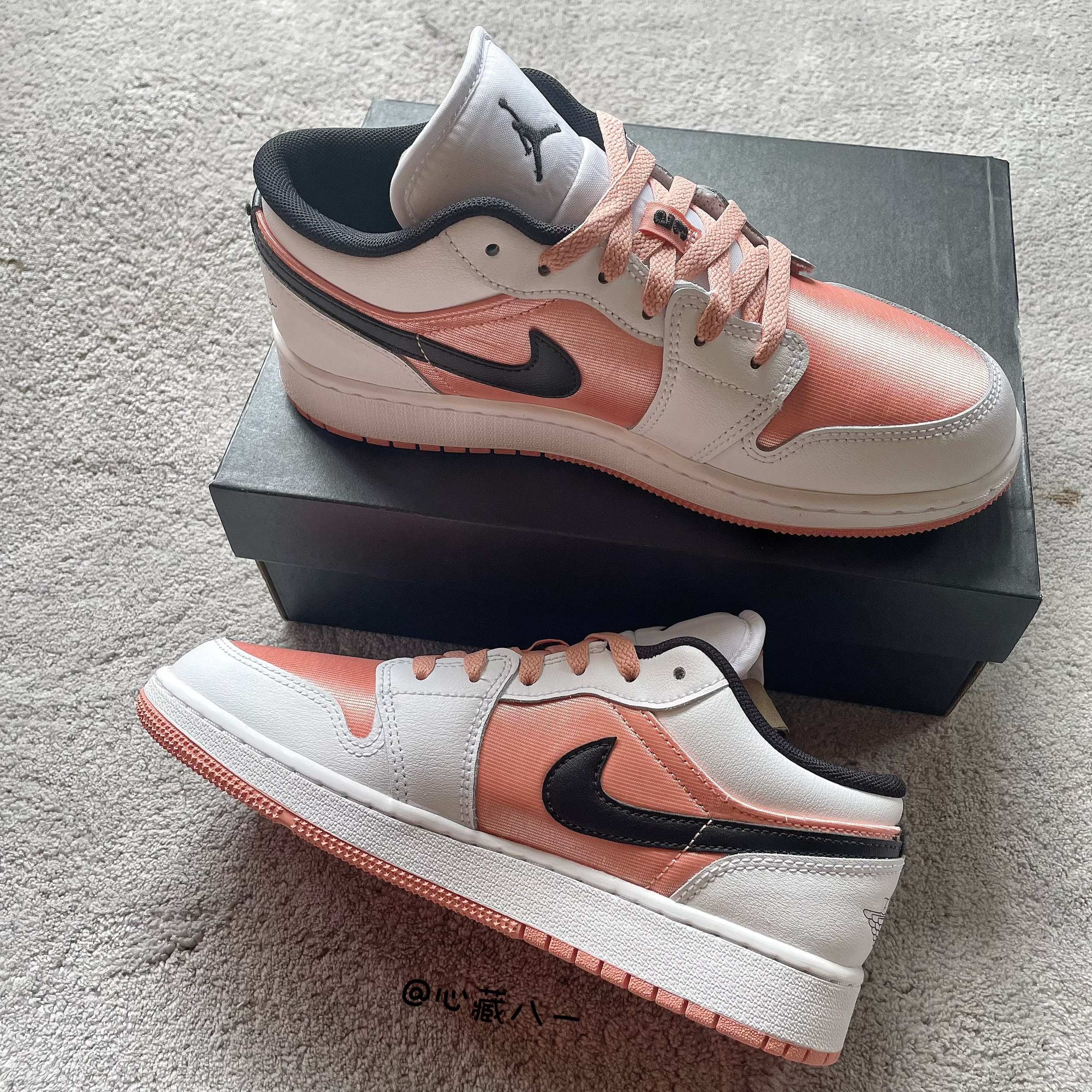 心藏八一今日分享宝藏女鞋:Air Jordan 1 Low (GS) 复古篮球鞋 白粉黑 鞋面部分以白色皮革勾勒整个鞋身框架,鞋头和鞋身中部采用了粉色金属质感的织物材质,鞋身两侧的Swoosh由黑色皮革呈现!鞋舌上的Jmpman和粉色固定扣上的数字“23”都用黑色刺绣进行点缀!而后跟部分的黑色 飞翼 Logo使用了压印工艺! 夏日穿搭必备单品!!!