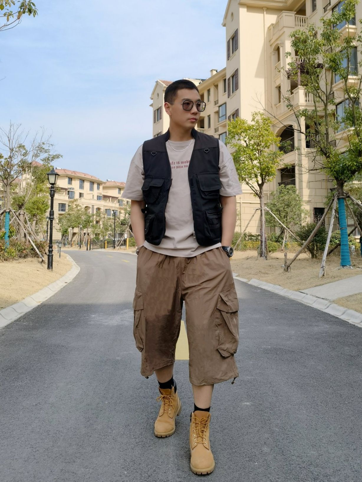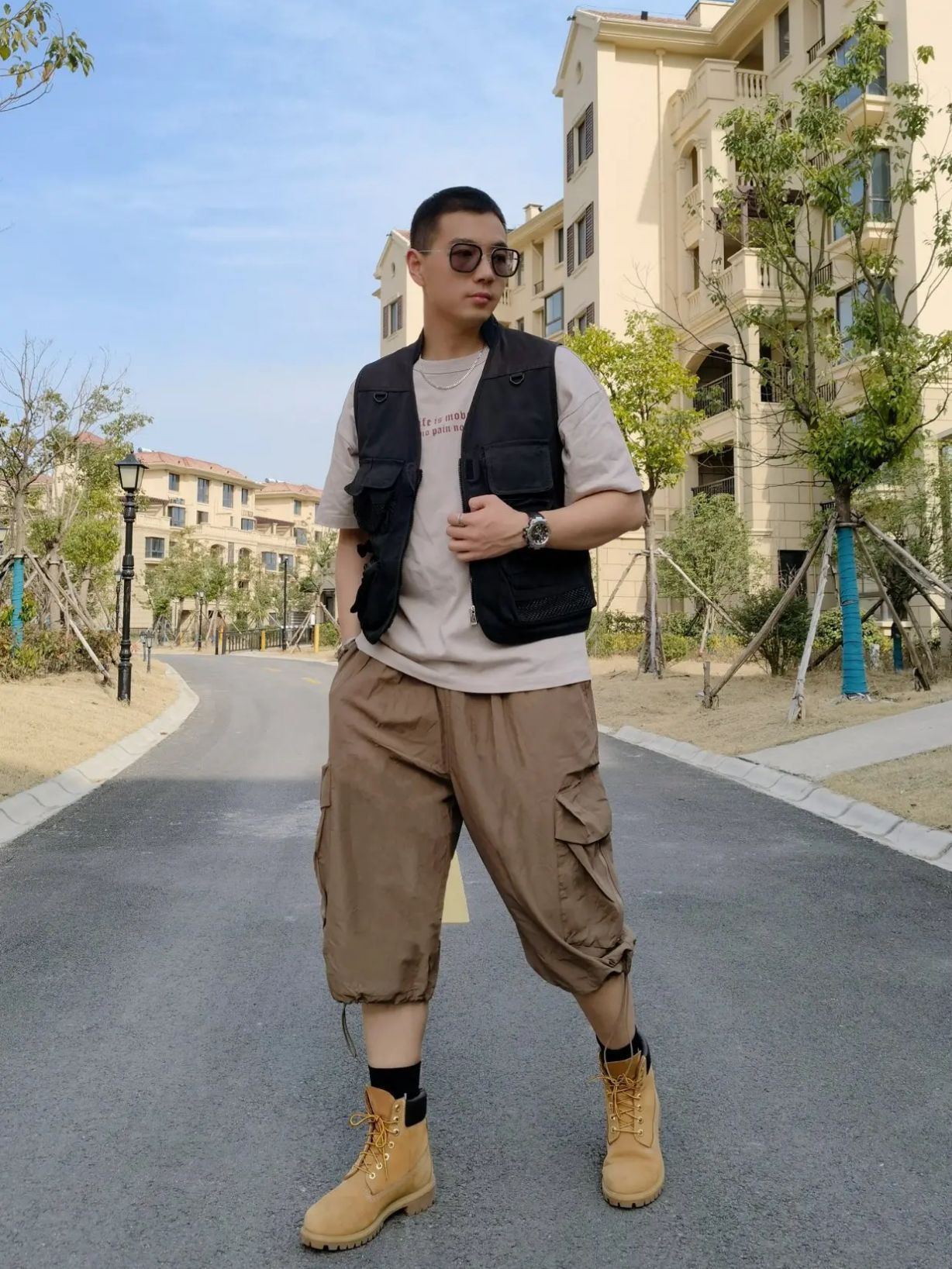 hello 大家好,这里是撒旦锅锅 💗179cm/80kg 🌞今日穿搭为工装休闲风格 搭配类型:马甲+短袖+工装七分裤+大黄靴 墨镜、马甲同属黑色系,可以增加整体的层次感,T恤为浅卡其,裤子深卡其,利用不同的饱和度也能产生色差效果,为可以与黑色形成一个对比,再加一双添柏岚大黄靴,工装的氛围就出来了。 今日穿搭 ⌚:CASIO 👕:MUSCLE(L) 👖:NOTHOMME(L) 👟:Temberl...