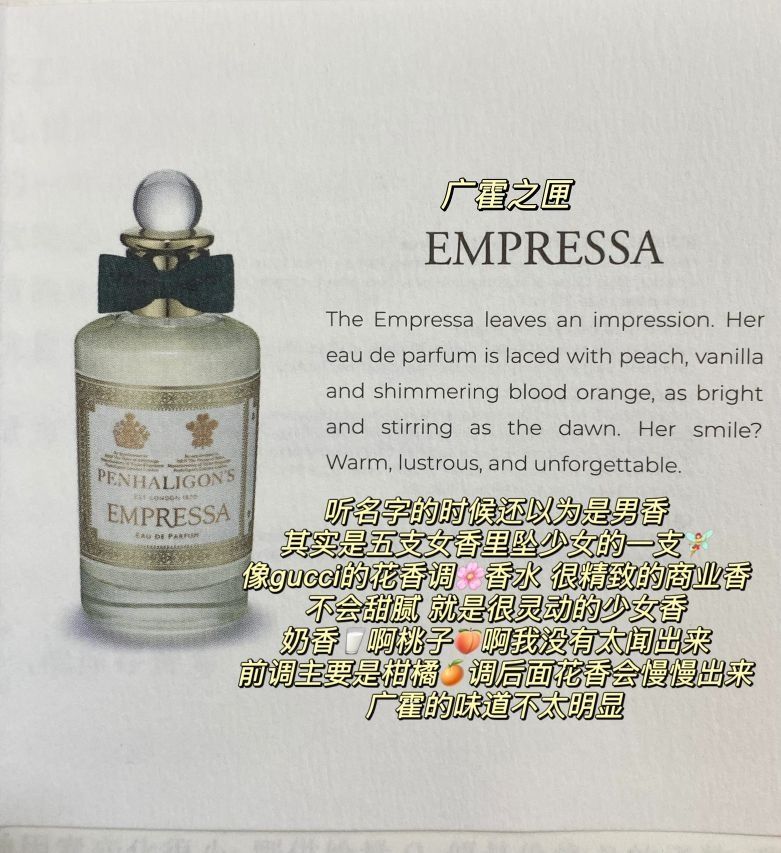 内附狐狸与无人区玫瑰、一轮玫瑰、玫瑰之水、柏林少女对比(最后两张图)🥳 前几天送男朋友的香水小样套装🎁被我拿来试香啦 这个套装有5⃣️支男香 5⃣️支女香 这一期我会专门讲解里面的五支女香 如果说有想要入手一支潘海利根的香水,但对这个牌子的香水不太了解的姐妹,那你们可一定要看这一期啦!👀 ———————————————————————— 🤍广霍之匣 前调:血橙、香柠檬、橘子、桃子、粉...