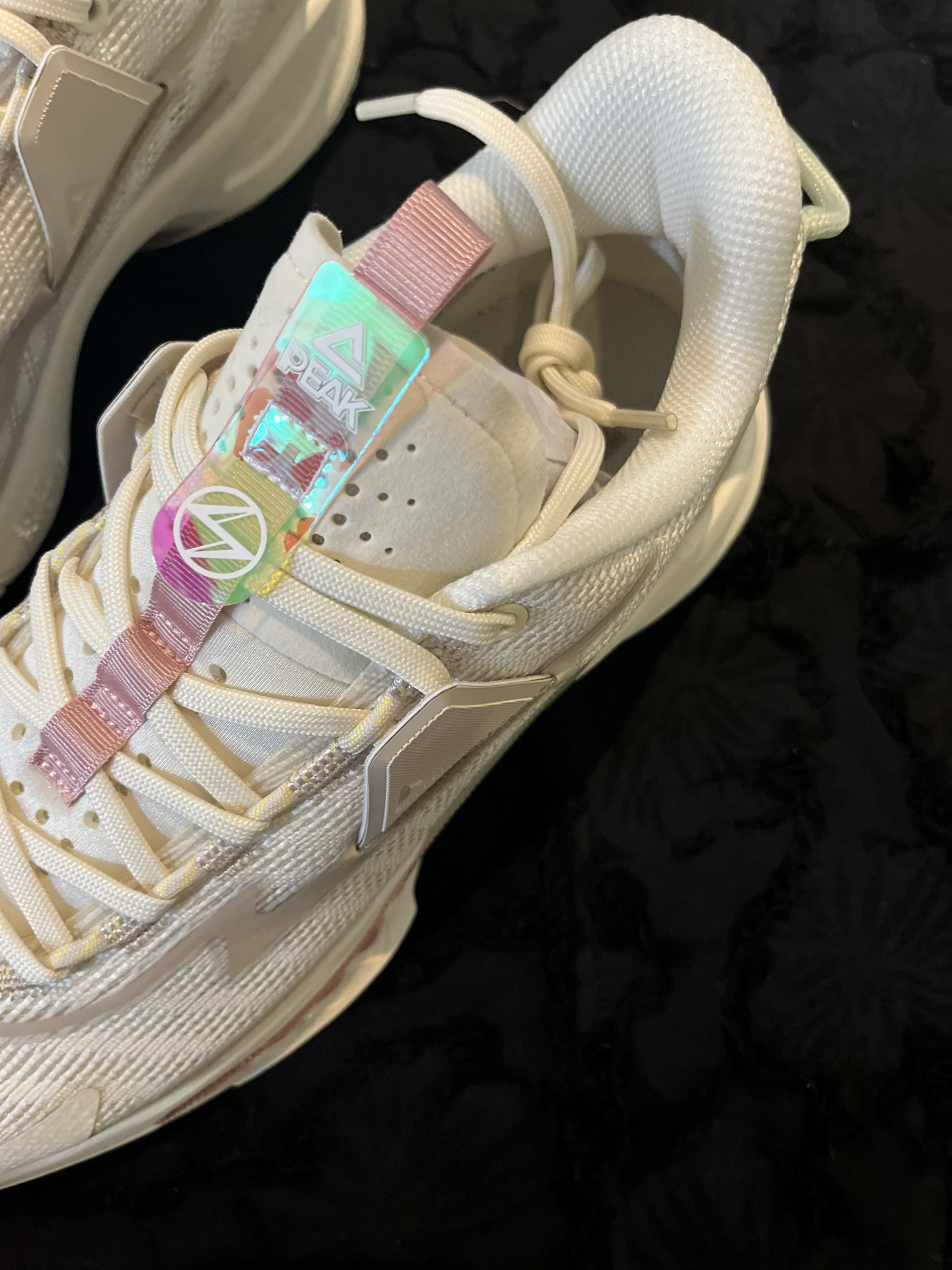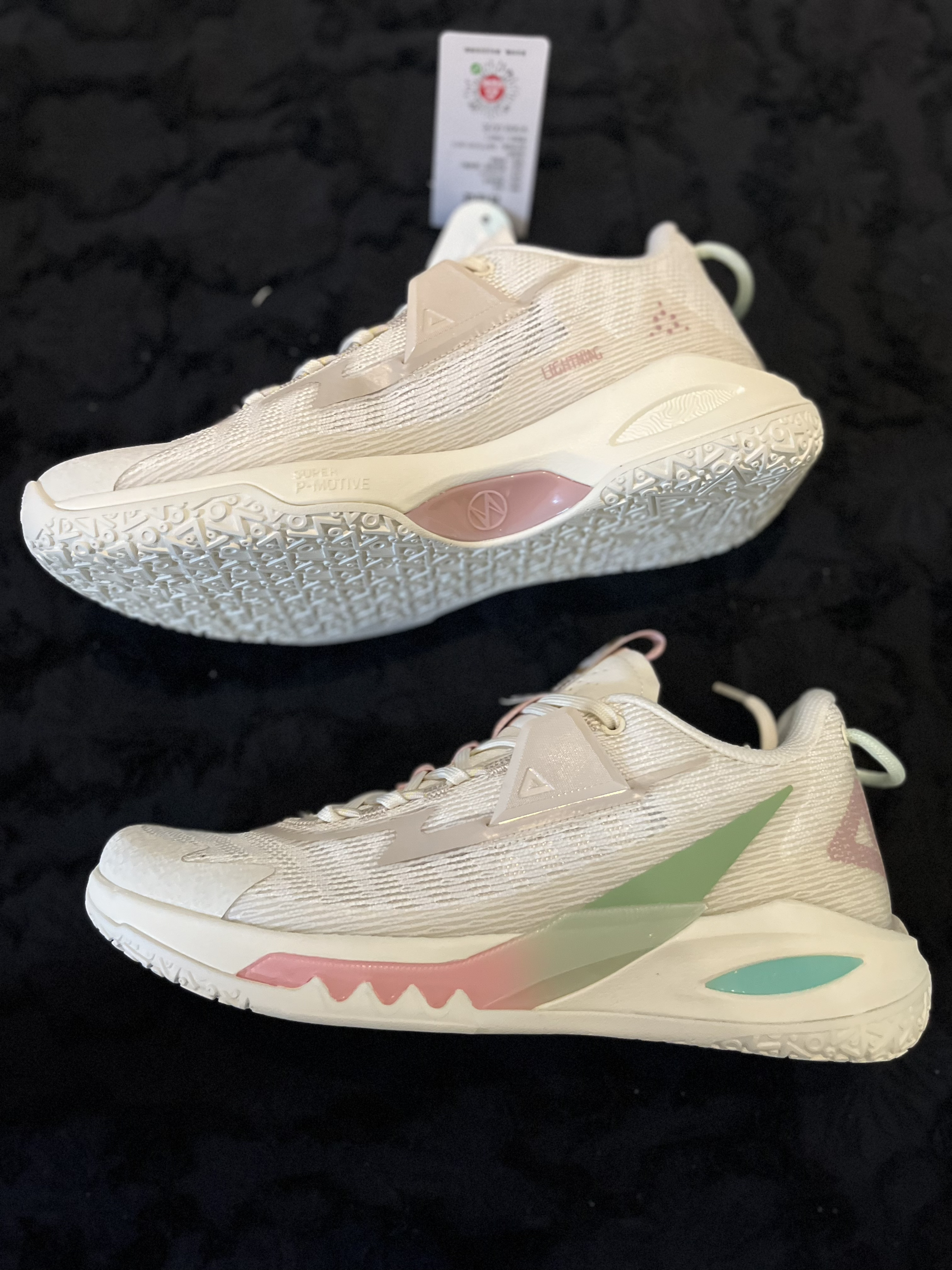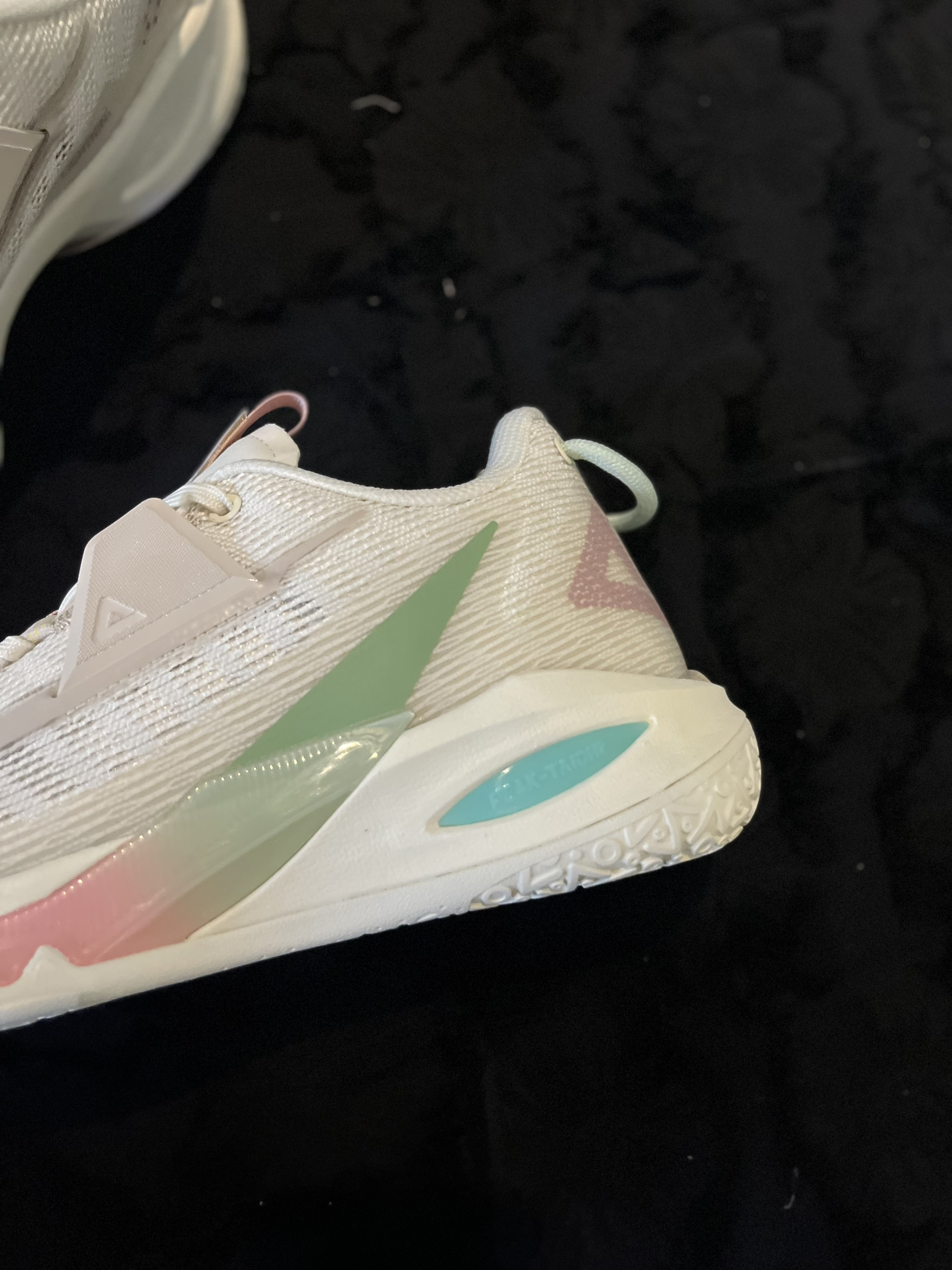 东毒西鞋今日分享鞋名:匹克态极闪电9透气防滑低帮实战篮球鞋帆布白 彩虹冰糕 鞋面采用米白色为主要颜色,绿色粉色点缀,鞋子清新好看。织物合成革TPU的鞋面材质。透气性能还是不错的。 中底采用一模双密的缓震科技,使鞋子更加舒适。侧面TPU设计起到一定的防侧翻作用。橡胶大底抓地耐磨力很强。尺码偏大一码。