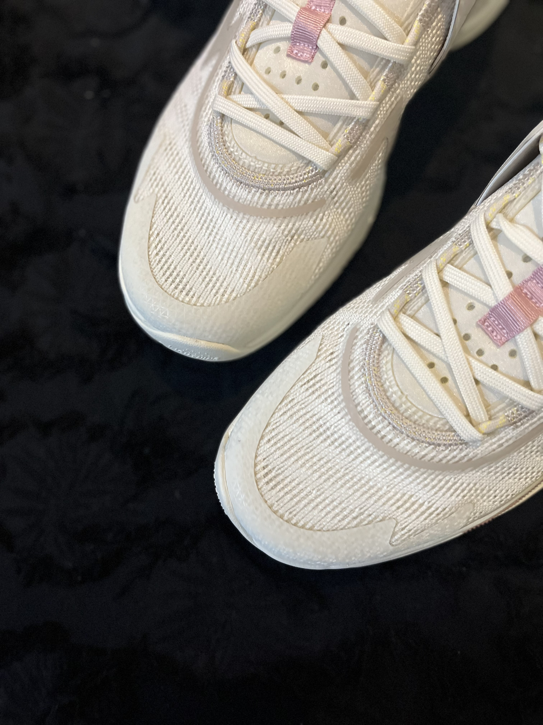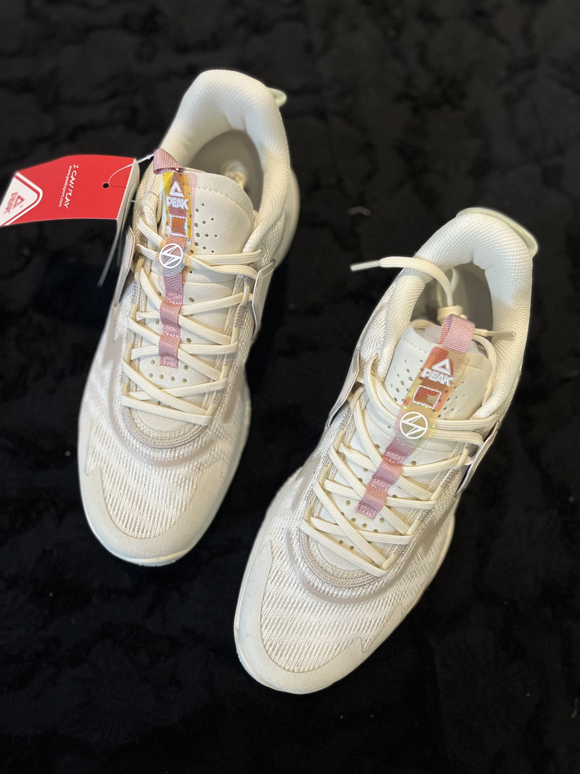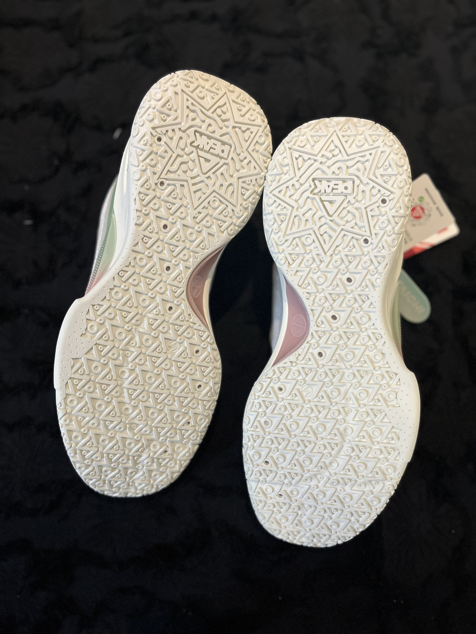 东毒西鞋今日分享鞋名:匹克态极闪电9透气防滑低帮实战篮球鞋帆布白 彩虹冰糕 鞋面采用米白色为主要颜色,绿色粉色点缀,鞋子清新好看。织物合成革TPU的鞋面材质。透气性能还是不错的。 中底采用一模双密的缓震科技,使鞋子更加舒适。侧面TPU设计起到一定的防侧翻作用。橡胶大底抓地耐磨力很强。尺码偏大一码。
