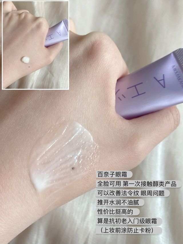 ·百奈子眼霜 我混油 眼周问题不大 但是搞笑女有法令纹 最近A醇比较火 因为喜欢他们家唇膏所以尝试了一下眼霜 肤感我爱 清爽不油腻 想尝试的可以在多做做功课 (我还会在每次上妆前涂 这样防止眼下卡纹 后续底妆也会更服帖) ·薇诺娜轻颜瓶 适合敏感肌抗初老 想我这种20打头的年纪天天熬夜真的耐不住岁月 本身熬夜危害就大而且敏感肌比正常肌肤更容易衰老 所以一定要早早使用抗老精华 薇诺娜老牌子了 我是...