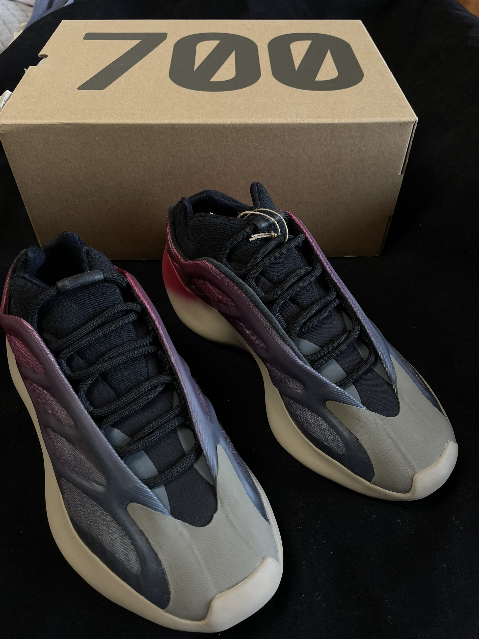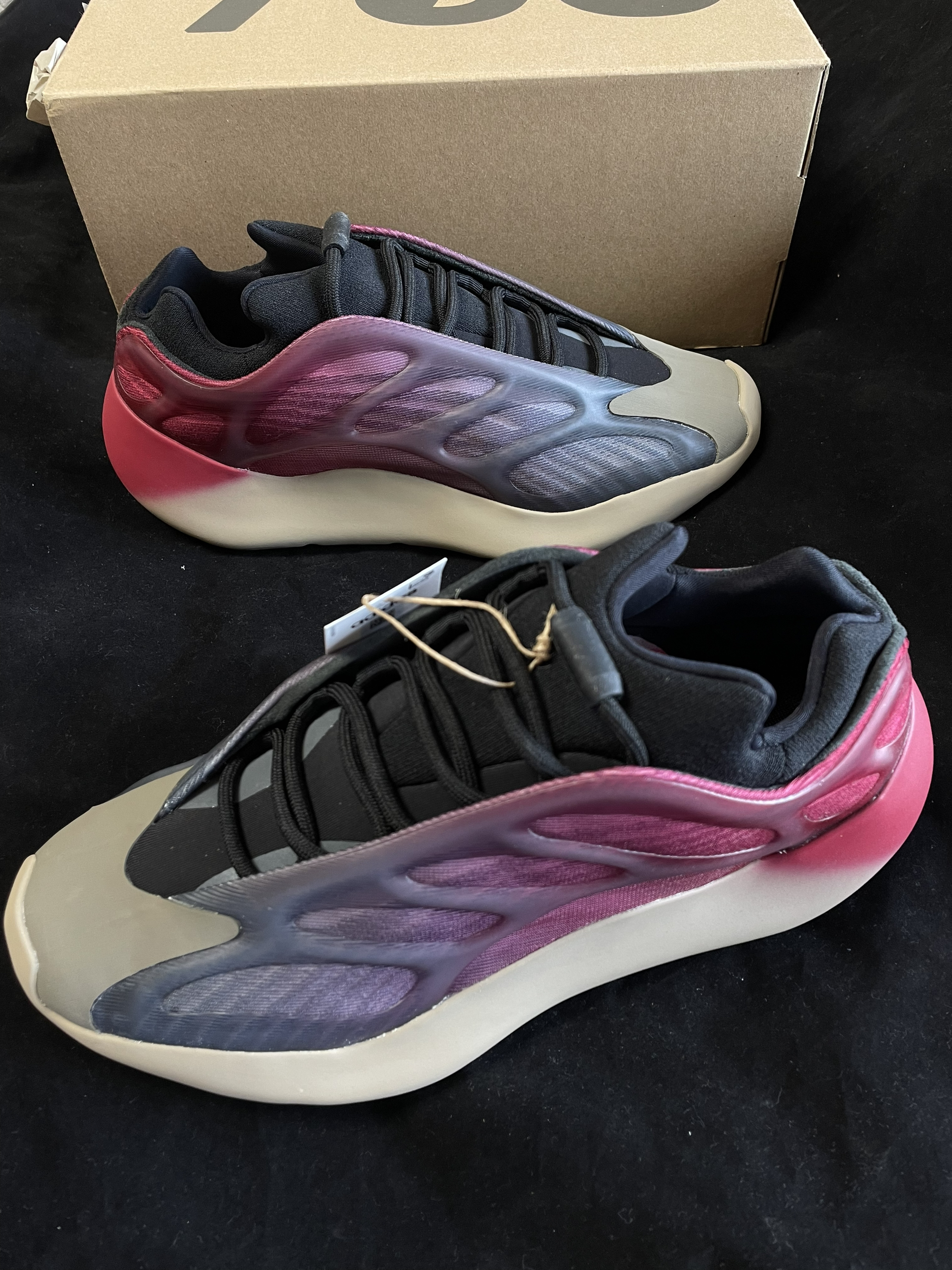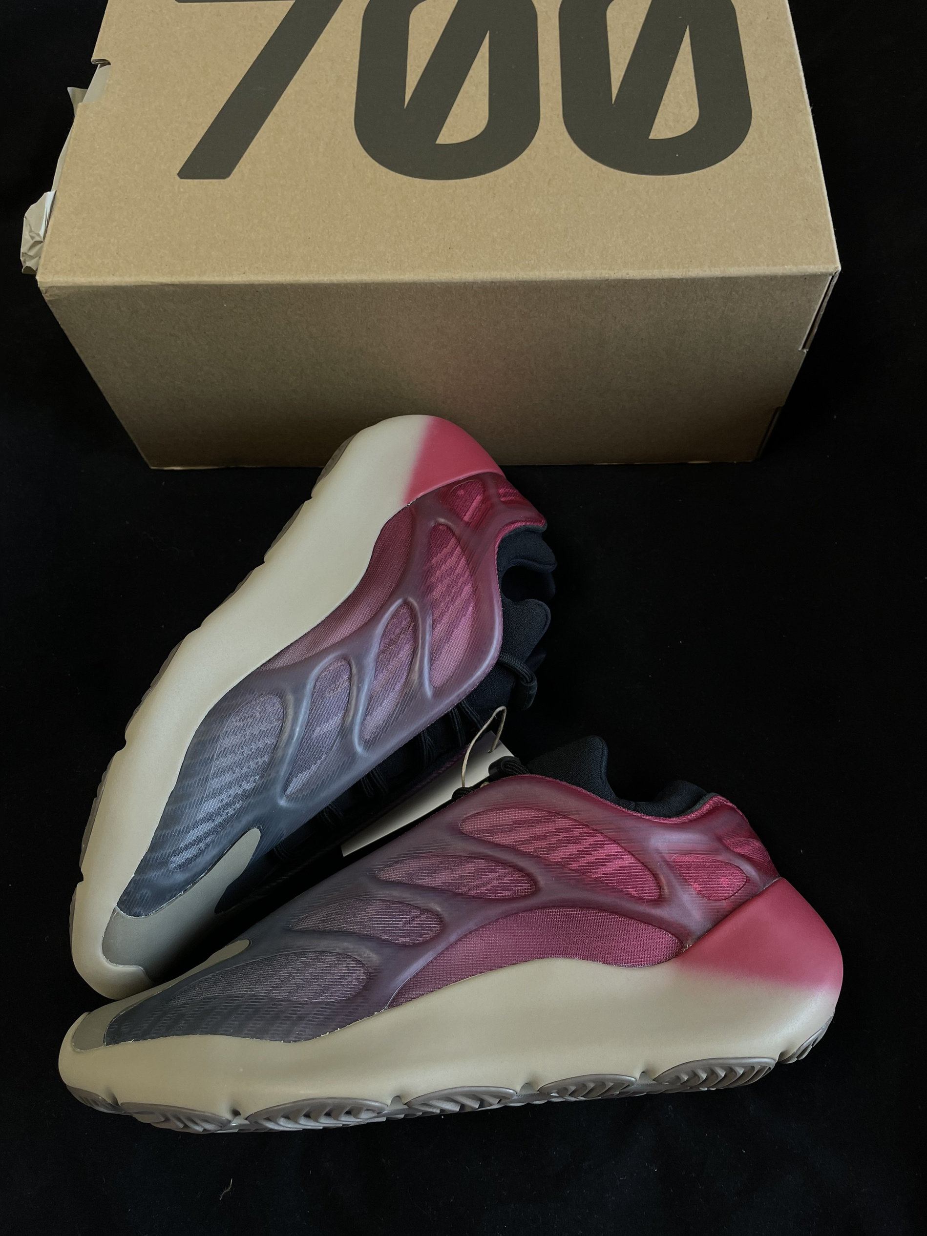 👟:adidas originals Yeezy700 V3"Fade Carbon"蓝粉渐变 霓虹 男女同款 快看!这梦幻颜值有没有吸引到你? Yeezy700V3前卫科幻的鞋面框架采用半透明材料,和蓝粉渐变的鞋面融为一体,整体视觉效果相当亮眼。后跟处粉色大面积晕染到中底,穿在脚上远看,真的像是一双从未来穿越回来的鞋,「赛博朋克」既视感拉满。