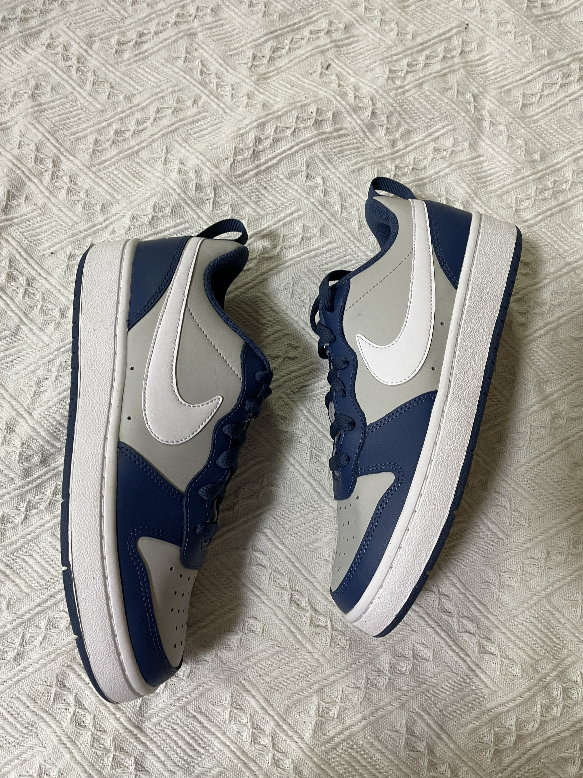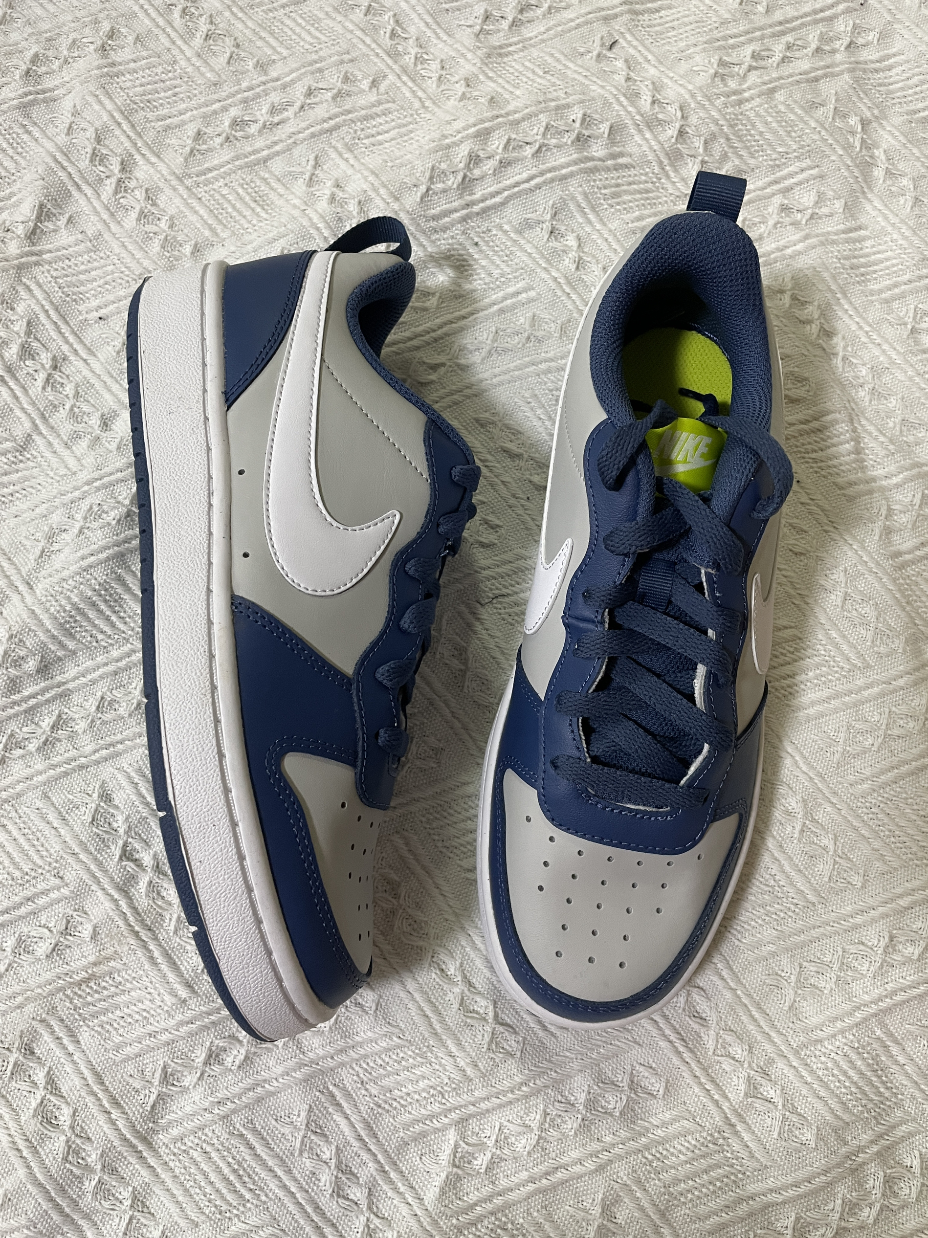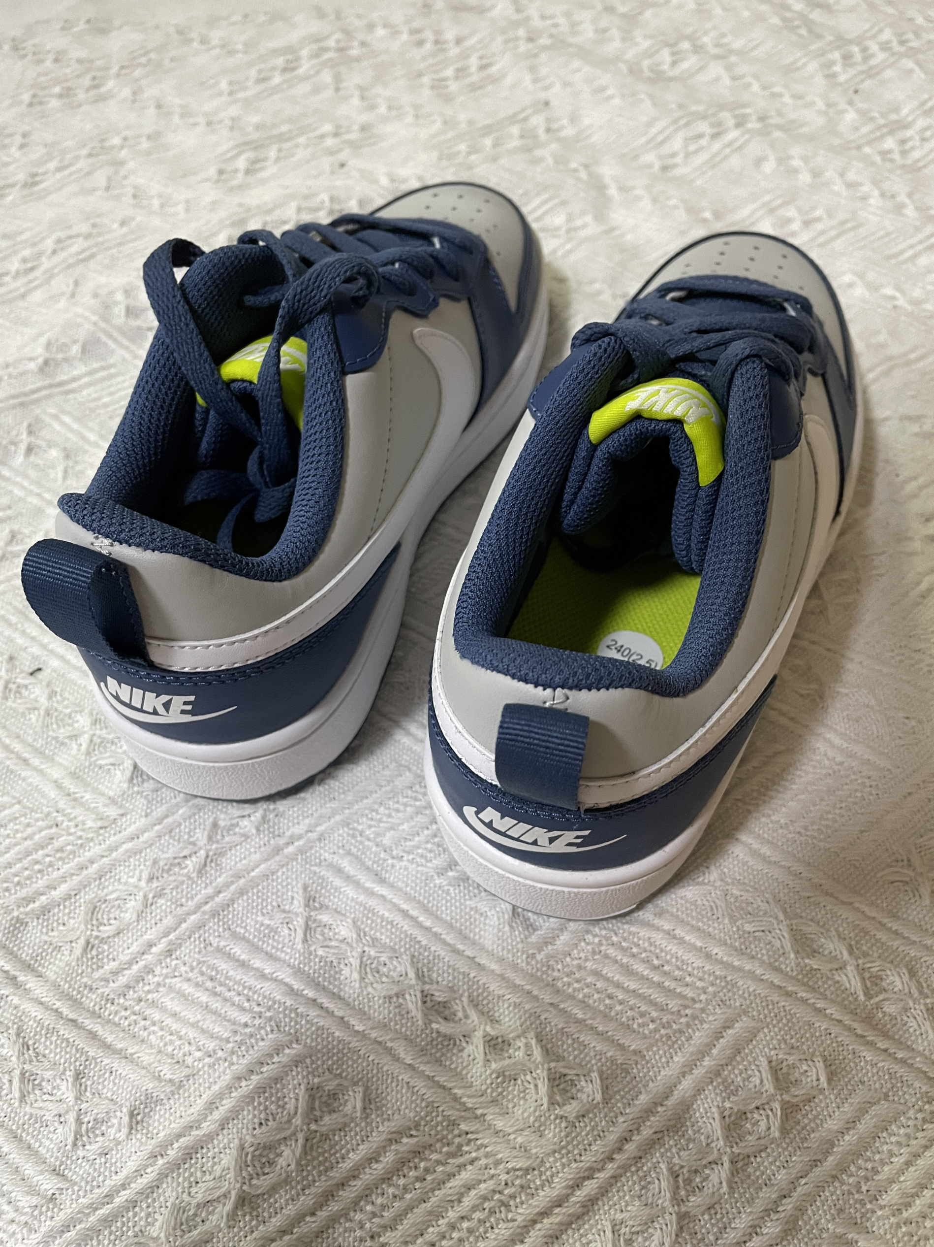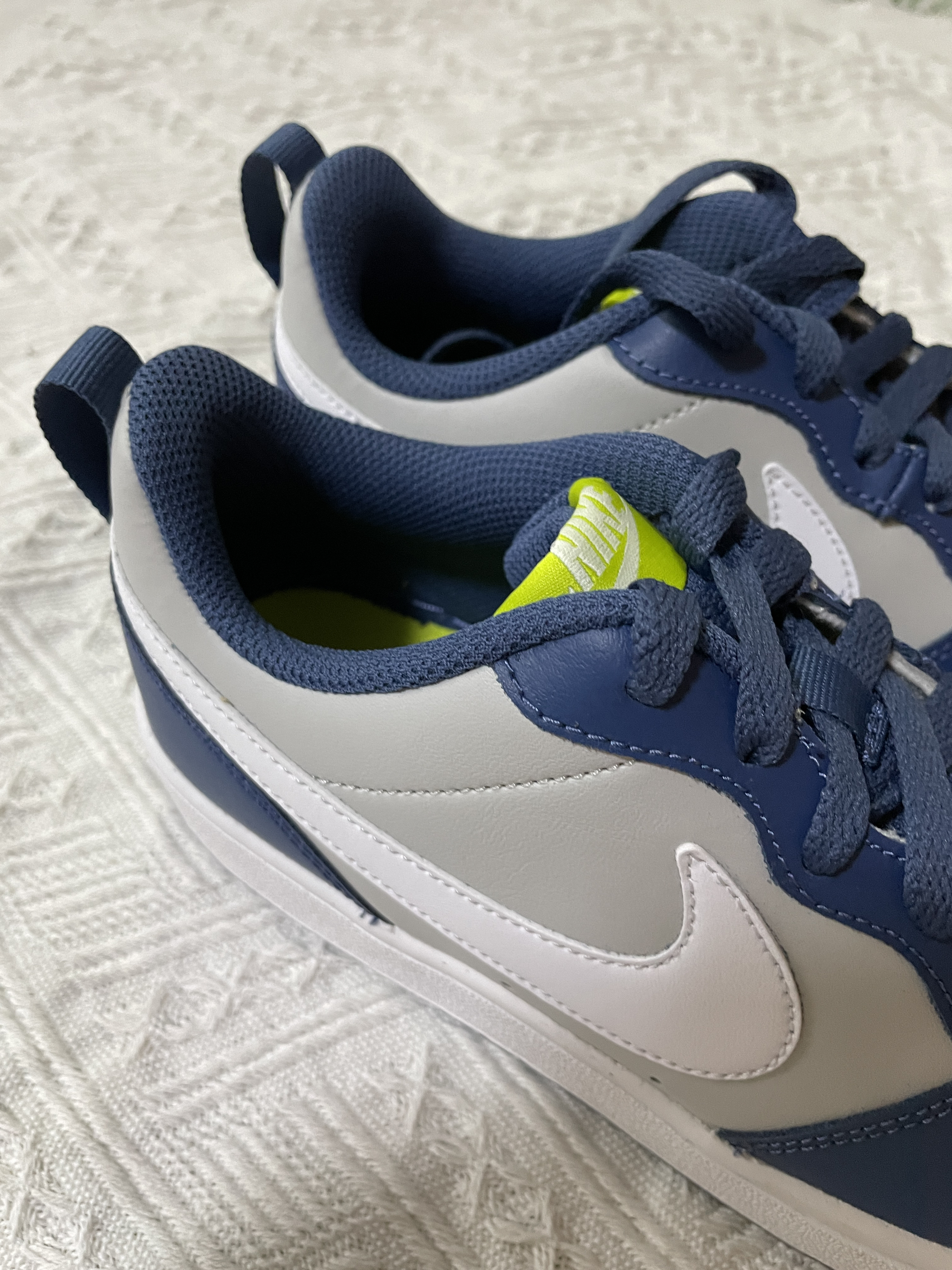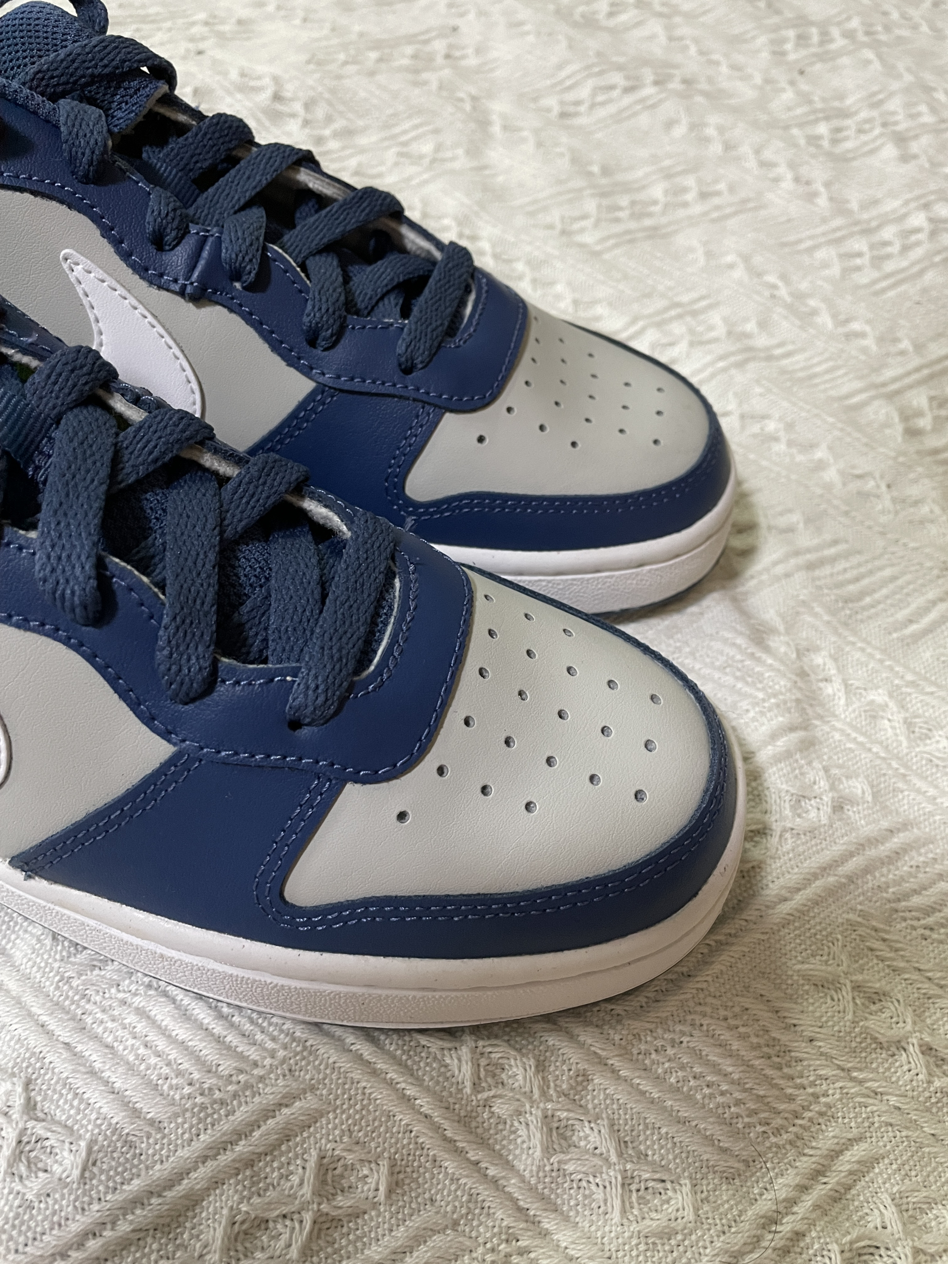 今日分享:Nike Court Borough Low 2 (GS) 轻便耐磨低帮休闲板鞋 海军蓝 鞋子是海军蓝色和灰色搭配组成,外观配色有质感又很时尚 鞋身是皮革材质的,冲孔设计透气性非常好,橡胶大底耐磨防滑,上脚舒适轻便,真的很轻的,性价比也高