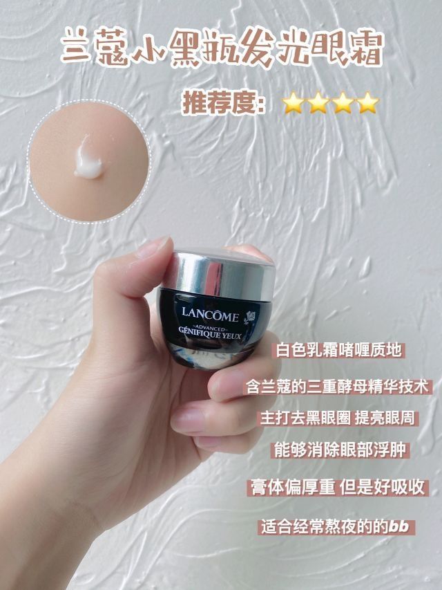 记得涂眼霜 四款热门网红眼霜合集测评来喽|||不会现在还有人不用眼霜吧 我觉得18岁以后的bb就都可以用了呀 眼睛是最能体现一个人年龄的啦 所以眼霜一定要趁早用呀 分享四个我正在用的热门网红眼霜👇🏻👇🏻👇🏻 - 1⃣️兰蔻小黑瓶发光眼霜 基本已经空瓶啦 使用感还不错 膏体有丢丢厚重 但是上眼不会油腻 长时间使用 确实能淡化黑眼圈 消除眼部浮肿也不错 对那种经常熬夜的bb太友好了hhh 推荐度:⭐️...