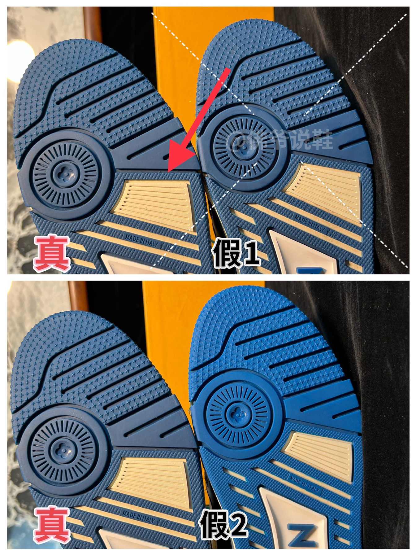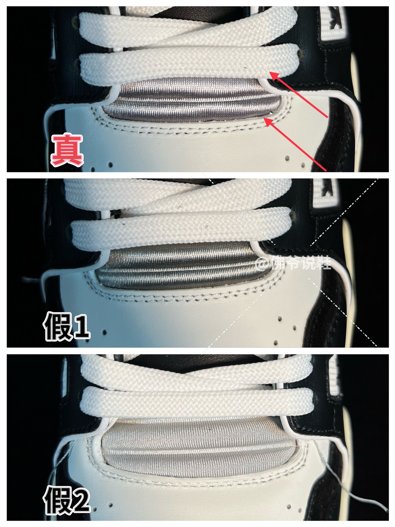 惊呆柜姐的一期,大家一起看看区别在哪里🧐? 越来越多的人喜欢,难免会有踩到雷滴! 💥一些小细节和大家说一说 1 鞋型区别 第一步还是先从整体正侧面看鞋头、后跟弧度 鞋身6根长线,均会碰到地面 2 鞋头区别 鞋头连接鞋面视觉轻微下榻、整体平整 一圈走线针距、每一针规则有序 蓝色部分两种图案组成,白色部分纹理亦是 黑色皮料纹理洁晰细膩,光泽感更强 3 鞋舌区别 logo先压印出轮廓,再喷漆(灰...