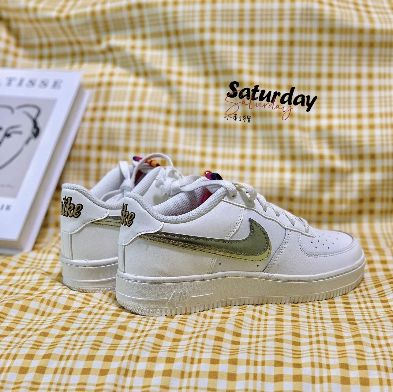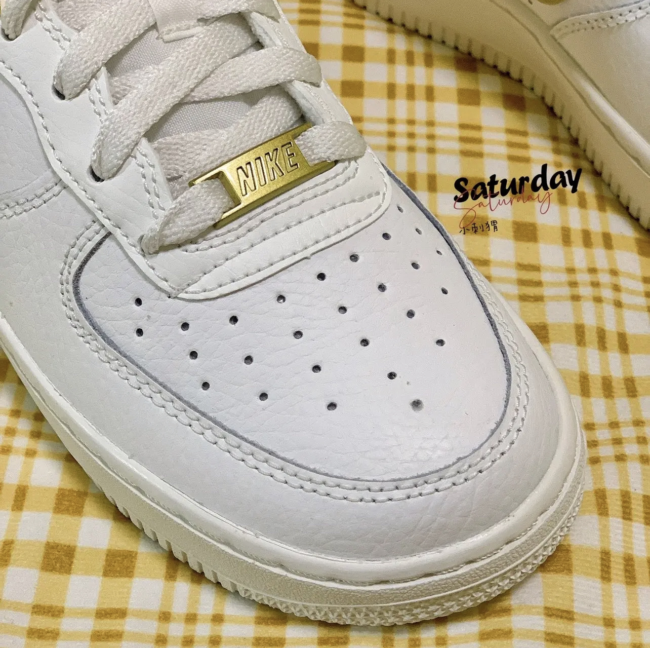 🌵配色细节:白色为主色调,金色银色饰面的双格纹 Swoosh,特别有设计感,鞋绳处也是采用的金色银色 的“Air Force 1”标识,鞋舌上方有彩色双色带点 缀,后跟处的“Nike”1ogo不同于以往版本,有点涂 鸦的感觉。 🌵材质:鞋面采用的是皮革材质,鞋面透气孔增强了 鞋面的透气性,中底采用的是Air Sole气垫,橡胶大 底,耐磨性强。