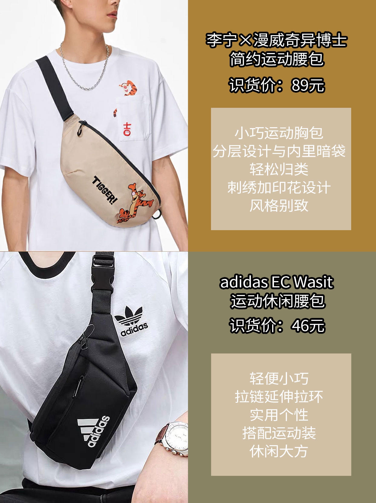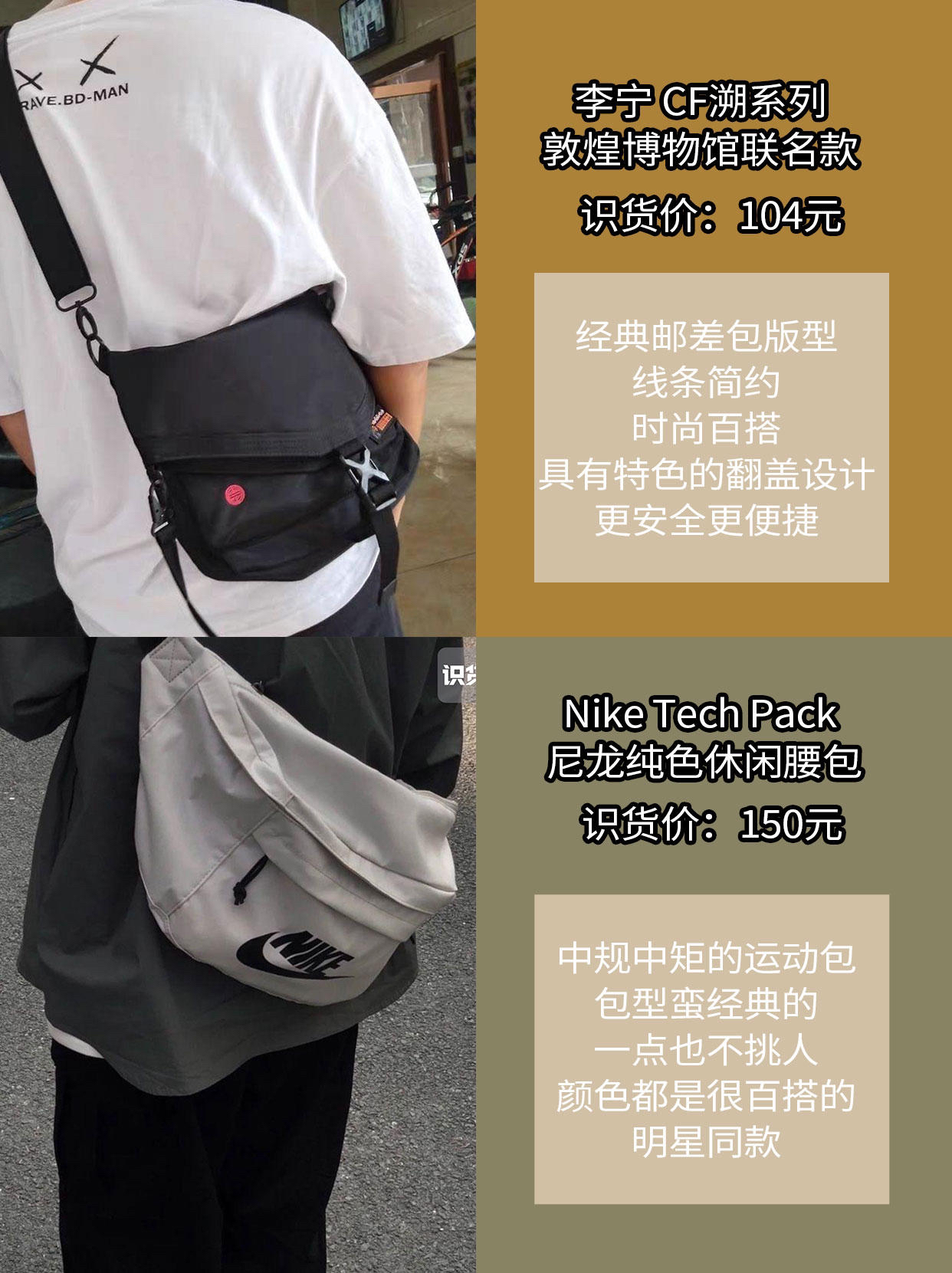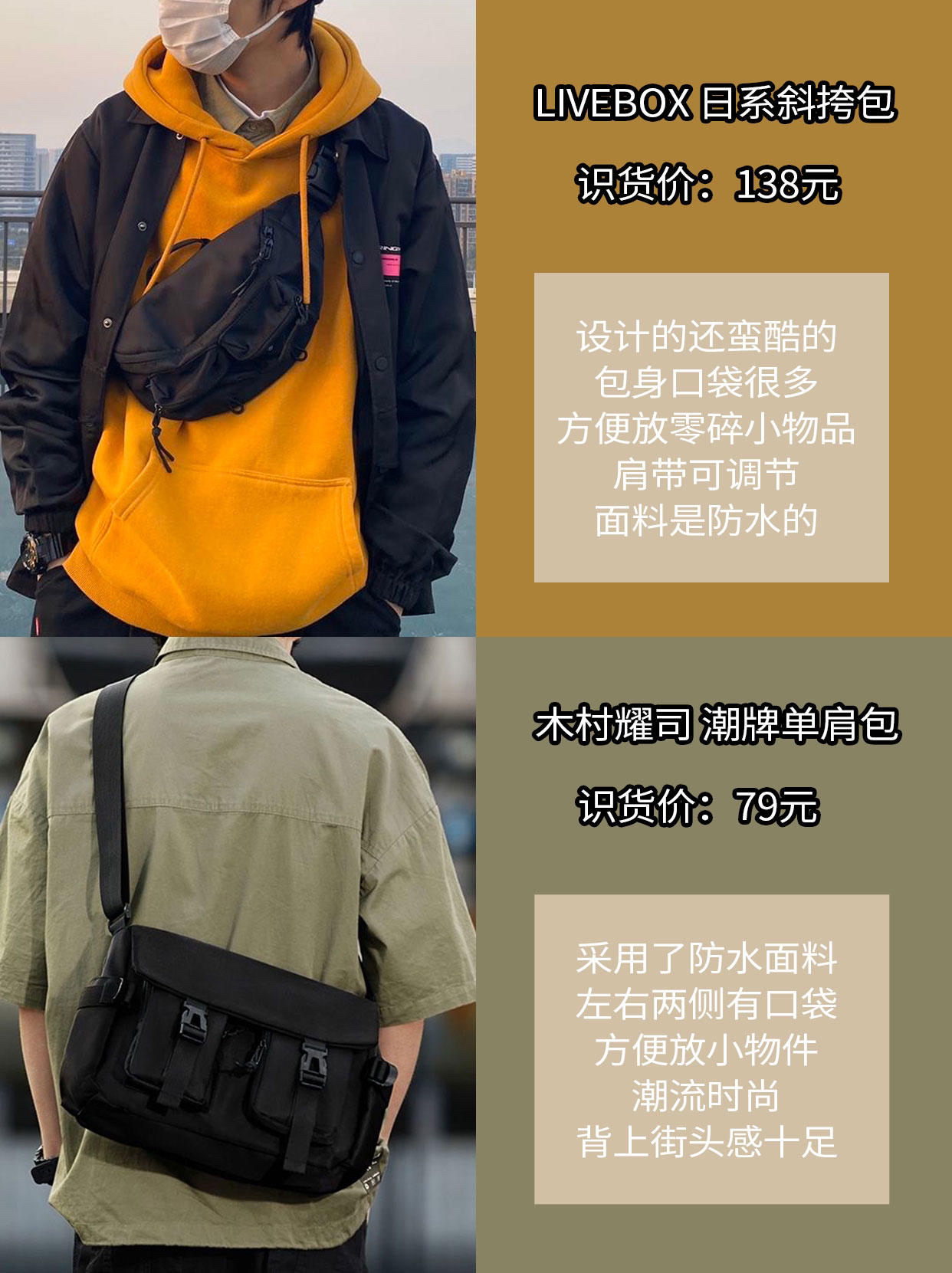 📢今天的运动背包都是非常热门的爆款单品,大品牌,品质有保障,而且活动价真的不要太划算,赶紧入手,不吃亏! LIVEBOX EN DIRECT 日系斜挎包男潮牌背包单肩包百搭包包胸包腰包 S-195 💰识货价格:138元 👓包包设计的还蛮酷的,包身⬆️口袋很多,方便放零碎小物品,肩带可调节,面料是防水的,很贴心。(图片来自博主@LewTOH) 木村耀司 小众潮牌男士单肩包斜挎包 B056 💰...