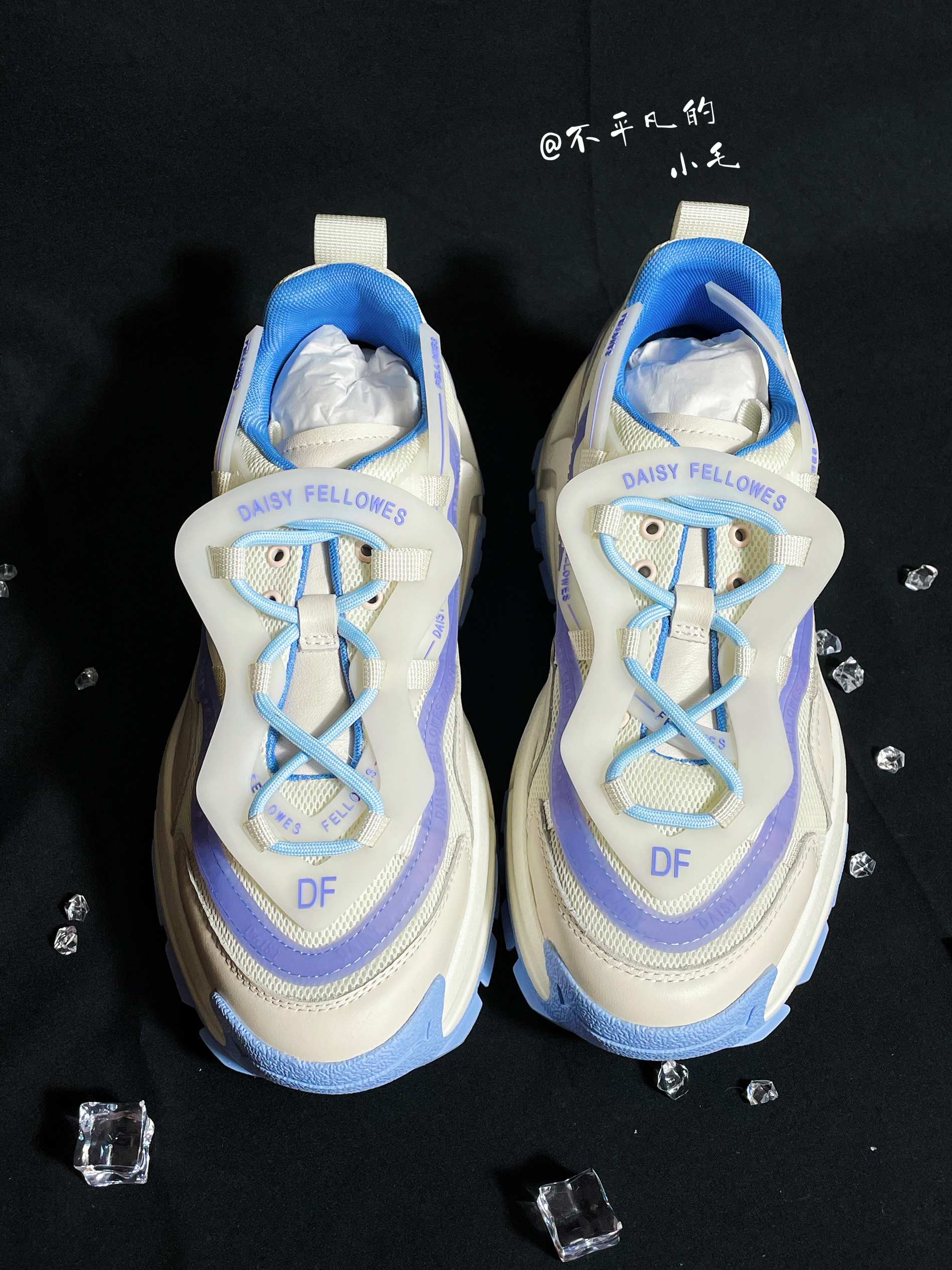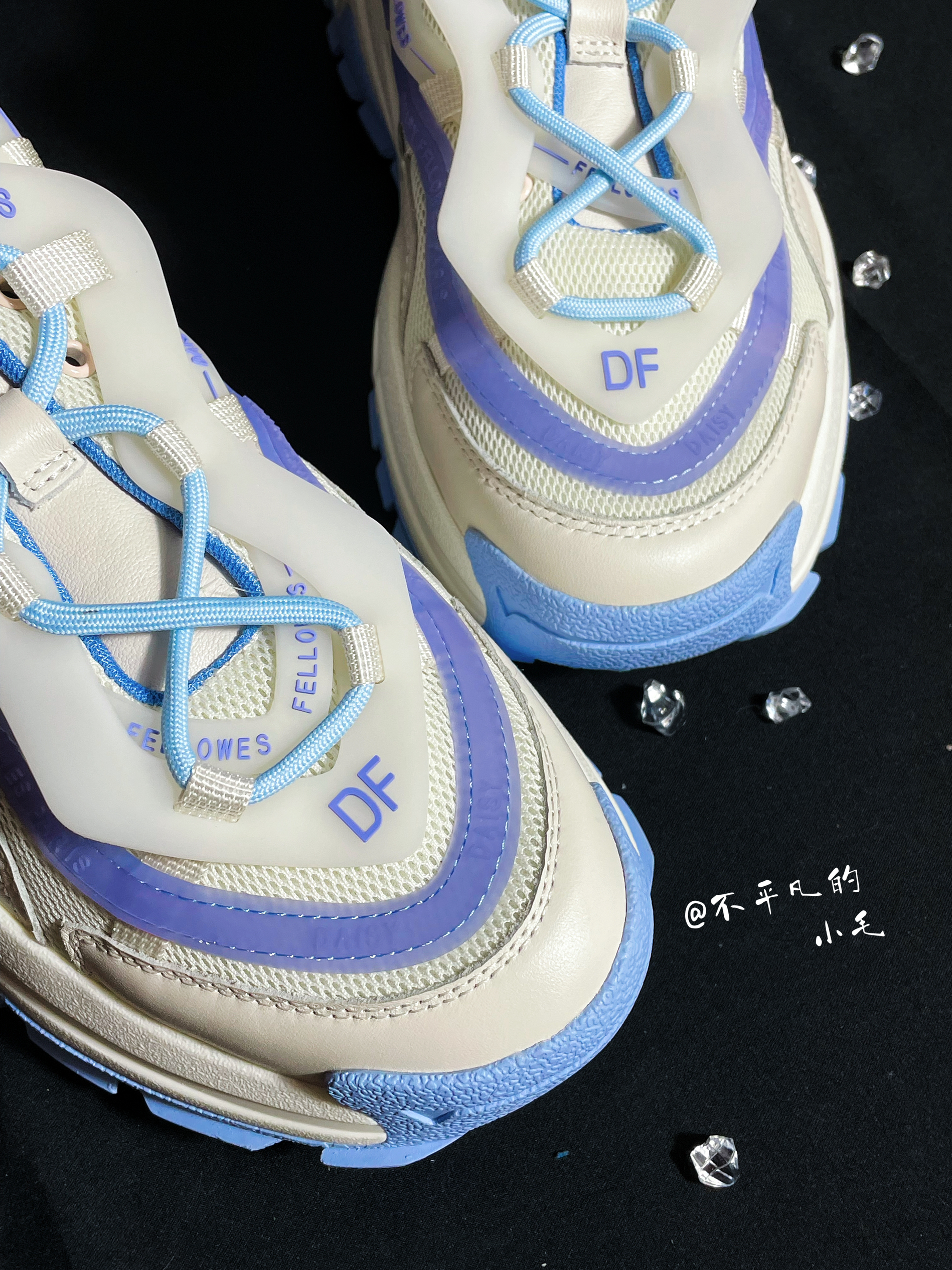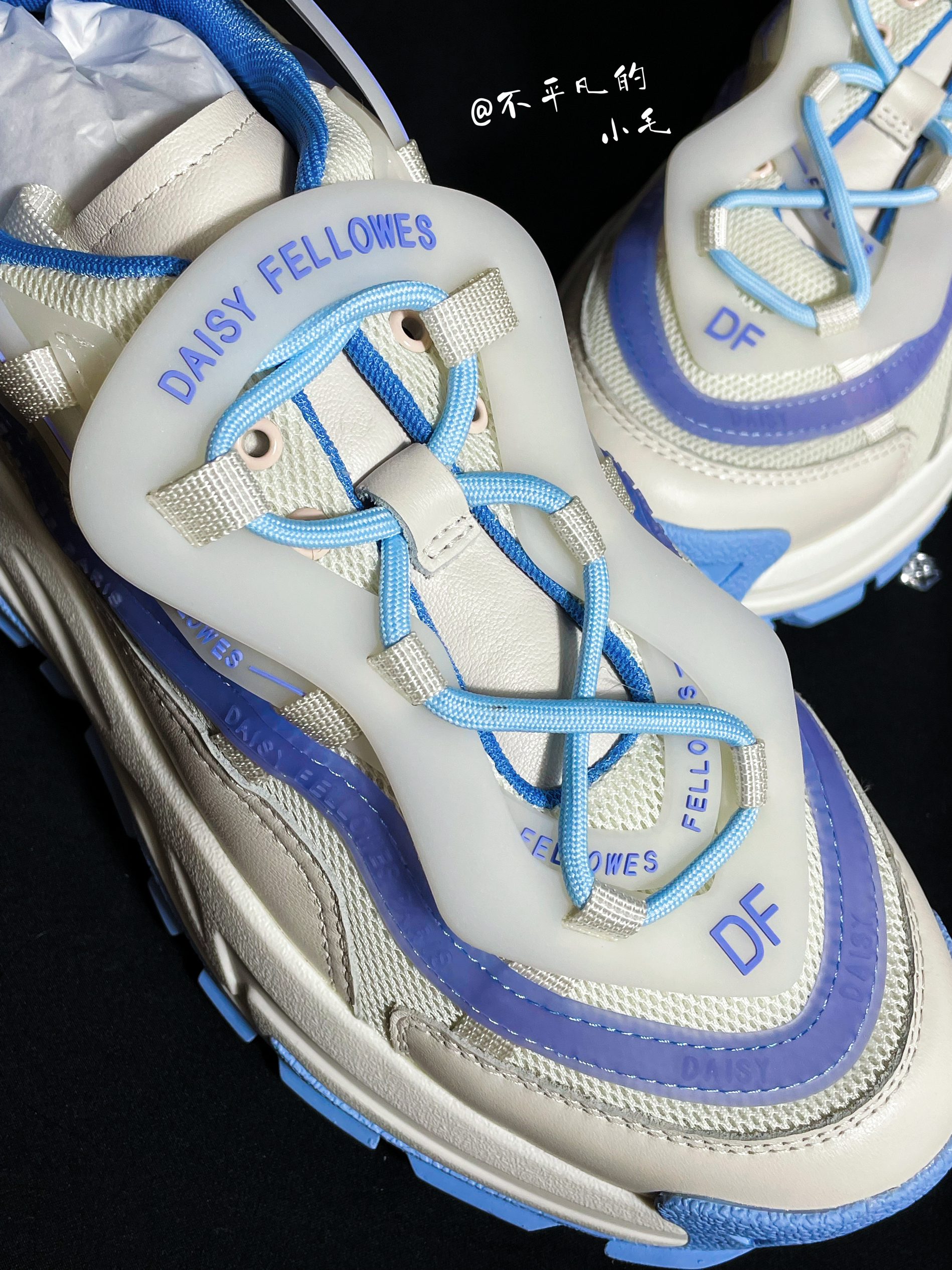 👟名称:Daisy Fellowes黛西法罗魔鬼一号潮流运动休闲百搭DF老爹鞋男女同款白蓝 💧这双白蓝紫配色也太适合夏季了,炎热的夏季穿上这双鞋子真的是满满的治愈感。如此清爽的配色谁不愿意穿在身上呢? 💧这双鞋子整体以白色为主色,加入了蓝色进行点缀,鞋面的材质采用了织物材质加上皮革材质的加持,显得格外立挺。视觉感十足。非常的有层次。鞋底增高设计真的太喜欢了💕