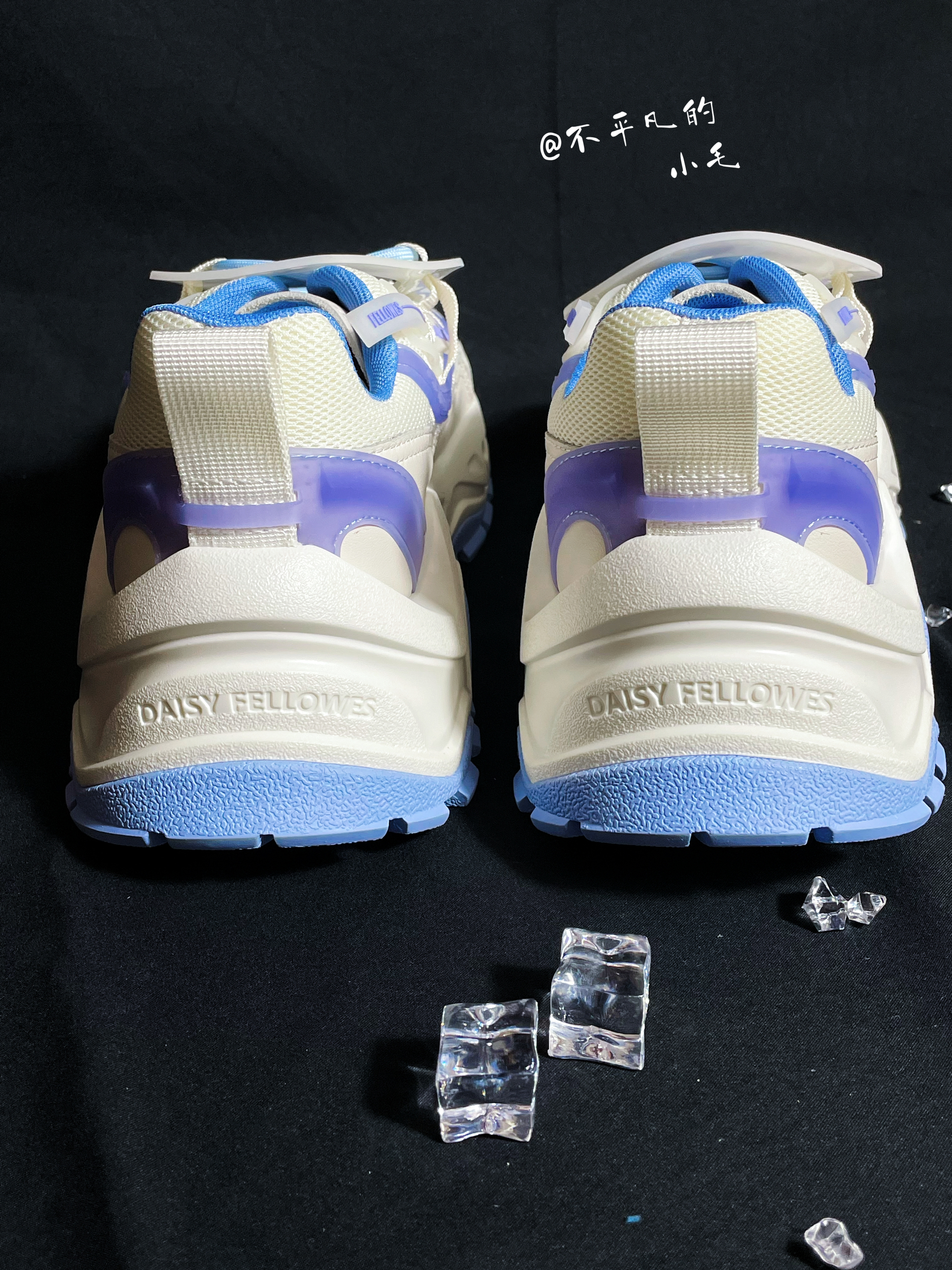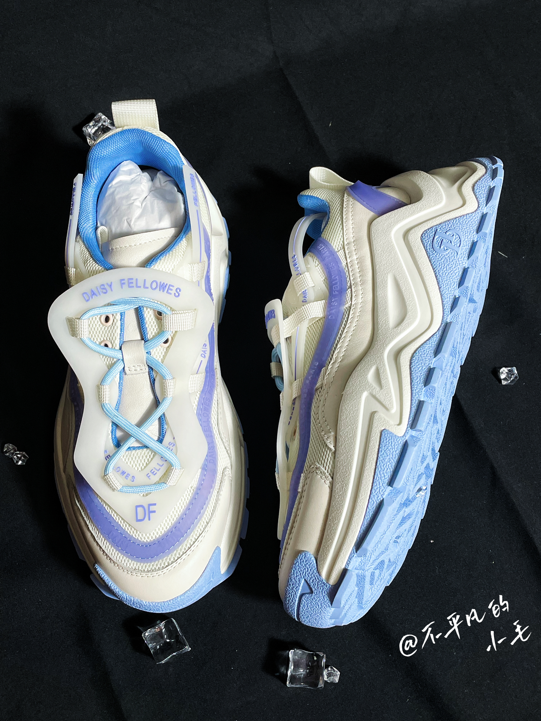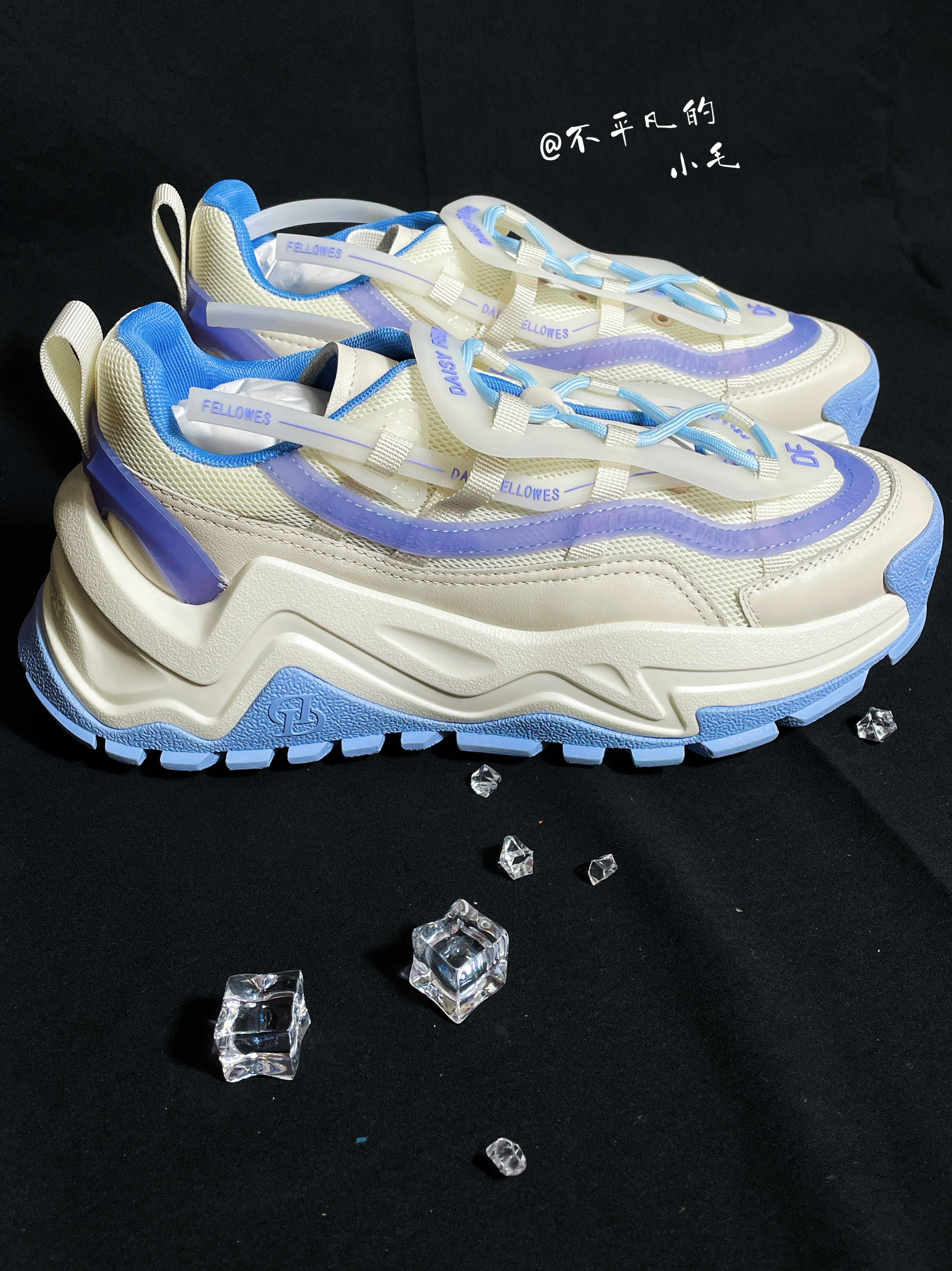 👟名称:Daisy Fellowes黛西法罗魔鬼一号潮流运动休闲百搭DF老爹鞋男女同款白蓝 💧这双白蓝紫配色也太适合夏季了,炎热的夏季穿上这双鞋子真的是满满的治愈感。如此清爽的配色谁不愿意穿在身上呢? 💧这双鞋子整体以白色为主色,加入了蓝色进行点缀,鞋面的材质采用了织物材质加上皮革材质的加持,显得格外立挺。视觉感十足。非常的有层次。鞋底增高设计真的太喜欢了💕