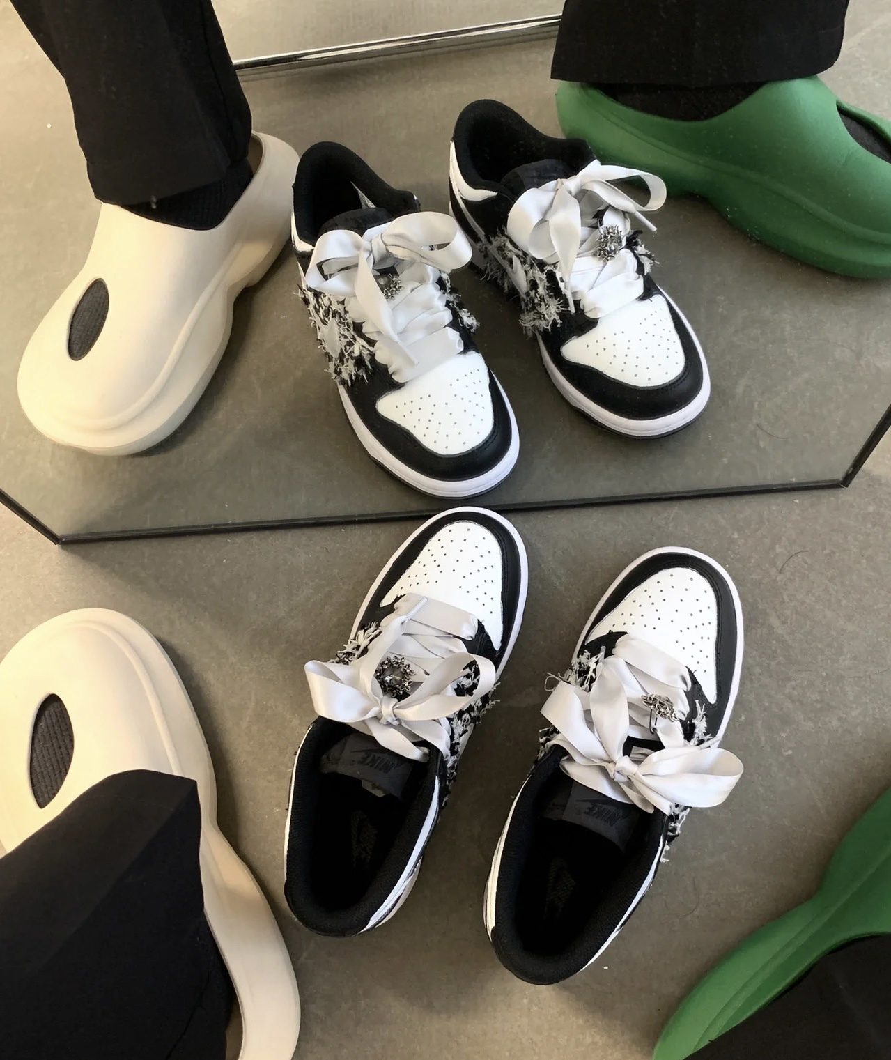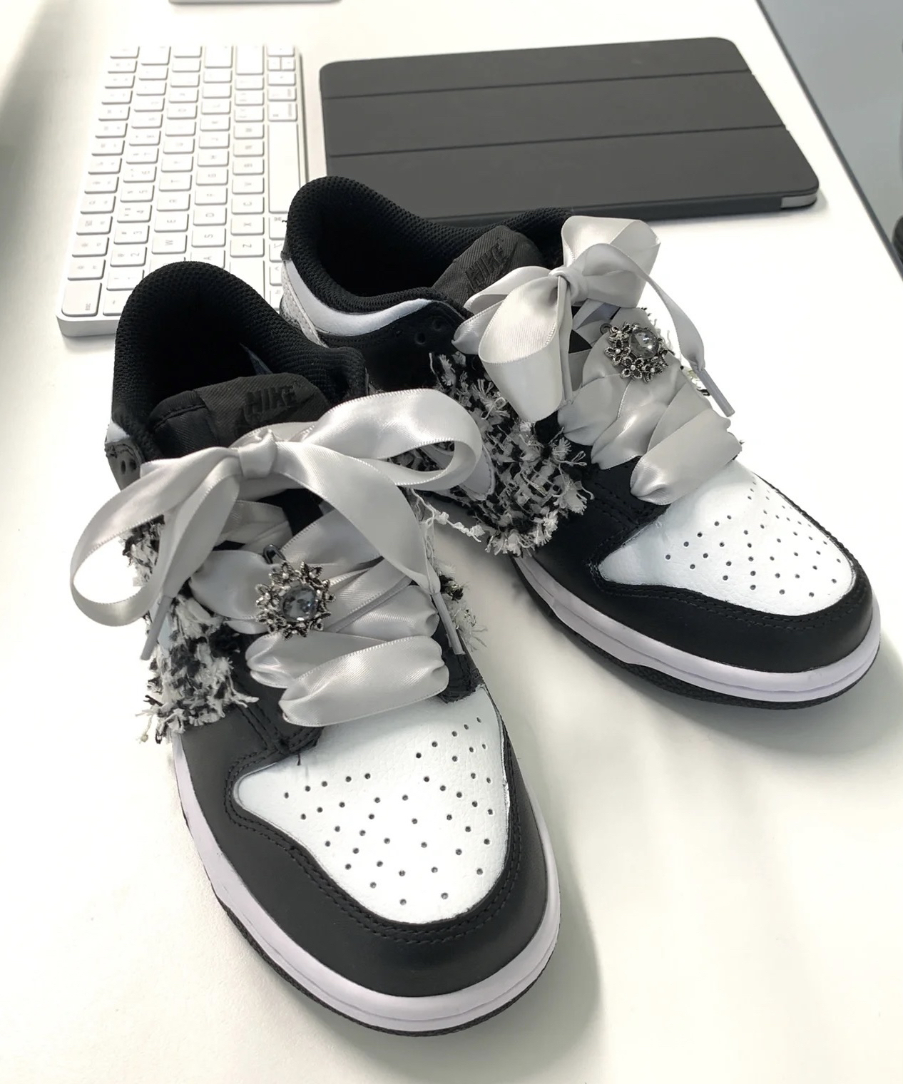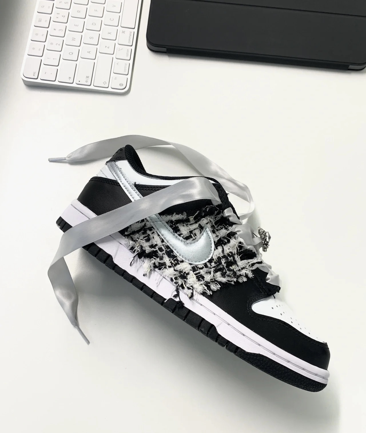 熊猫dunk的配色?配上小香风面料不会出错的黑白灰色系a!糕级的同色系丝绸鞋带√ 鞋带上的宝石也hin搭阿