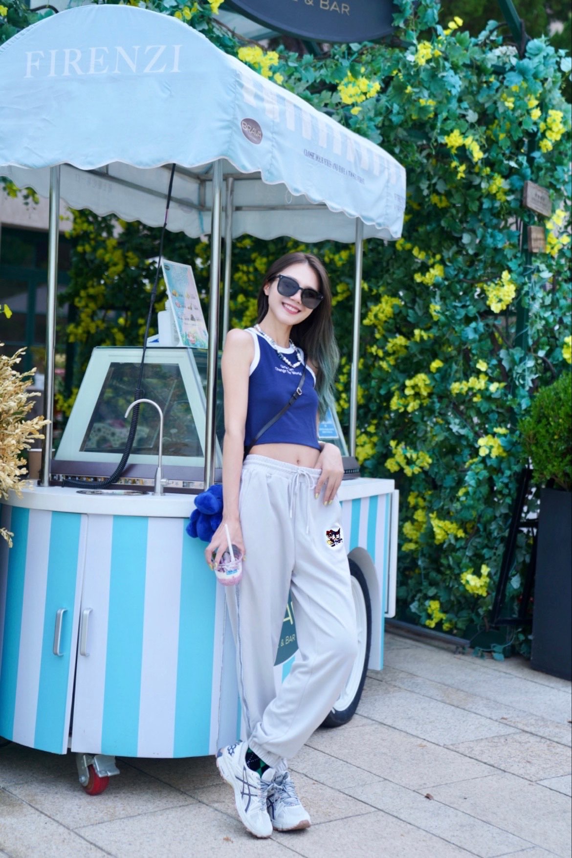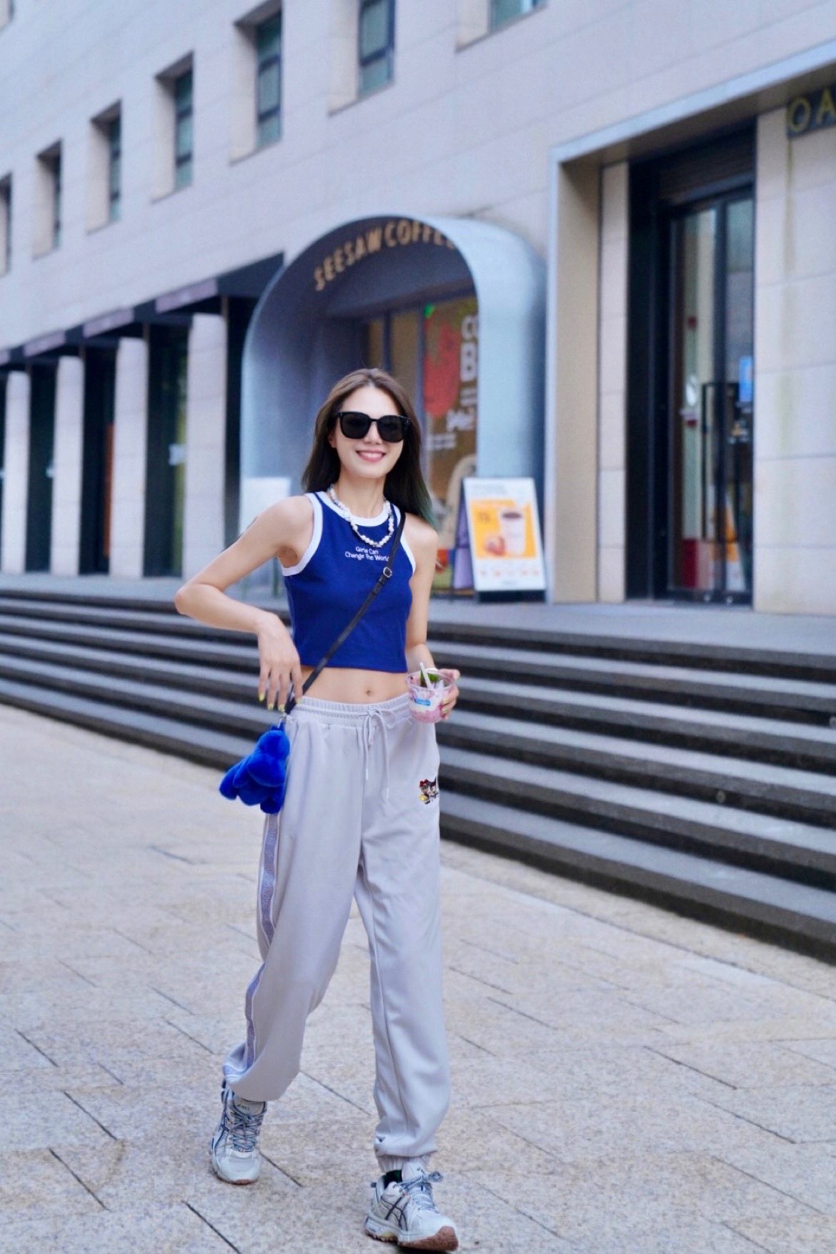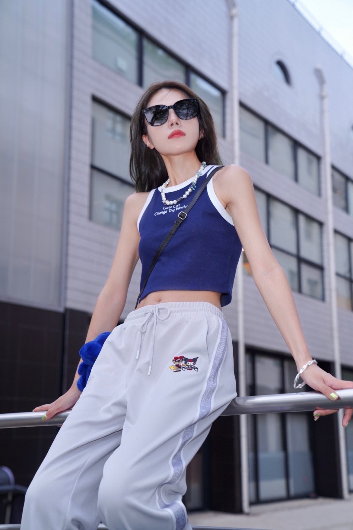 🦋𝐇𝐢 𝐇𝐢 蓝色系𝐘𝐮上线❕ 高温女战士出门当然要清爽又活力❕ 这套Look是我最近的心头爱 自带活力值❕⬆ 🦋"Girls can change the world” 蓝白背心承包了这个夏天 搭配了来自韩国的Teenie Weenie 小熊百搭运动裤 ,简直是懒人必备卫裤;三丽鸥联名款可可爱爱 灰色系很百搭,夏天穿也超清爽❕ 黑色太阳镜也是夏日必备百搭单品❕ 方圆脸表示这款暴龙墨镜真的很显...