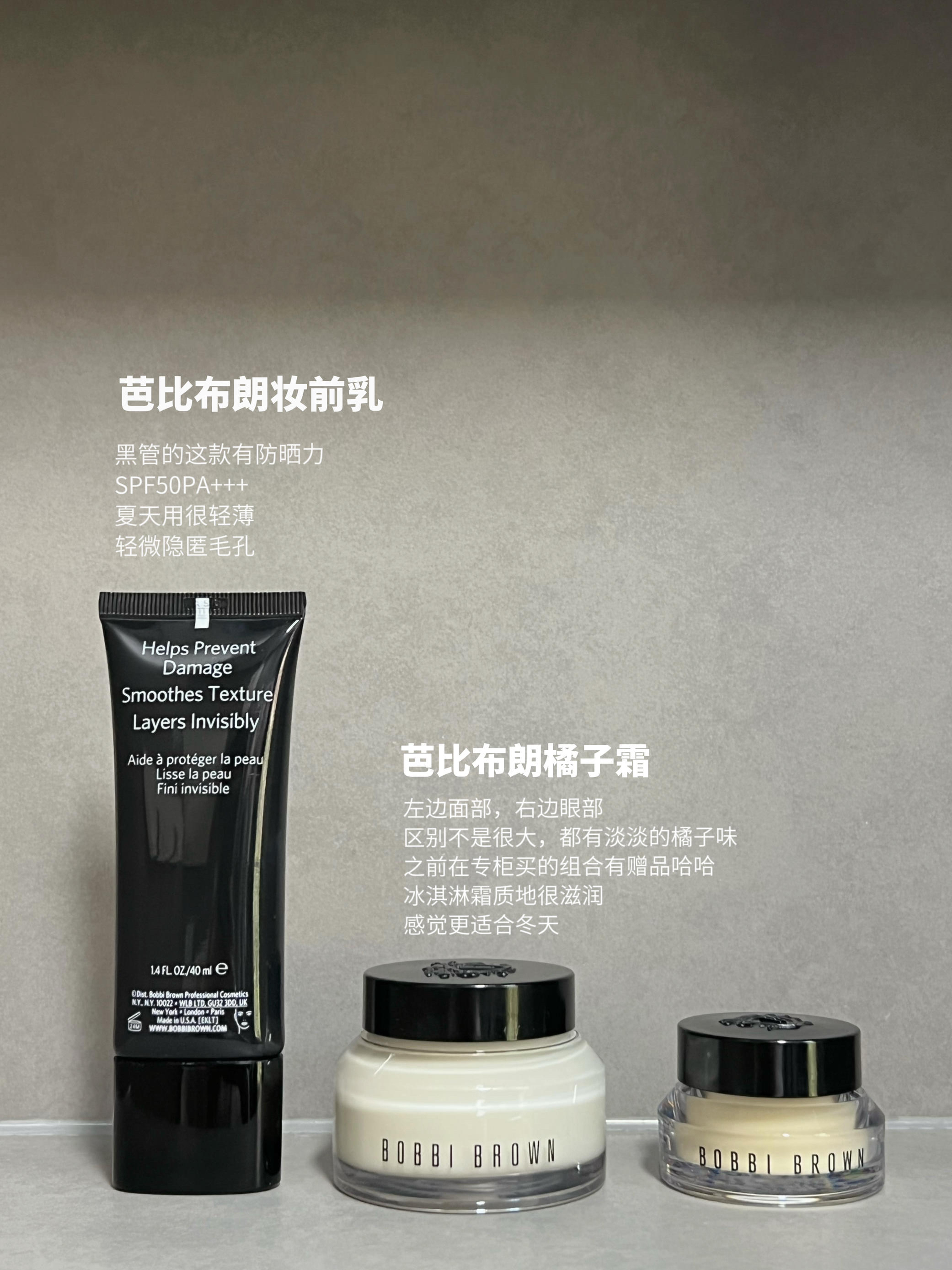 以下都是认真用过之后的自用感受,自费自测🈚️广 ☀️cpb隔离 隔离界老牌选手 确实有自然提亮的效果 可当早八素颜提亮用 无限回购的一款 ☀️芭比布朗妆前乳 黑管的这款有防晒力 SPF50PA+++ 夏天用很轻薄 轻微隐匿毛孔 ☀️芭比布朗橘子霜 左边面部,右边眼部 区别不是很大,都有淡淡的橘子味 之前在专柜买的组合有赠品哈哈 冰淇淋霜质地很滋润 感觉更适合冬天 ☀️花西子小伞黛 SPF50...