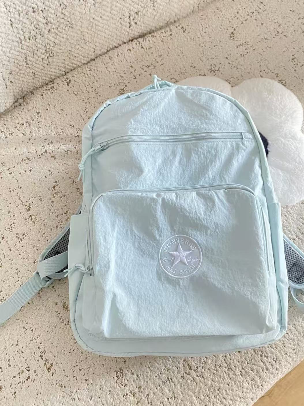 嘎嘎酷!!这个颜色是白中带着一点灰调的~ 这个料子很好洗!!爱了好吗 格子很多 很多小细节!! 后面的肩带是气垫的!很酷!!! 看腻了大标就买这款吧~ 爱死!快冲!!