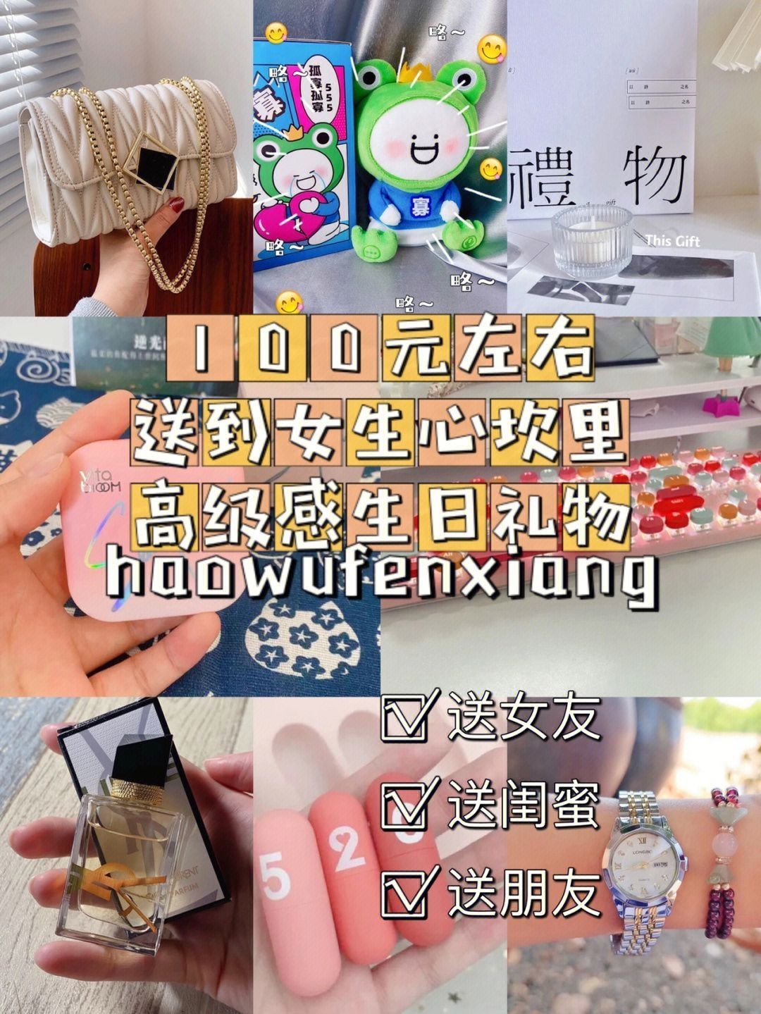 友友们,晚上很好呀!今天给大家推荐一期生日礼物,身边的朋友过生日不知道送什么,其实送礼物贵就是好,而是刚刚好,所以今天选的都是一些高颜值小众礼物。希望能给你们礼物参考。 1.玩偶🛒马克图布旗舰店💰99 2. 香薰🛒无态度商店💰10.5 3.香水🛒陈诺美妆💰72 4.手表🛒正品瑞士手表旗舰店💰166 5.包包🛒媚魅包装💰32.8 6.香膏🛒VitaBloom旗舰店💰79 7.口红🛒韩格旗舰店💰39....