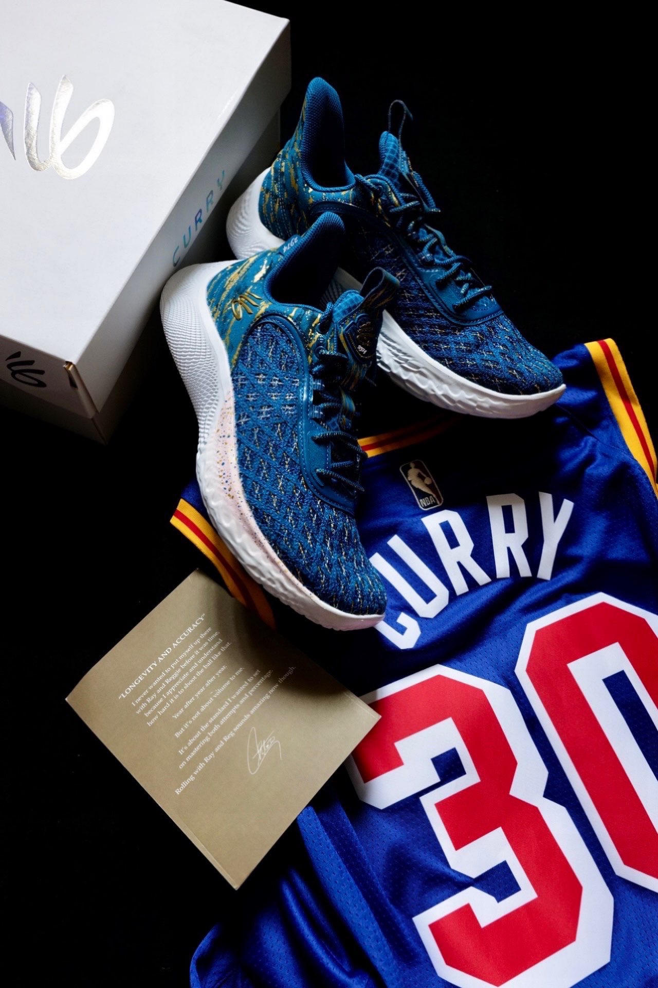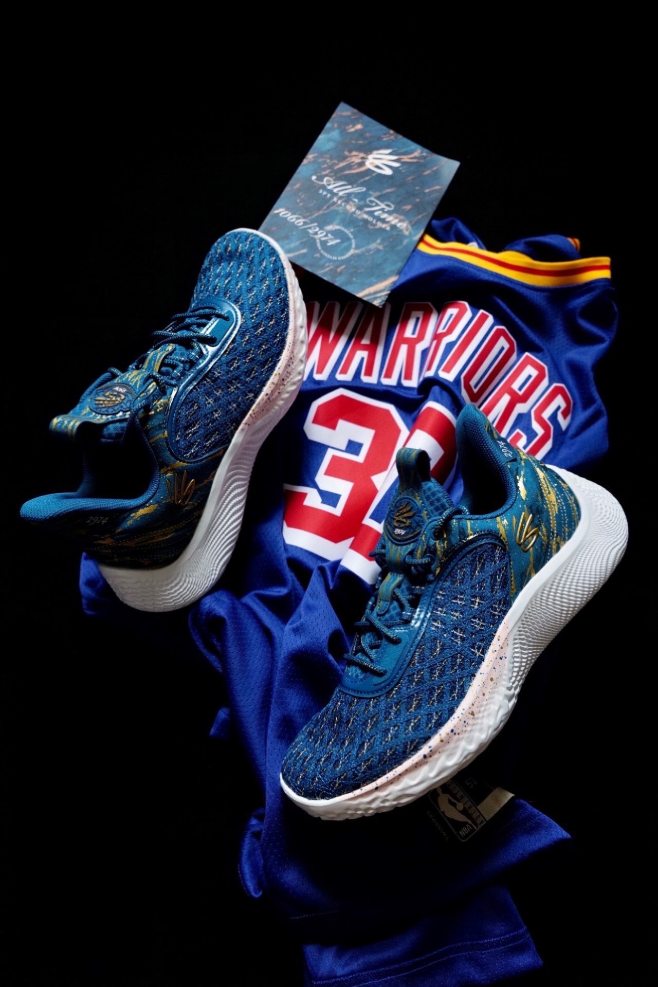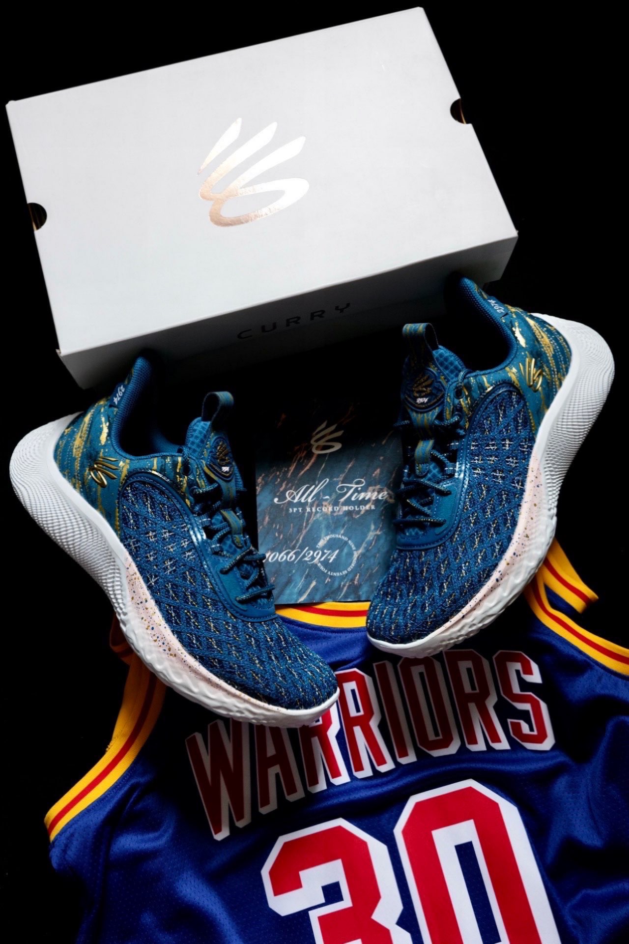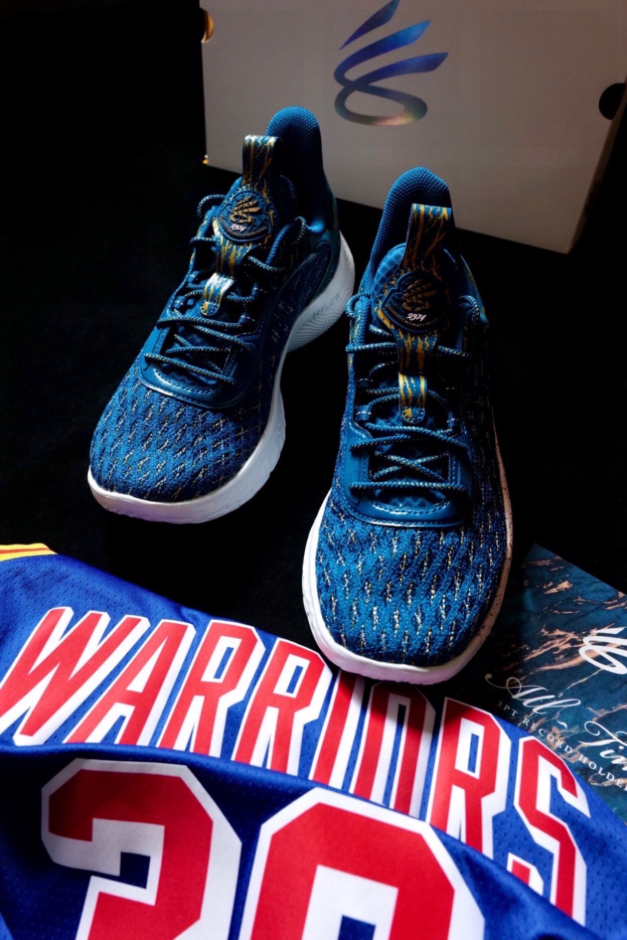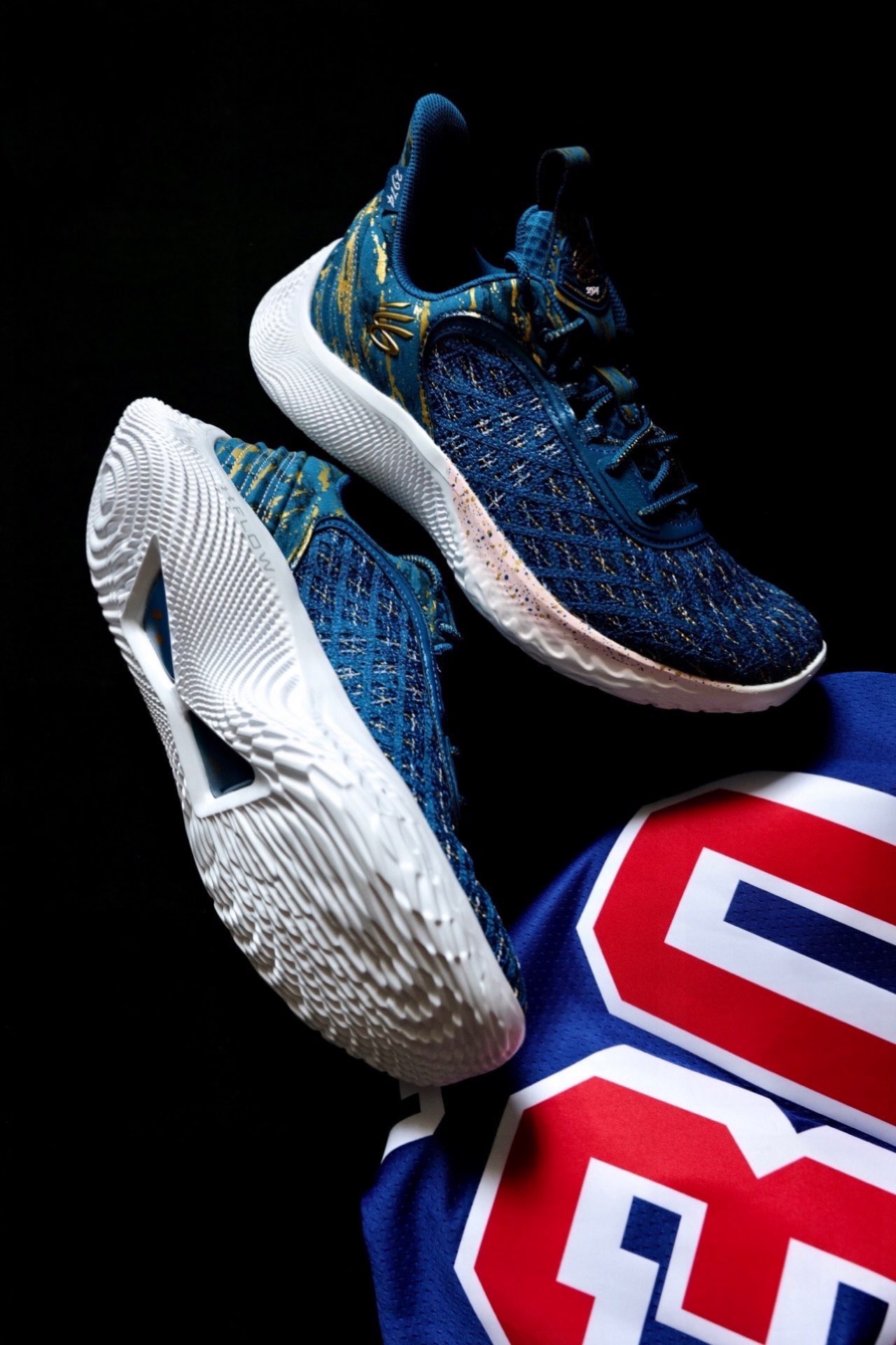 这双球鞋的配色在目前来说绝对是特别有纪念意义的。这双Curry Flow 9三分王配色在去年12月15日,勇士对阵尼克斯的比赛中,库里命中个人生涯第2974个三分球,成功超越雷阿伦,加冕了NBA历史三分王。 这双鞋采用蓝色为主色,鞋面前半部份编织网面内掺入金色织物,看起来特别奢华。后半部分则是翻毛皮材质,同样也点缀了金色细节。 鞋舌提环以及鞋后侧跟处也加入了2974元素,突出三分王的主题,金色...