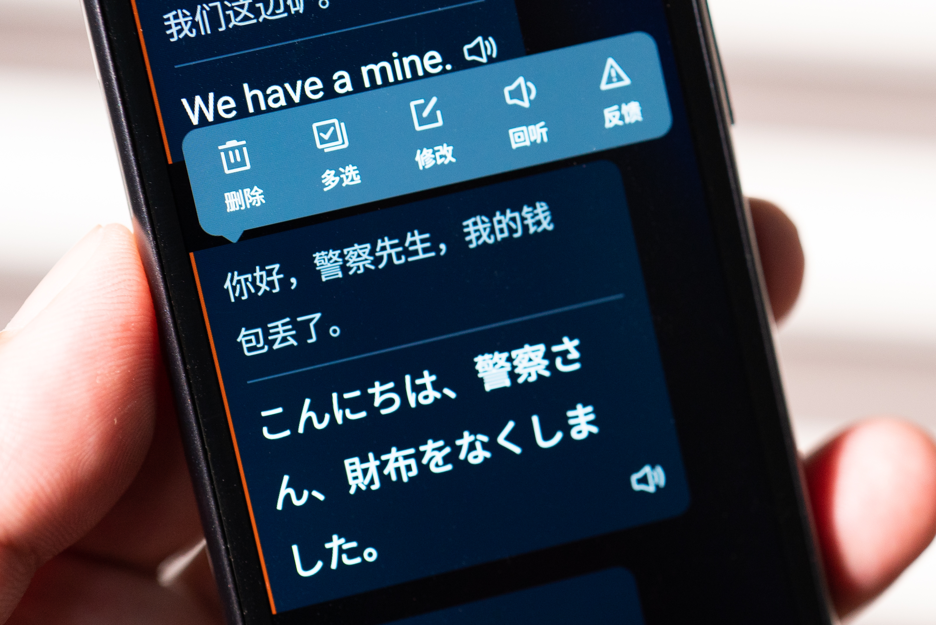 「语音翻译」讯飞翻译机4.0的语音翻译模式被设置在每次解锁屏幕后默认出现的主页面,无需进入系统点击任何图标,方便我们随时从口袋掏出机器快速翻译,减少交谈对象等待时间,翻译准备时间越少就越能化解两人面对面却又不知道对方在说什么的尴尬。从语音采集到实时转化成文字,再将文字翻译成指定语种并播放出语音的速度,基本全程都是实时进行几乎感觉不到延迟,也就是说在你说完话后对方可以直接听到翻译后的语音。实测下来识别准确率和翻译速度甚至可以用惊人来形容。