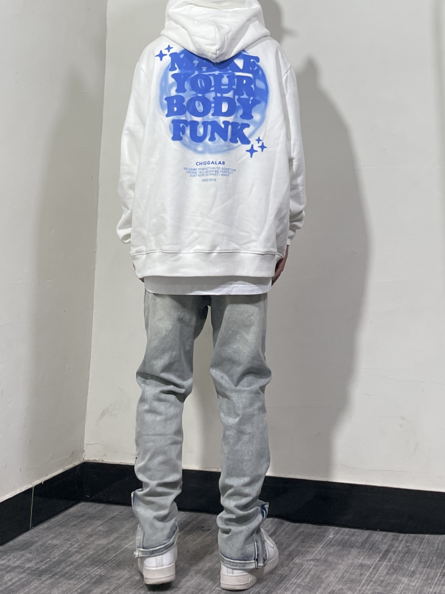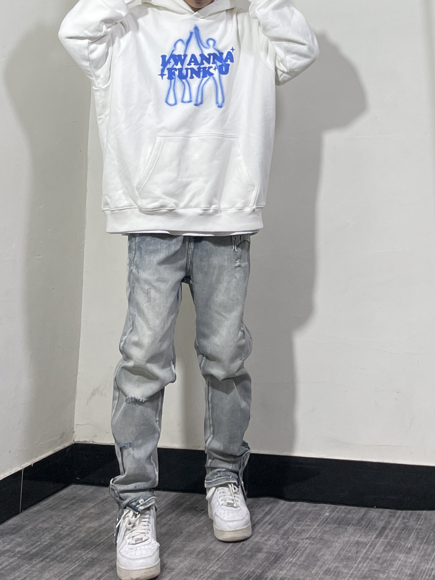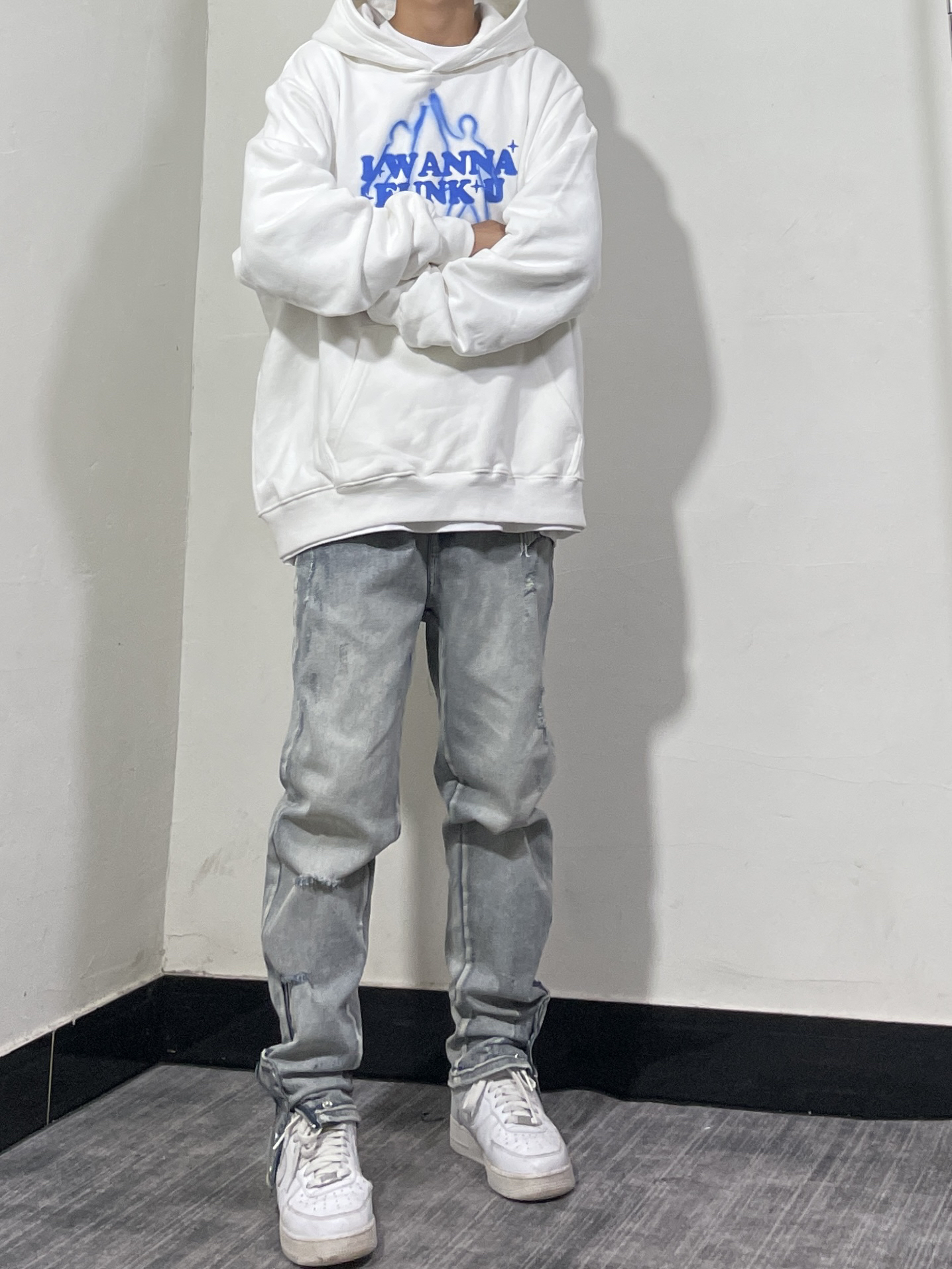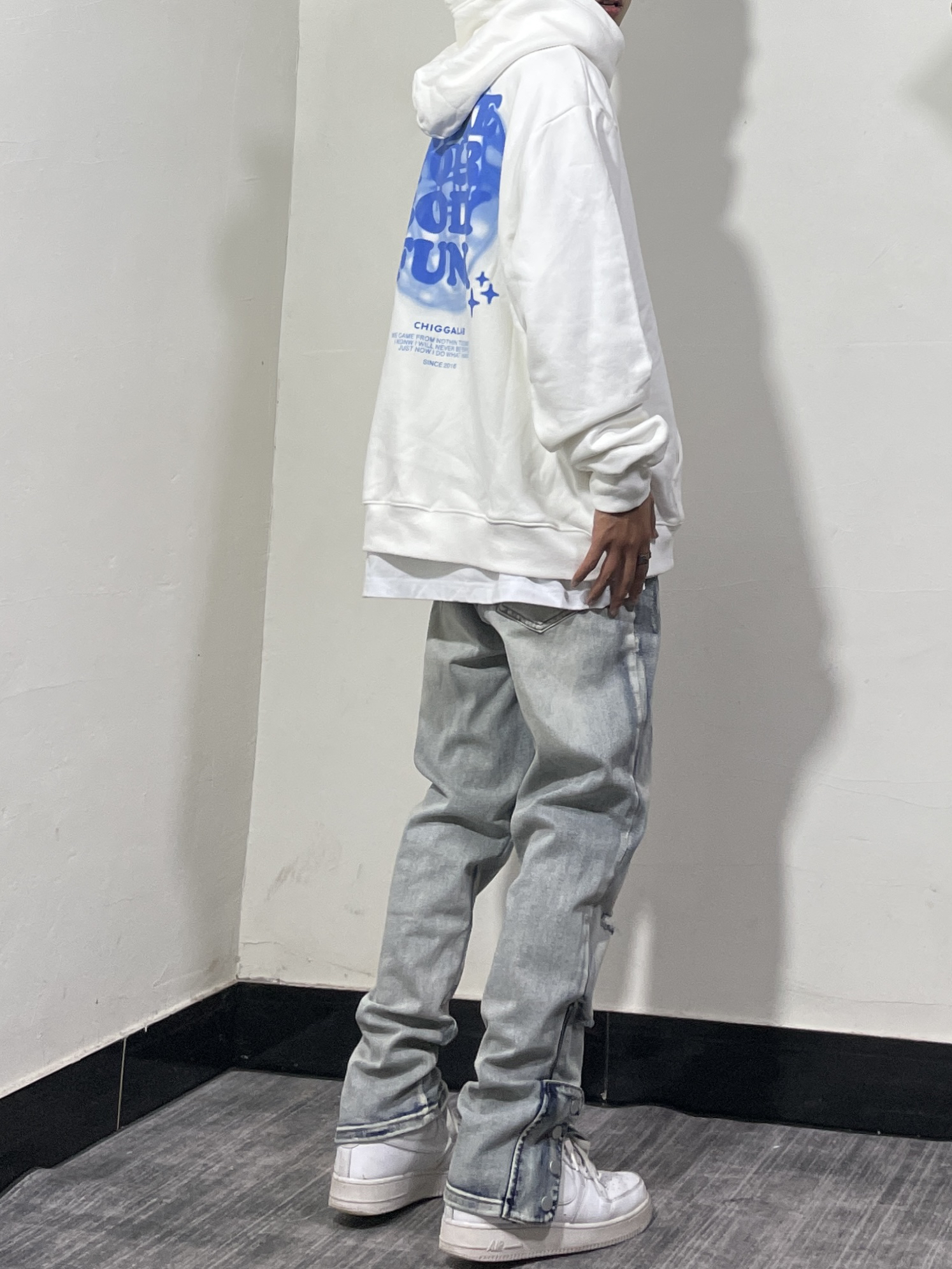👔 白蓝配色真的太戳我了!一直以来很少尝试白色卫衣,这件直戳我心!整体白色搭配蓝色印花,太青春了!整体宽松版型,面料厚实硬挺!推荐! 👖 一条可调节裤脚的微喇牛仔裤!上身过多次了,微弹面料上身舒适,偏修身的版型很显腿细腿长!裤脚处的可调节按扣,随意调节裤脚宽松度。 👟 纯白AF1最百搭没人不同意吧。 衣服/CHIGGALAB 黄鬼 裤子/Rocawear 鞋子/AF1