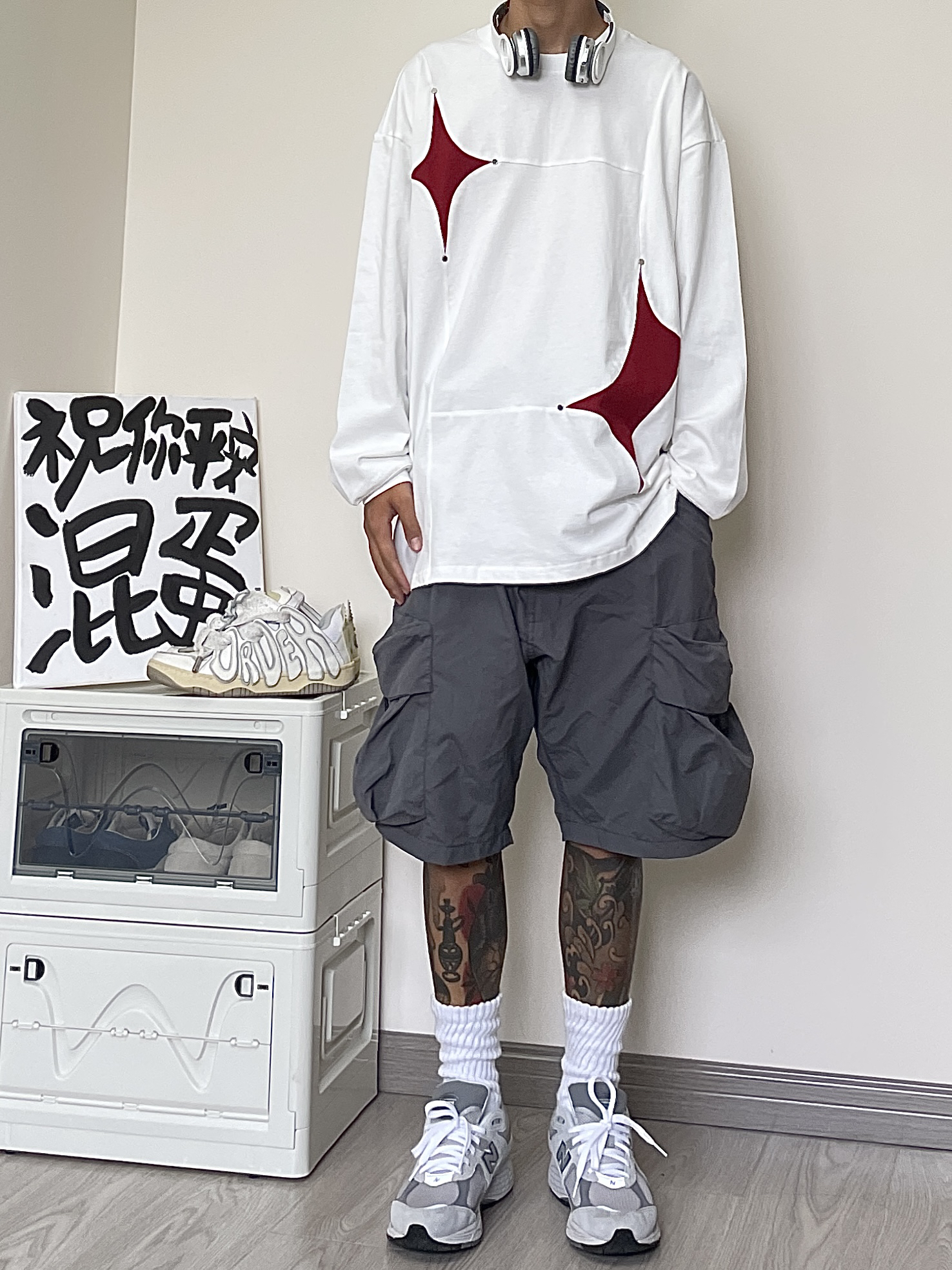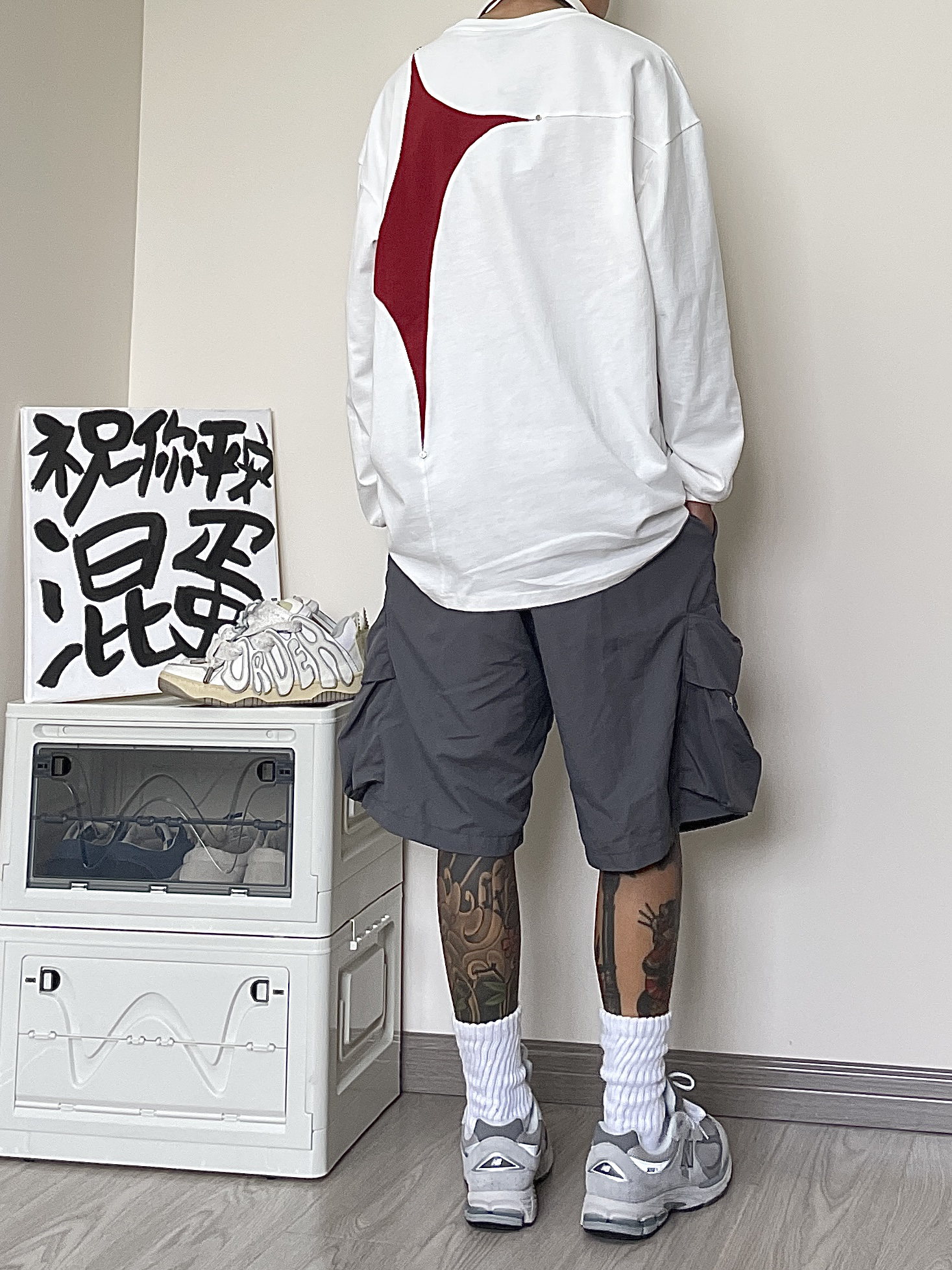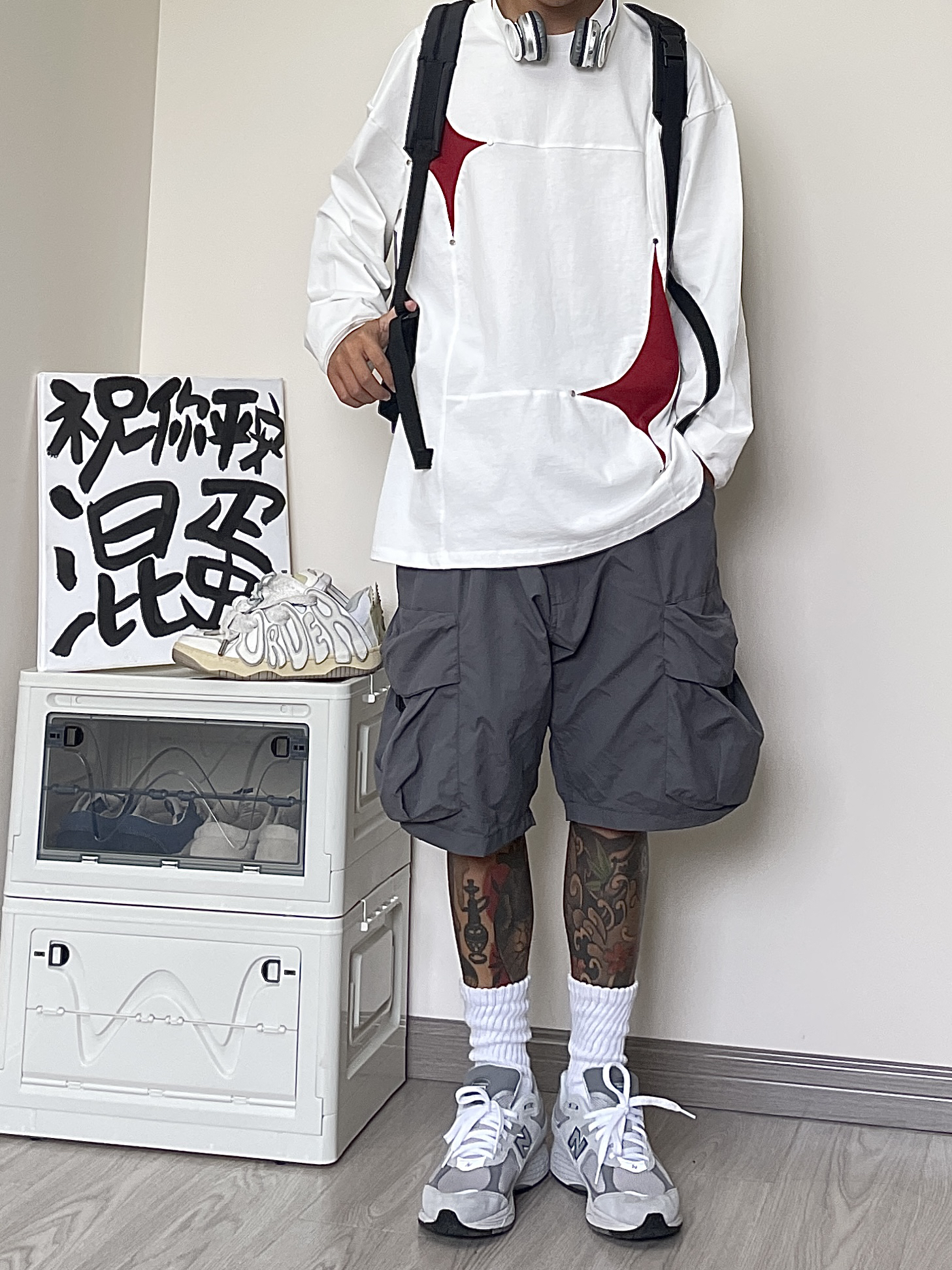 喜欢各种长袖配短裤 👔 今天上衣穿了一件拼色长袖,白色底色拼接了一些红色色块,喜欢这种在基础款上做的一些设计。搭配也比较简单,长裤短裤都能hold住。 🩳 裤子搭了一条灰色多袋短裤,超宽松的版型和多袋设计都很棒。 👟 新入的NB2002R,喜欢NB的不能错过!