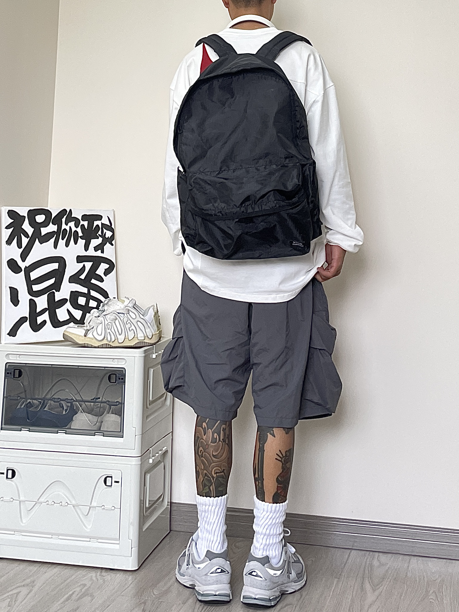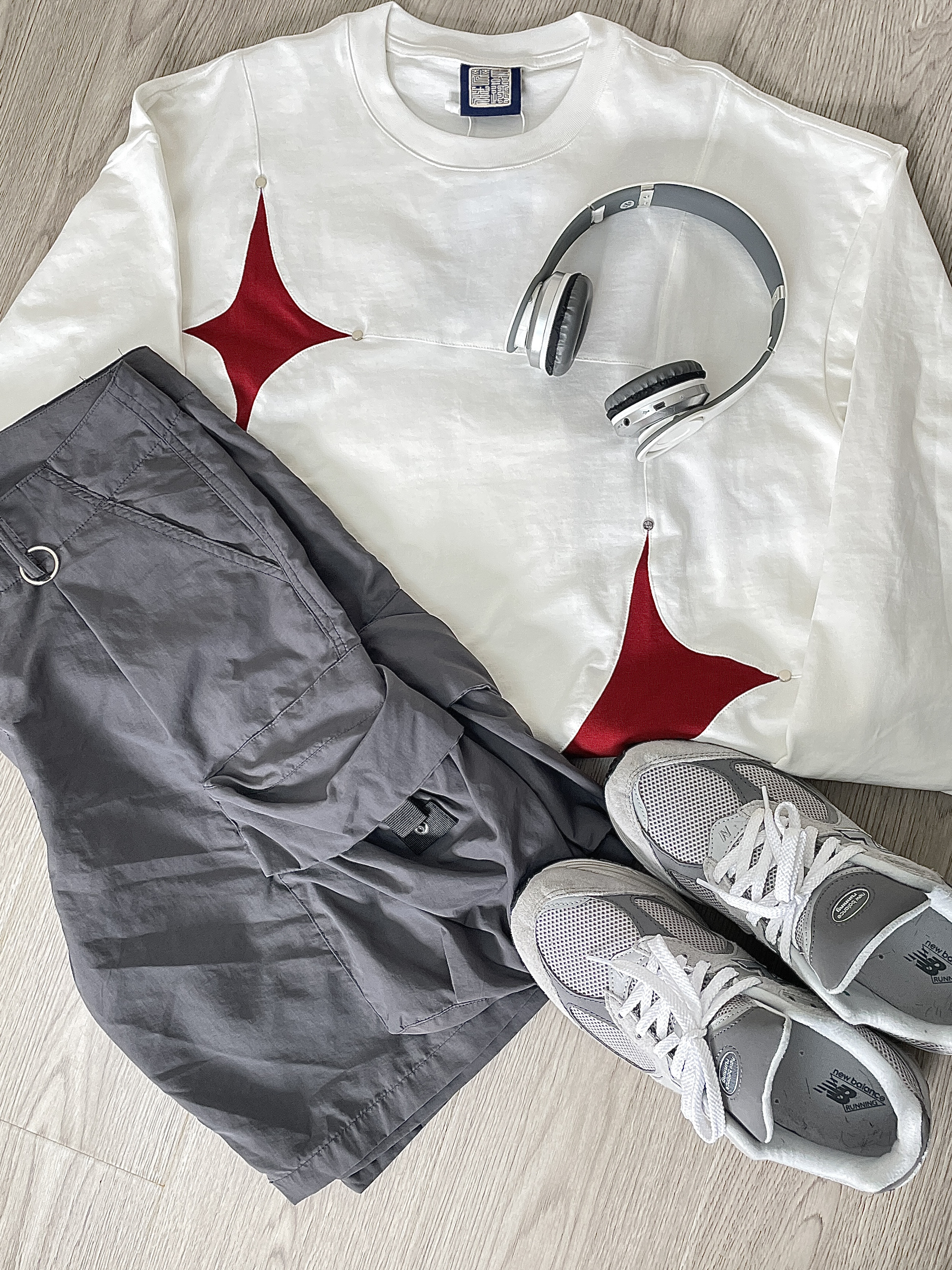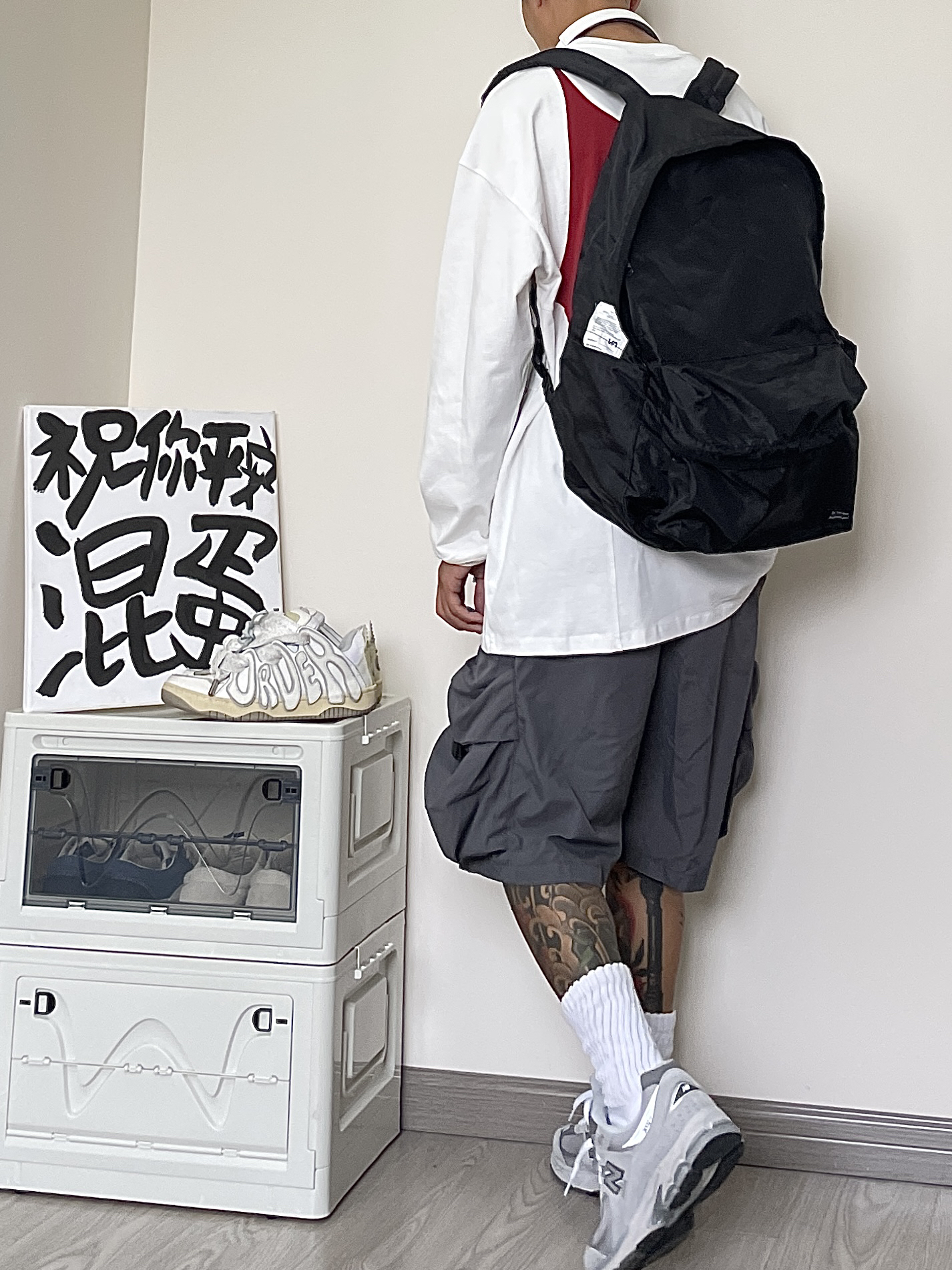 喜欢各种长袖配短裤 👔 今天上衣穿了一件拼色长袖,白色底色拼接了一些红色色块,喜欢这种在基础款上做的一些设计。搭配也比较简单,长裤短裤都能hold住。 🩳 裤子搭了一条灰色多袋短裤,超宽松的版型和多袋设计都很棒。 👟 新入的NB2002R,喜欢NB的不能错过!
