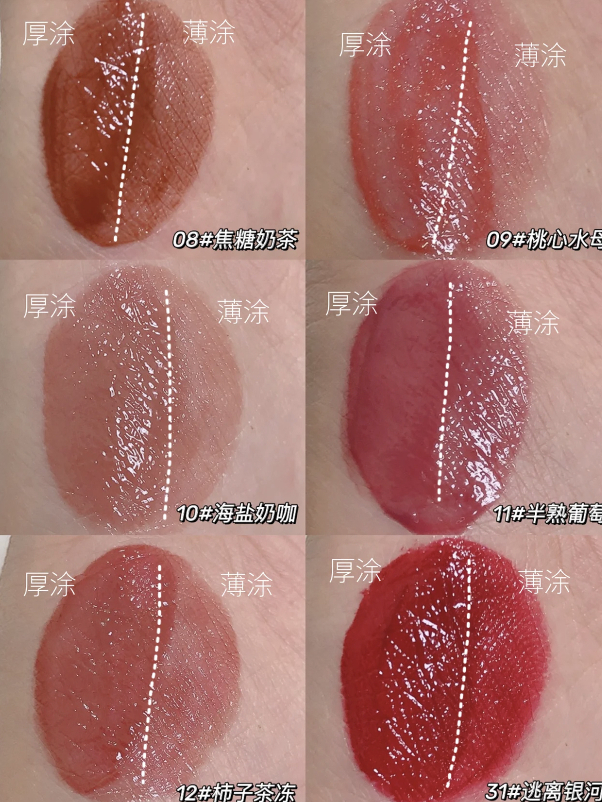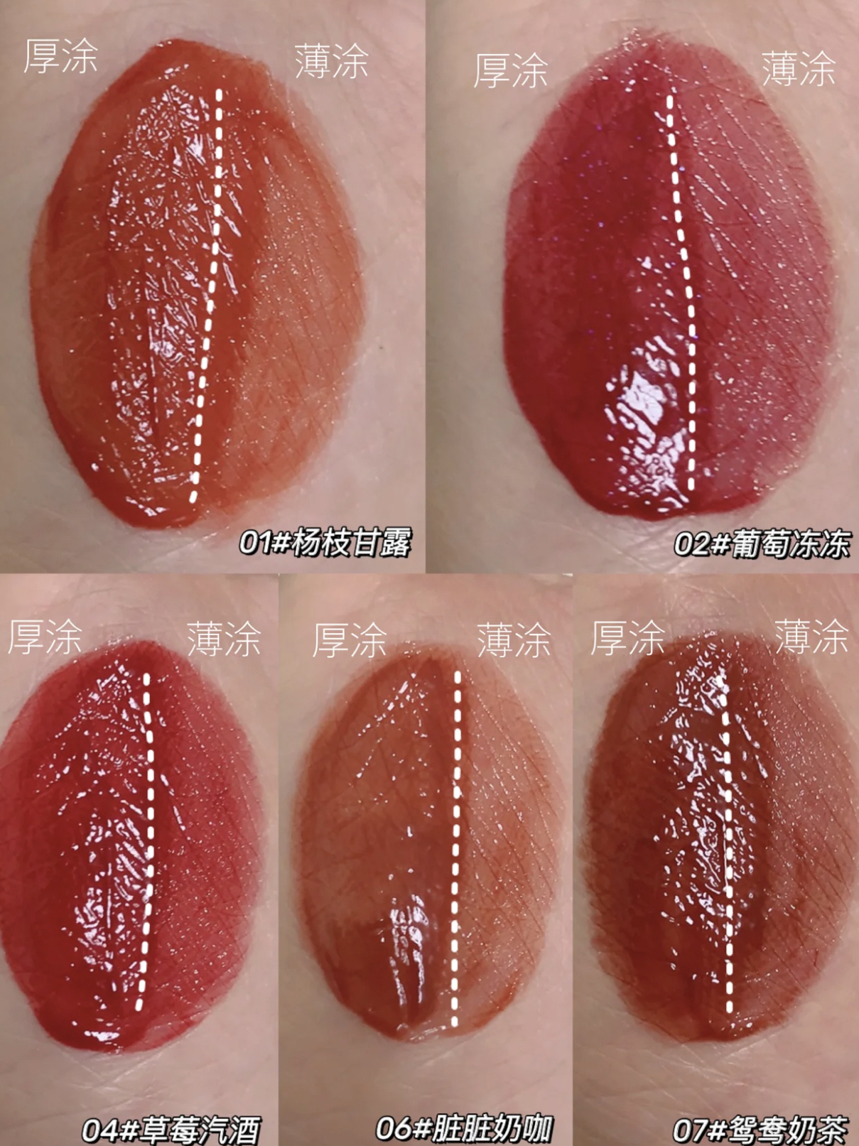 说实在这系列的镜面唇釉❤️ 手上和唇.上试色会有一定差距 因为受唇色影响会比较大❤️ 这款适合深唇叠图,浅唇单涂 色号要选准,不然一不小心hin显老 01#杨枝甘露:还行,偏橘色的,显活力❤️ 02#葡萄冻冻:不错,但只适合浅唇白皮,深唇显老04#草莓汽酒:水红色,带妆才好看 06#脏脏奶咖:一定要浅唇白皮,不然有点没气色07#鸳鸯奶茶:白皮带妆,不能素颜❤️ 08#焦糖奶茶:素颜...