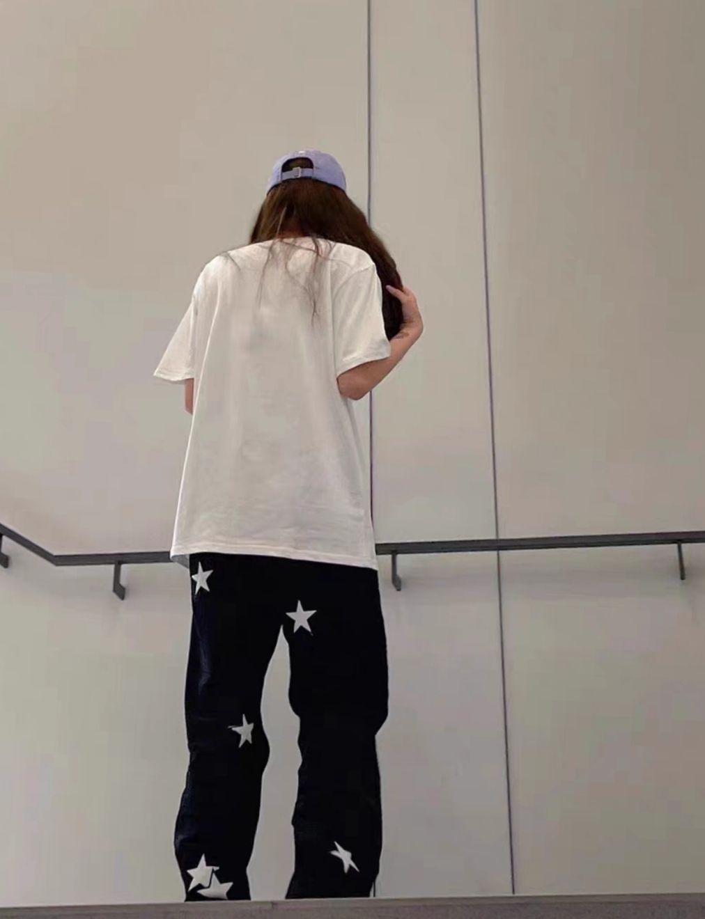 快来江汉路拍照了姐妹们,这家奶茶店真的超出片的,当然了,今天的穿搭我也很满意,因为宽松又显高 季节:夏季/秋季 关于这个裤子的秋季搭配我还没想好,以后再出吧,先说一下夏季穿搭 穿搭指南:Teddyisland五角星牛仔裤➕白t➕紫色帽子➕aj3
