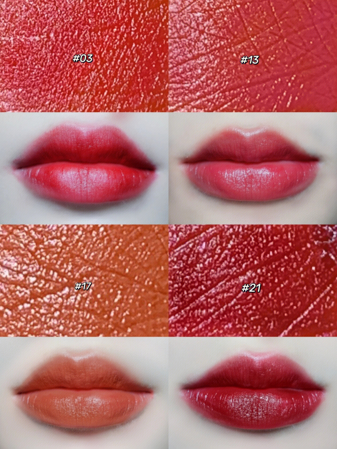 这次选了四只哑光唇釉来呀 一直都给大家试了果汁唇釉! 今天我就带了我心水4支哑光唇釉 不管素颜和化妆都可以使用的吼~❤️ 03 这支是我心目中的女团色哦 涂上去我感觉我都可以去打歌了哈哈哈 14 这只上嘴是炒鸡显白的草莓红哦 而且炒鸡百搭的💞 平时上课我会薄薄的涂上一层吼 17 这款上嘴是橘调的哦 像夏天我就喜欢这些橘色系的口红🌸 感觉会很可爱、很元气捏~ 21 这款让人惊艳的浆果色哦 感觉涂上去...